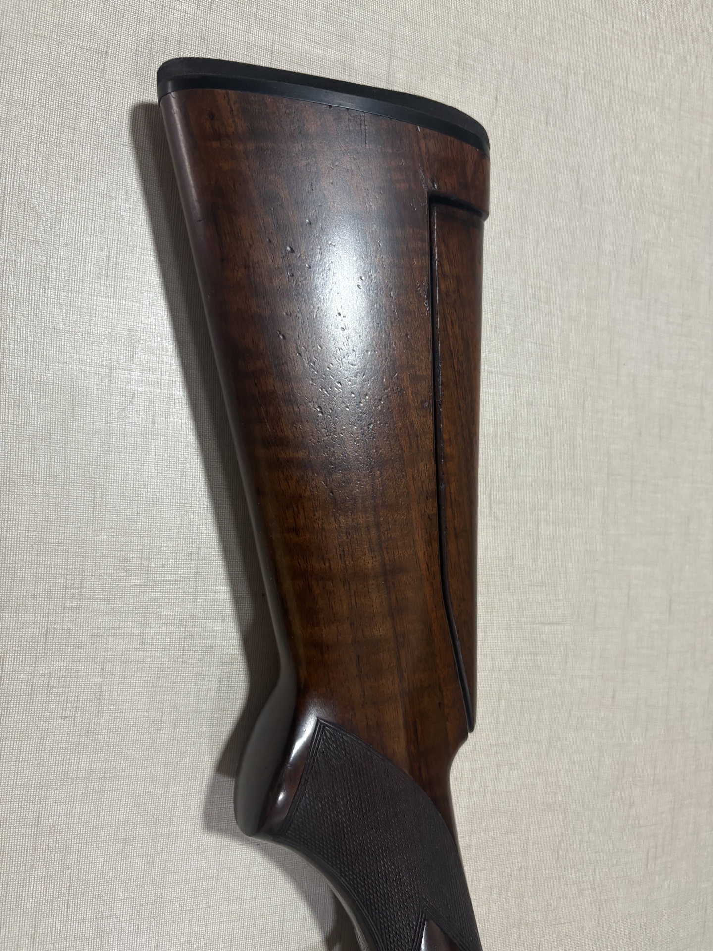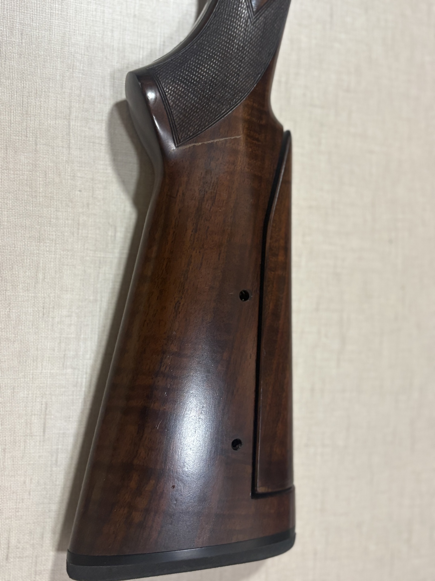 Coronha de arma de fogo em madeira escura com acabamento polido encostada numa parede clara.