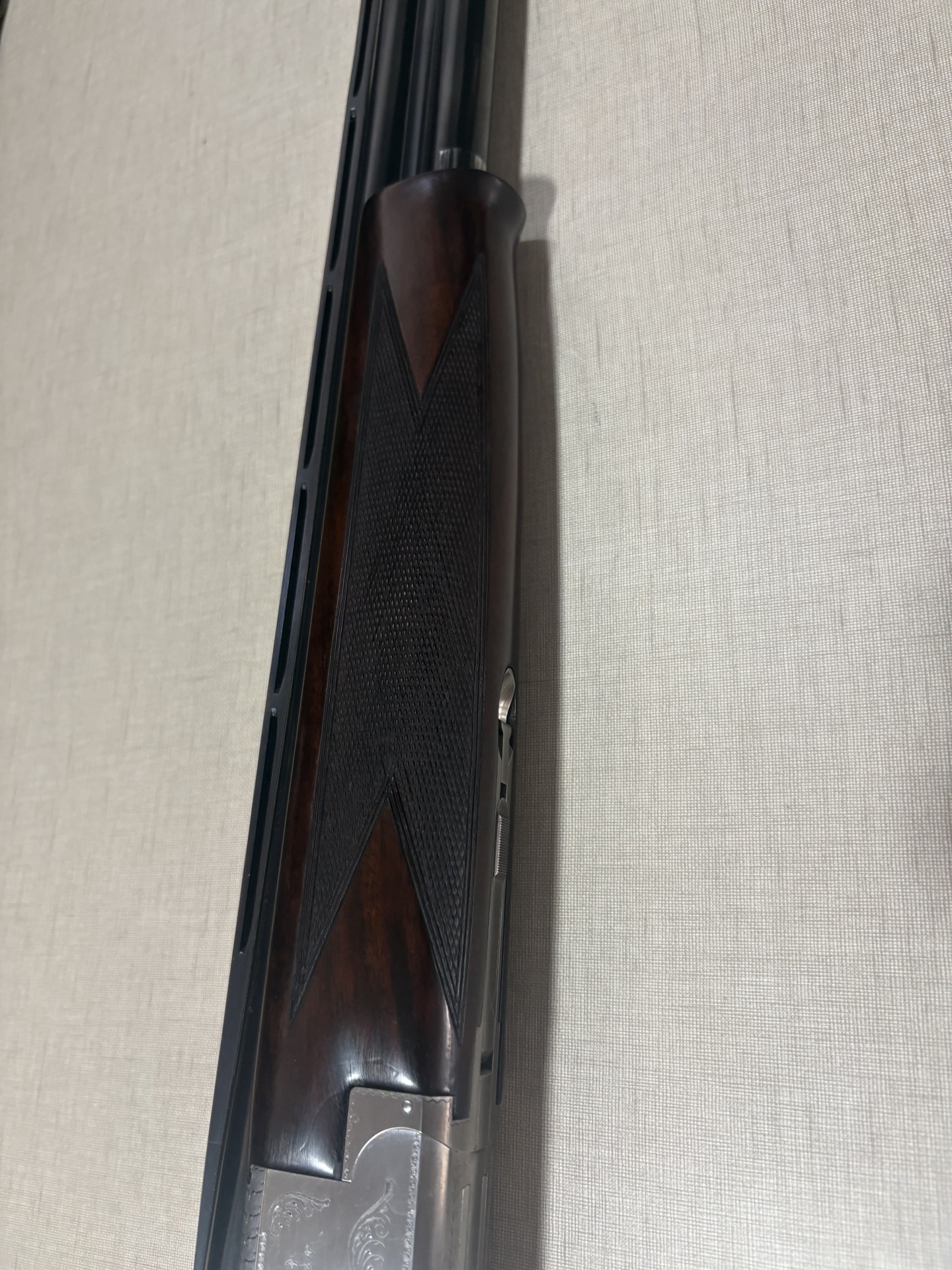 Parte de espingarda com madeira castanha e metal preto com textura triângulo