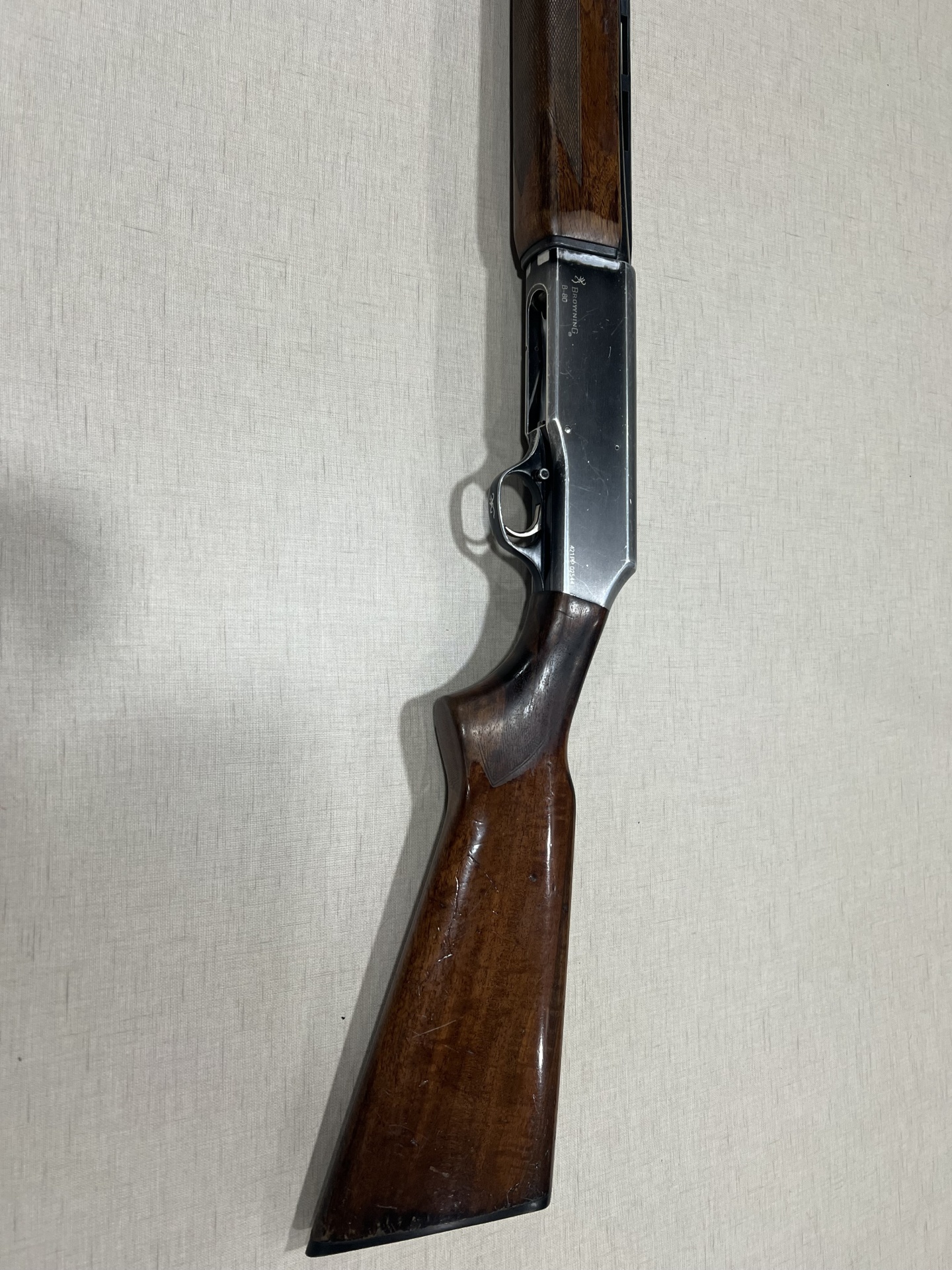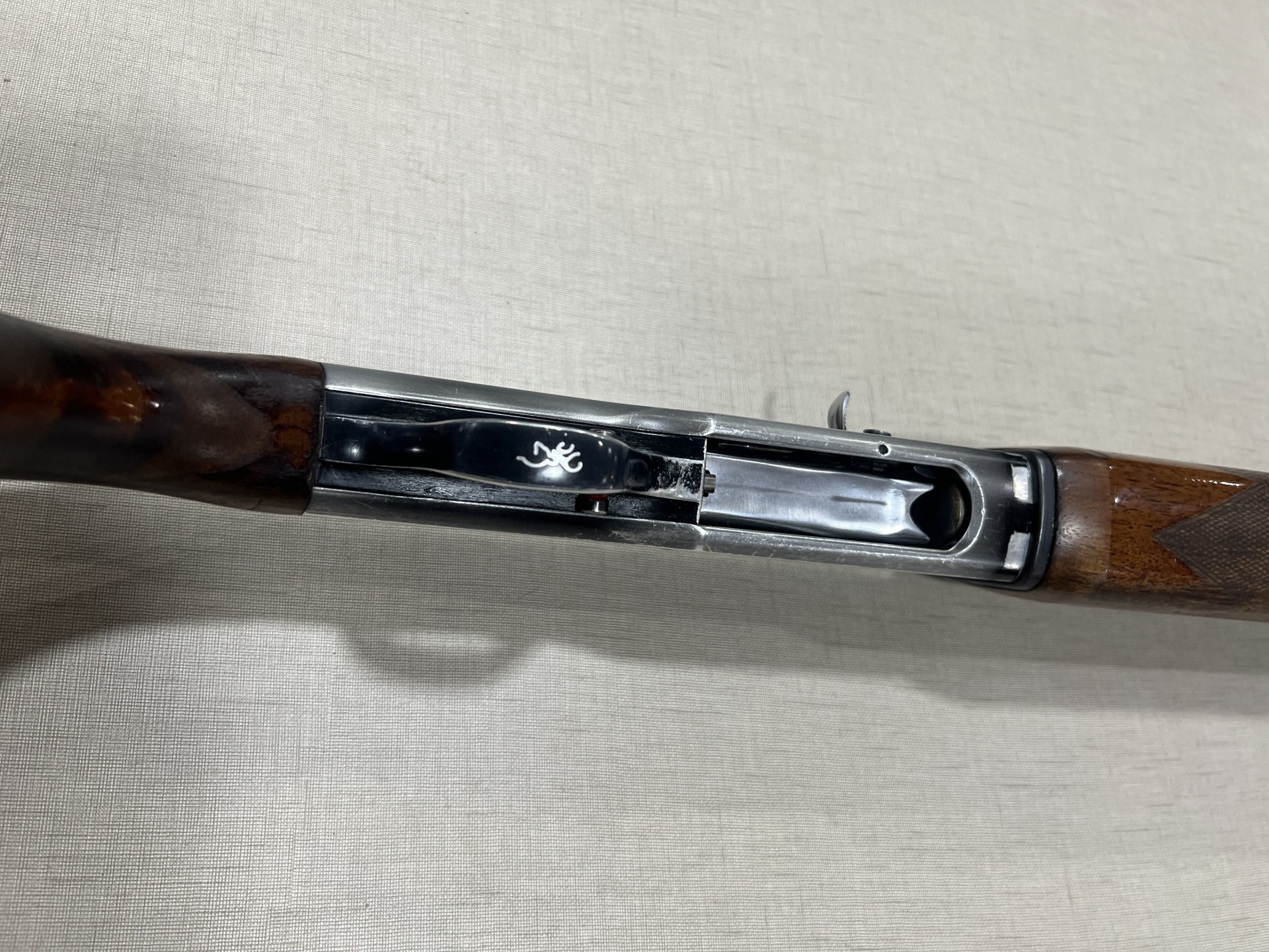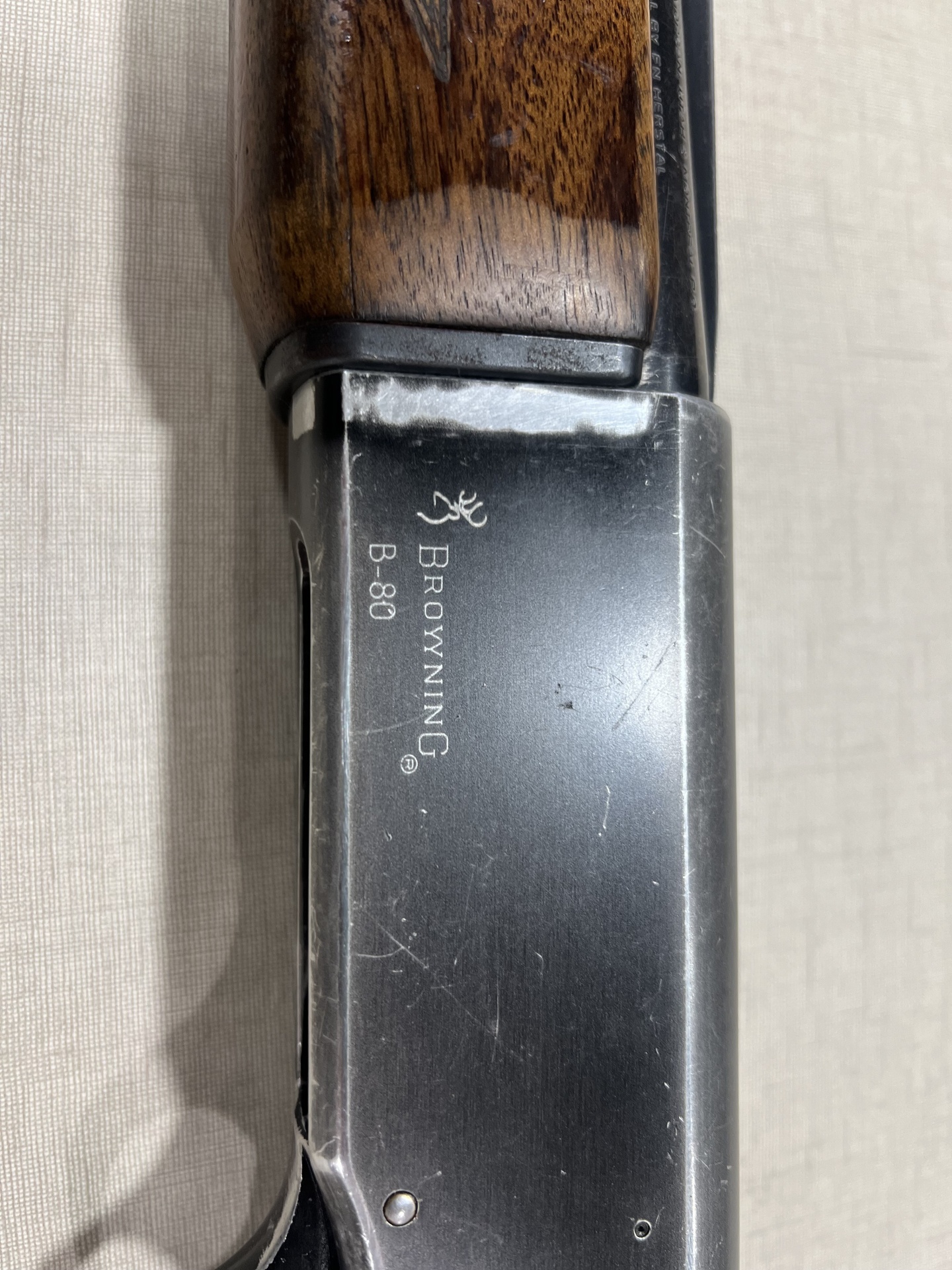 Parte metálica com inscrição BROWNING B-80 e madeira escura