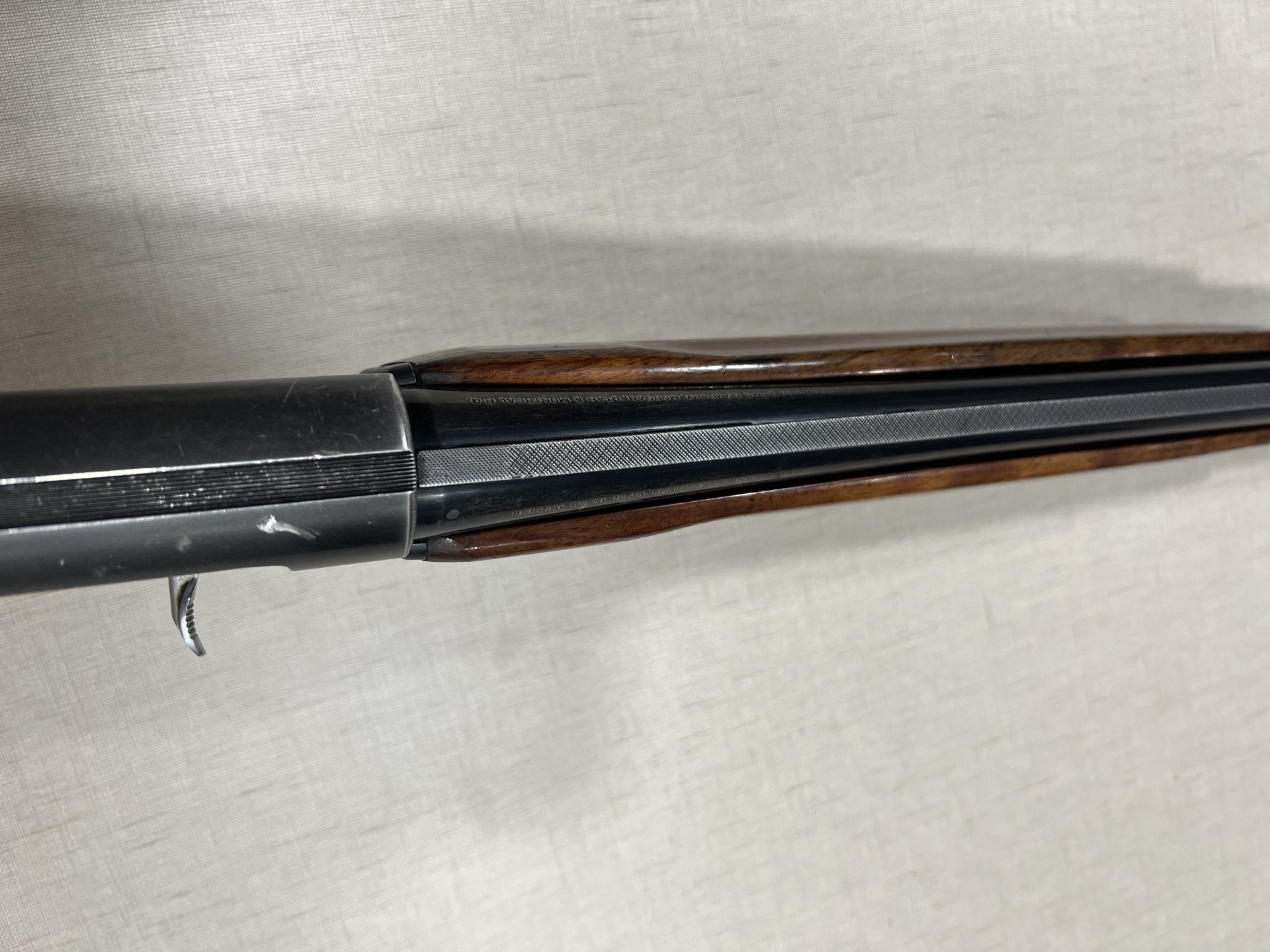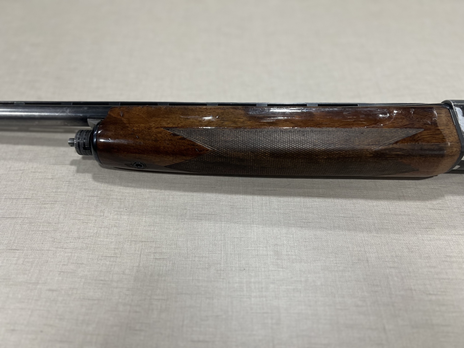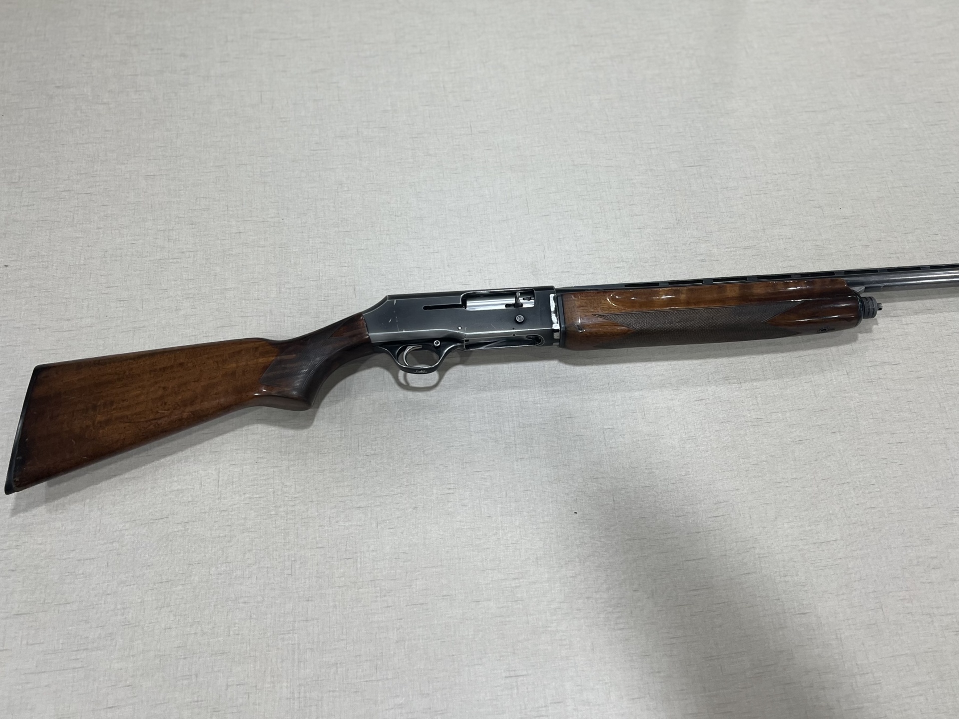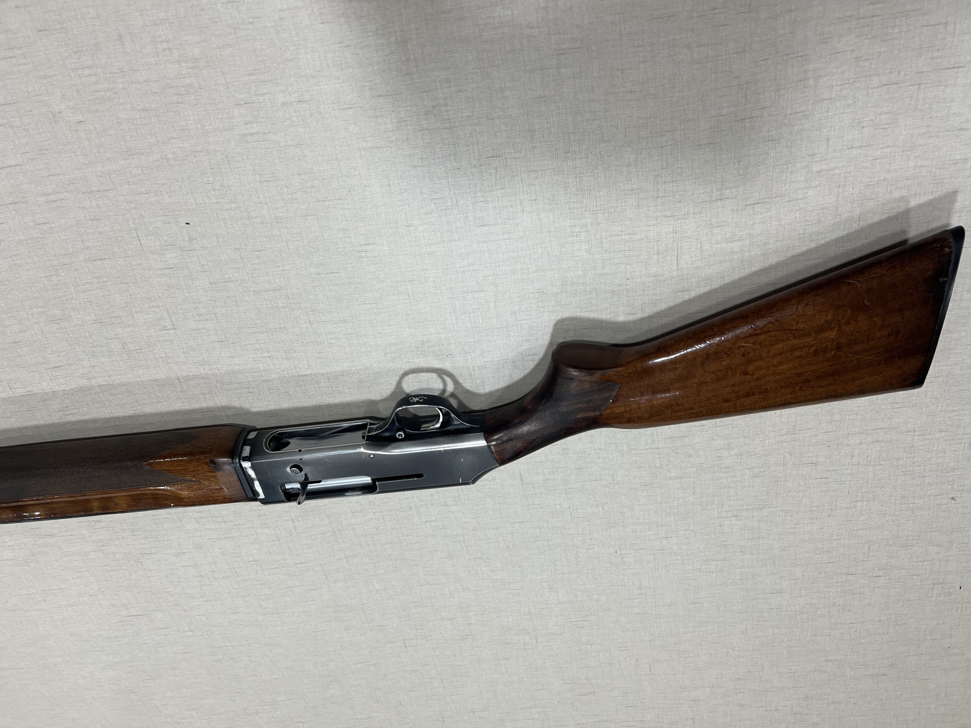 Parte metálica com inscrição BROWNING B-80 e madeira escura