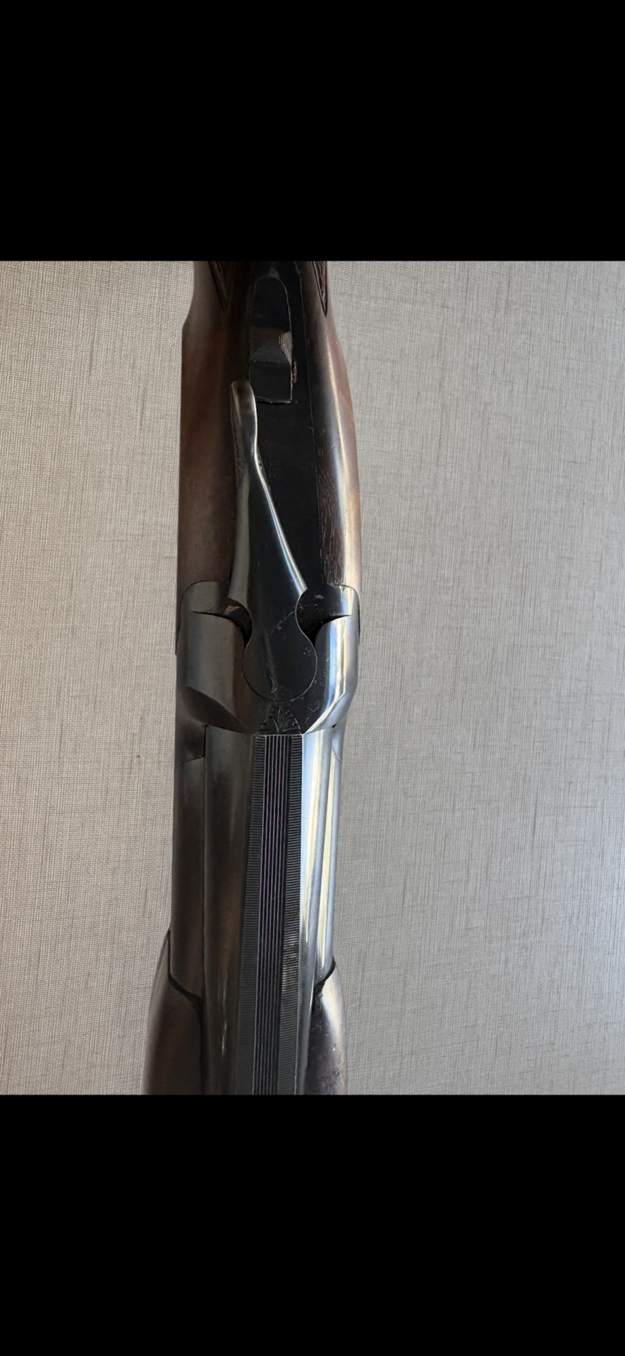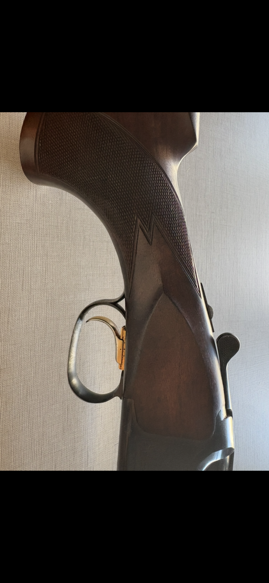 Cabo de espingarda em madeira escura com textura e detalhes em metal preto e dourado.