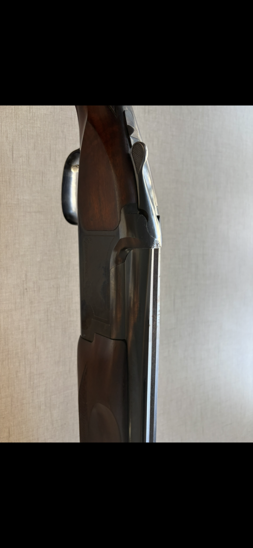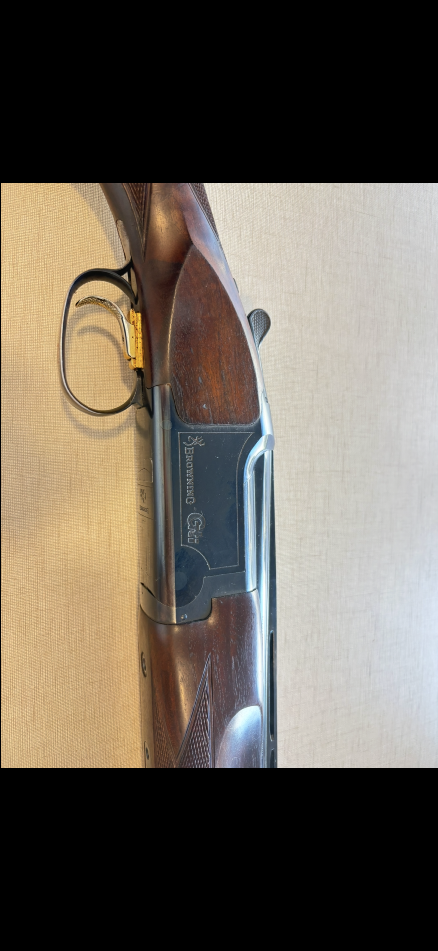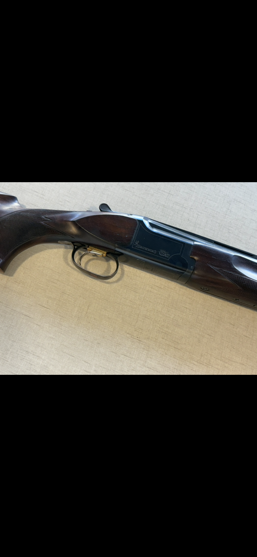 Espingarda de caça Browning Citori em madeira e metal preto com gatilho dourado