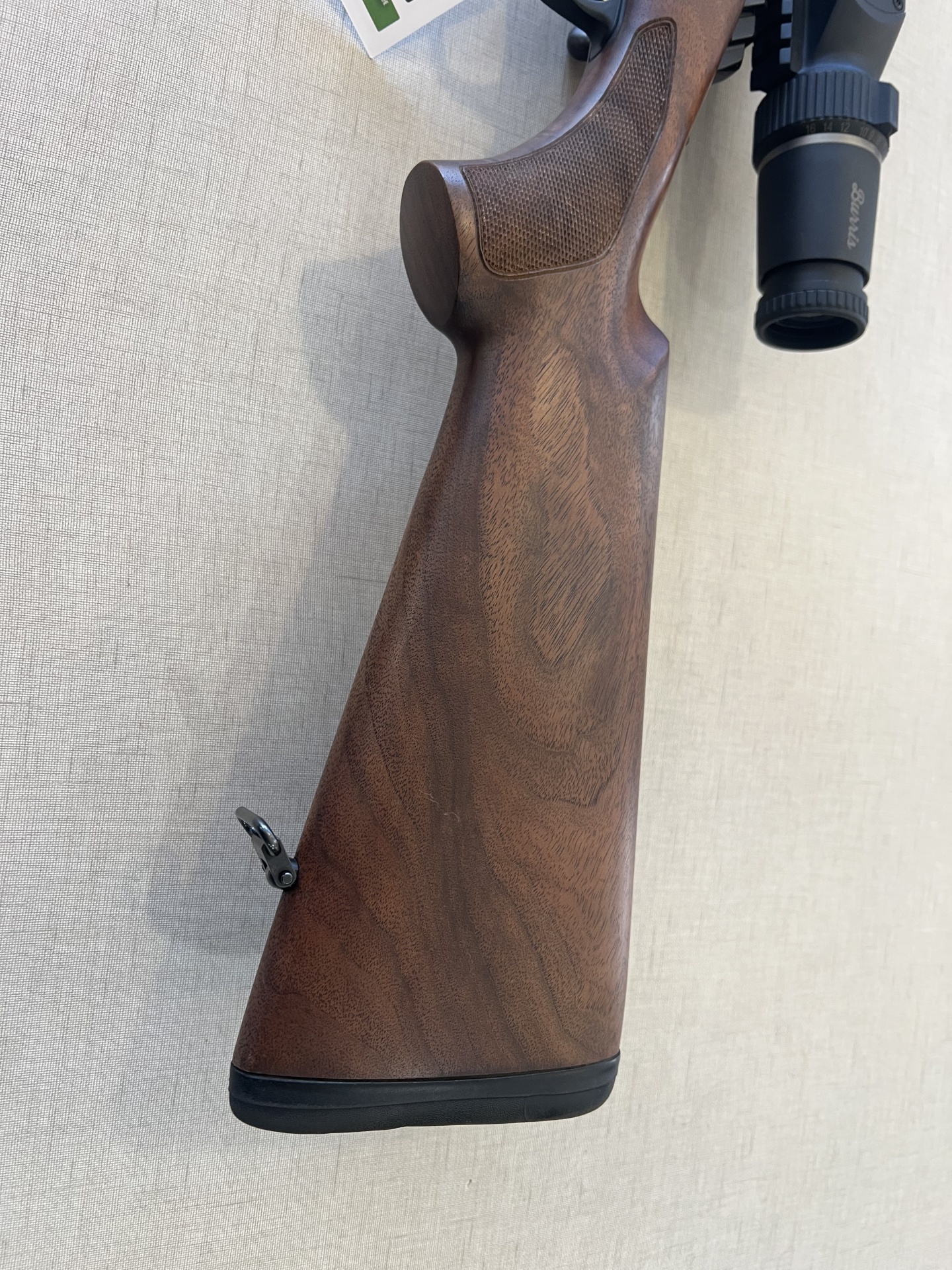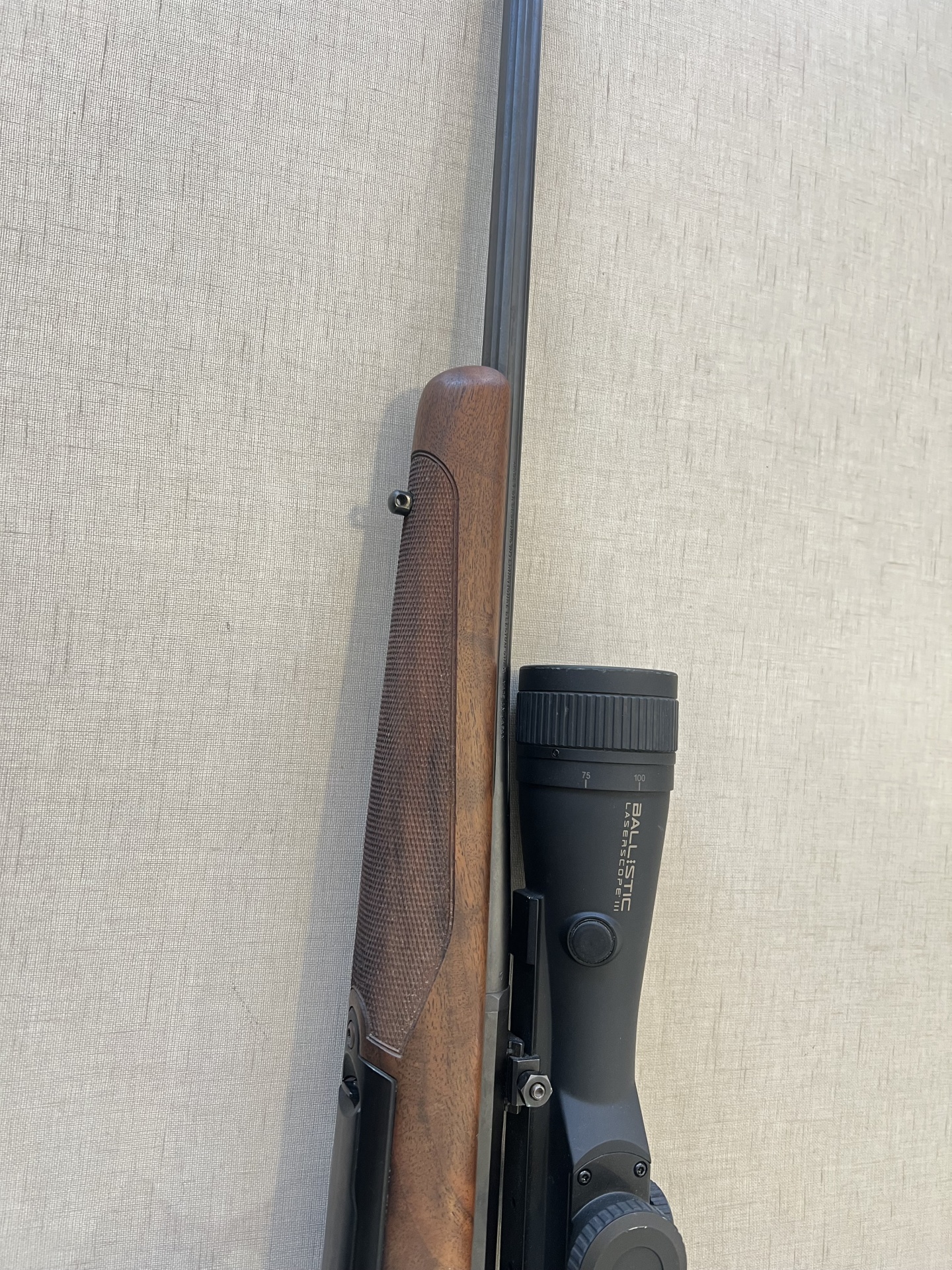 Espingarda com coronha de madeira e mira telescópica preta sobre fundo cinzento