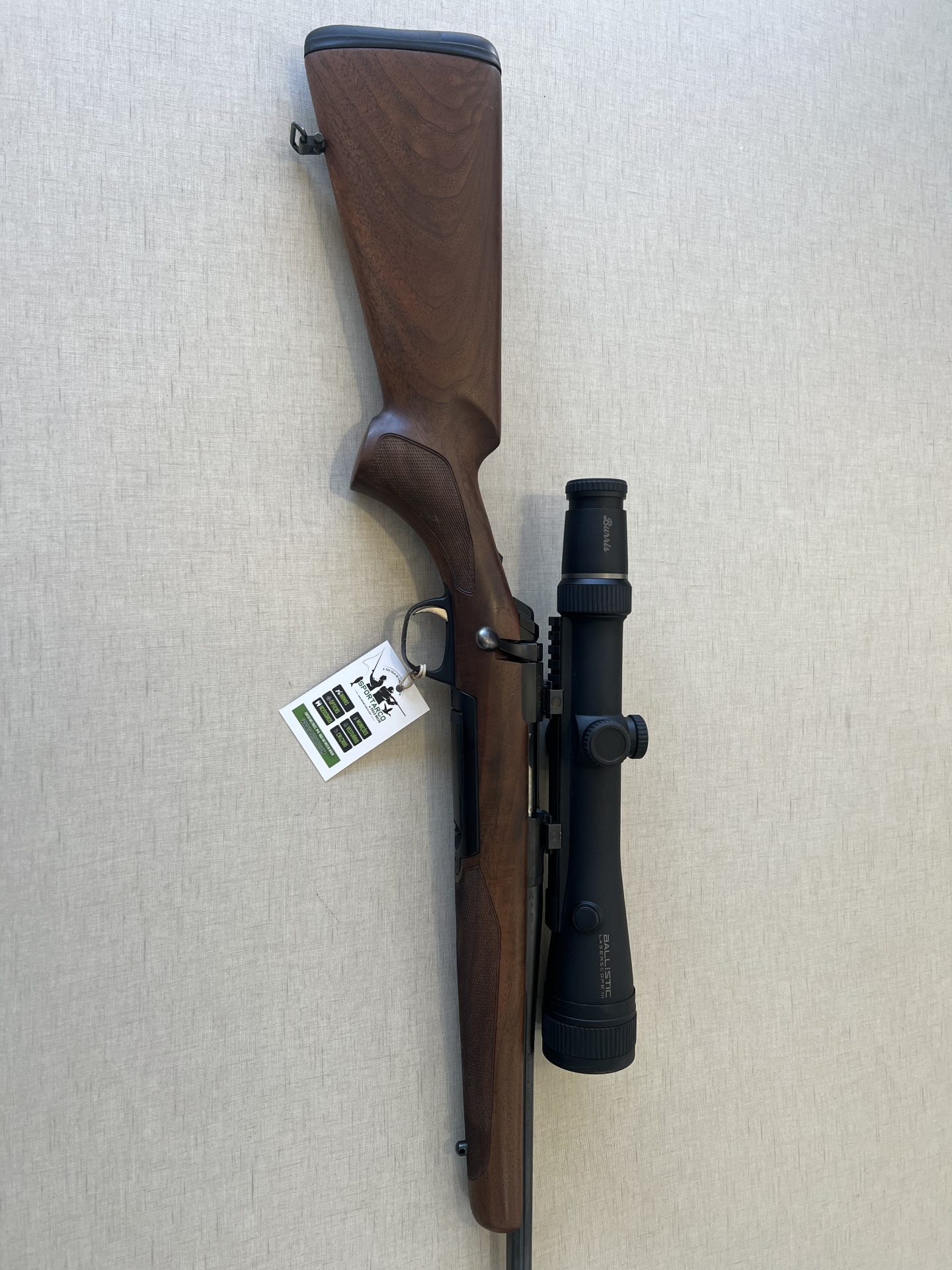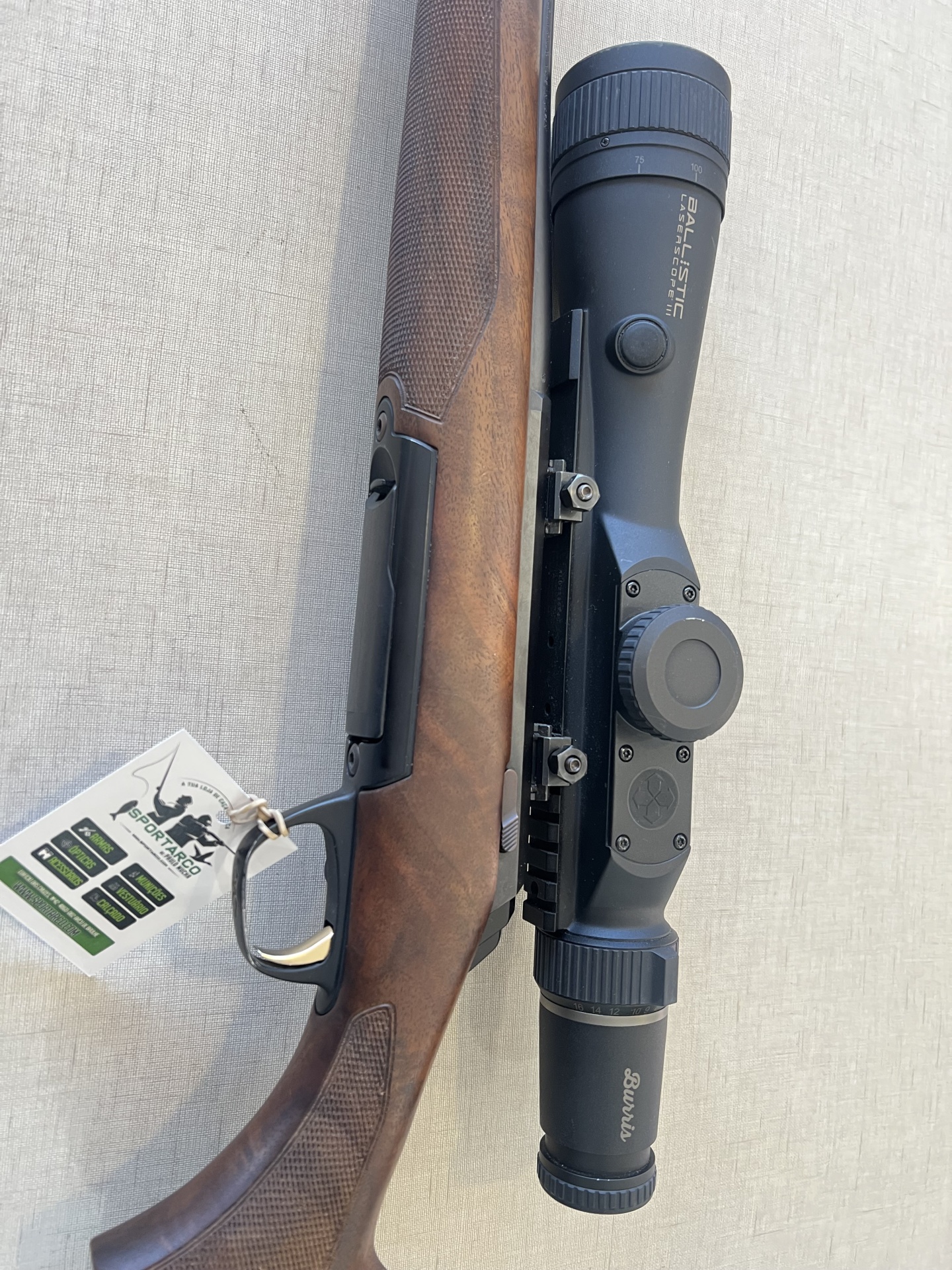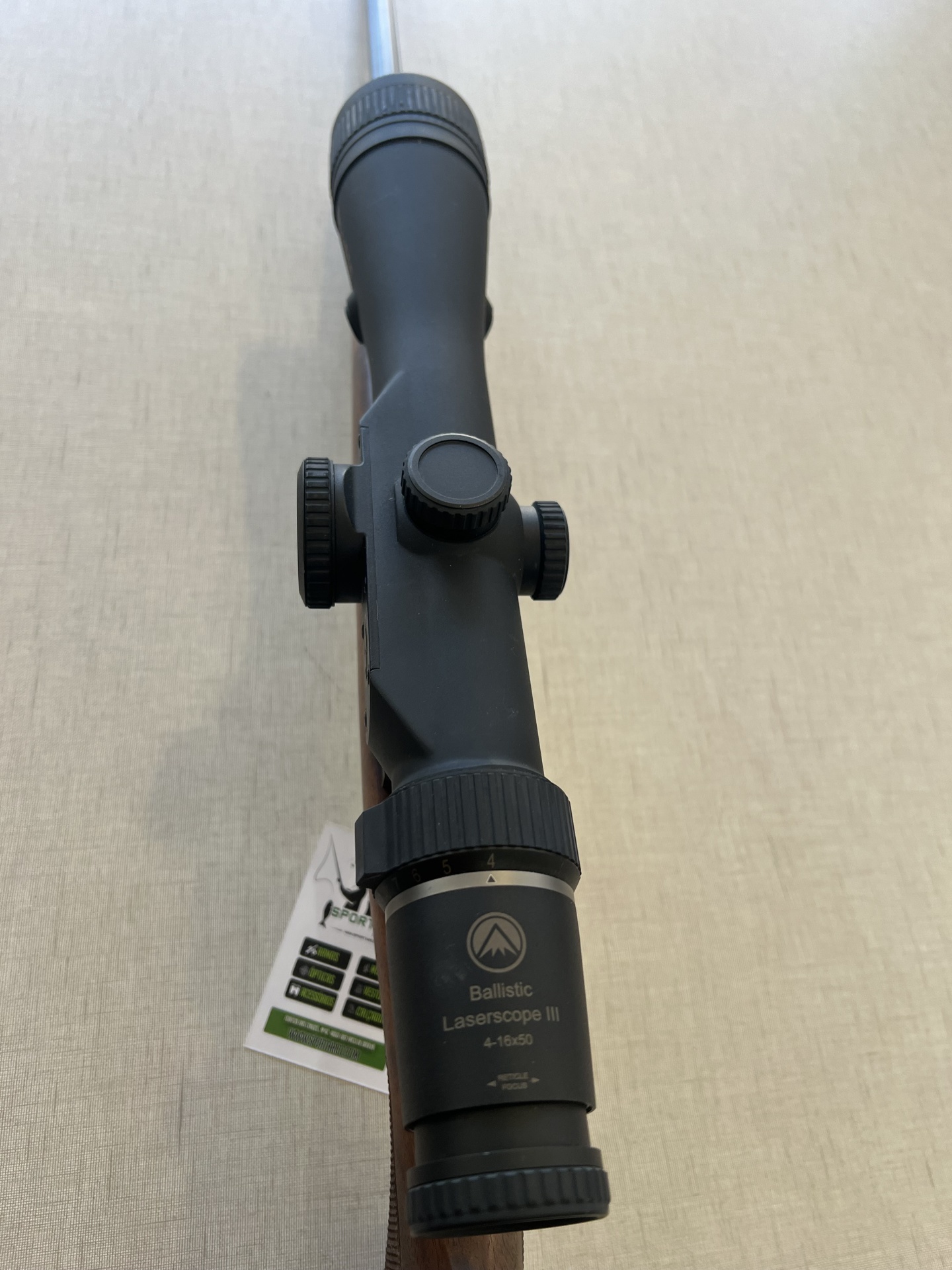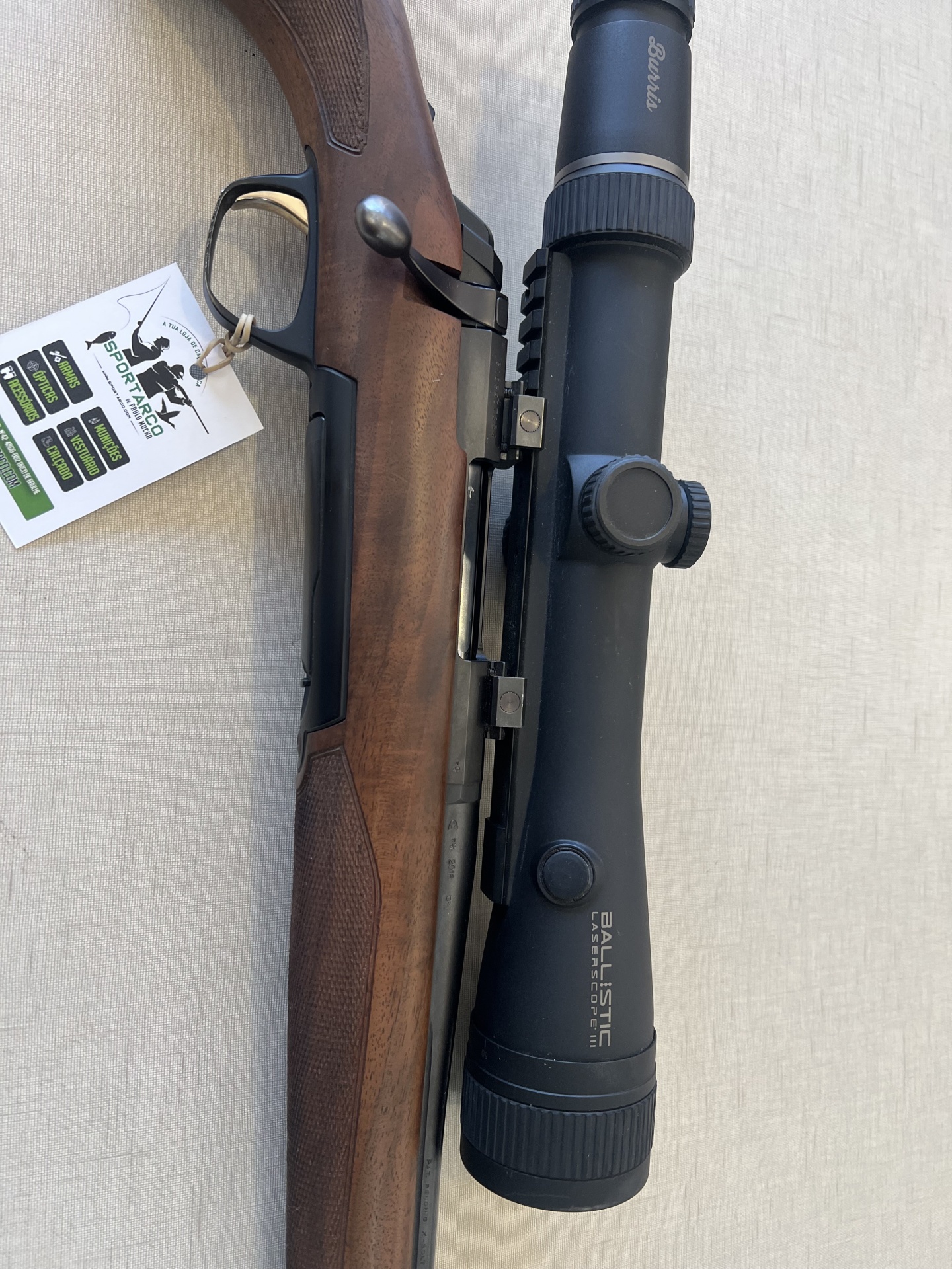 Carabina com coronha de madeira e luneta preta com inscrições nas lentes, com etiqueta pendurada