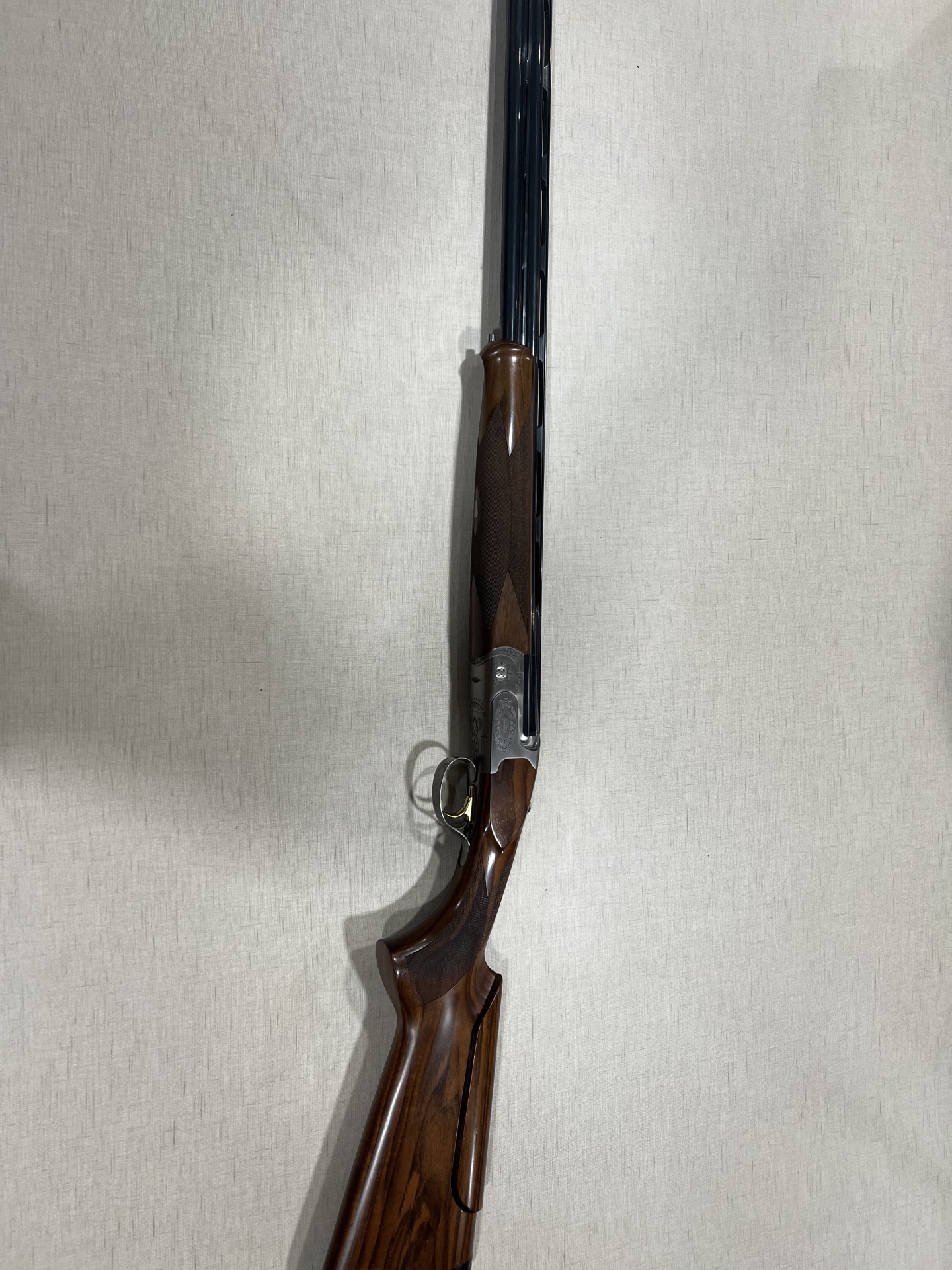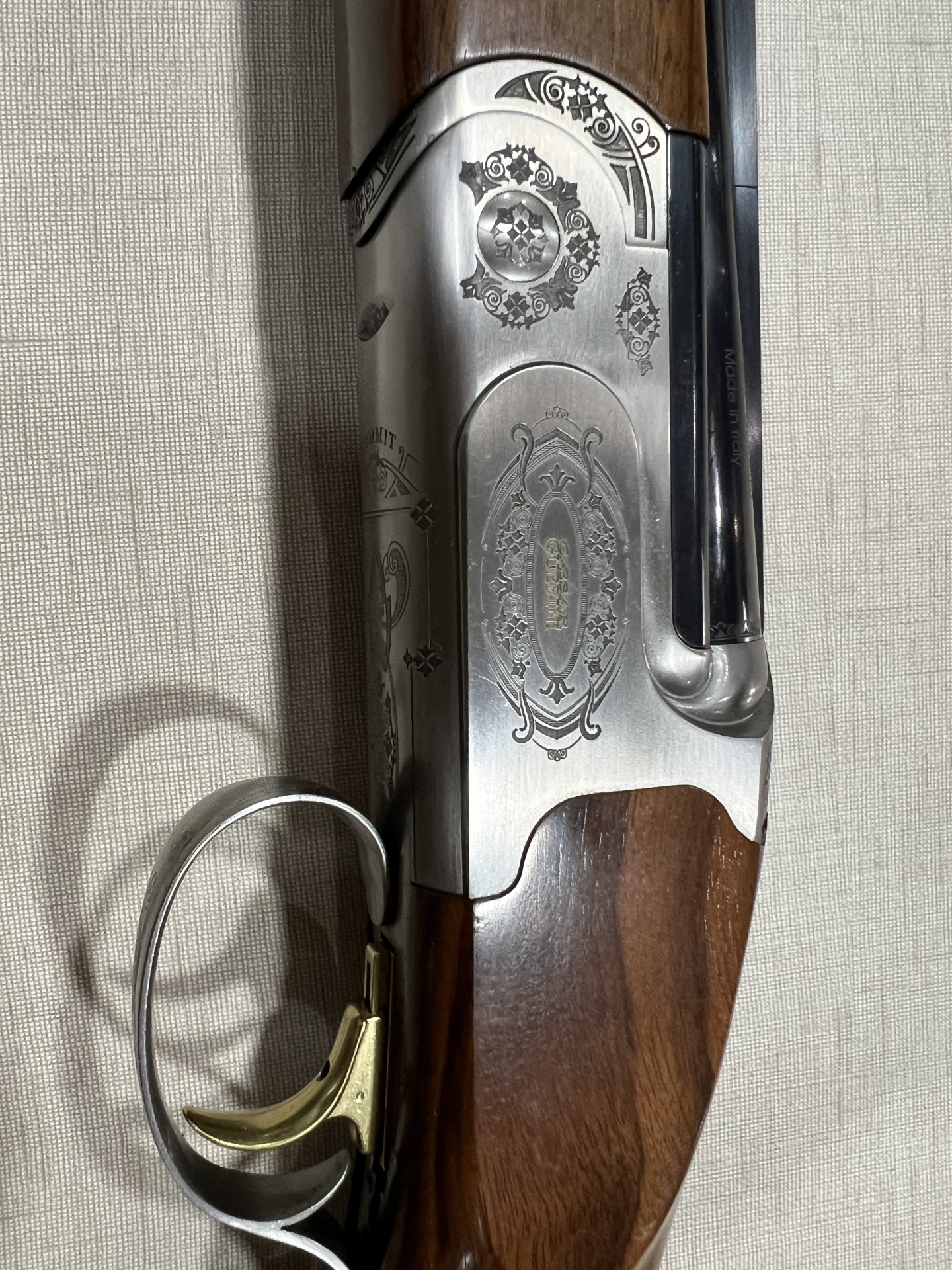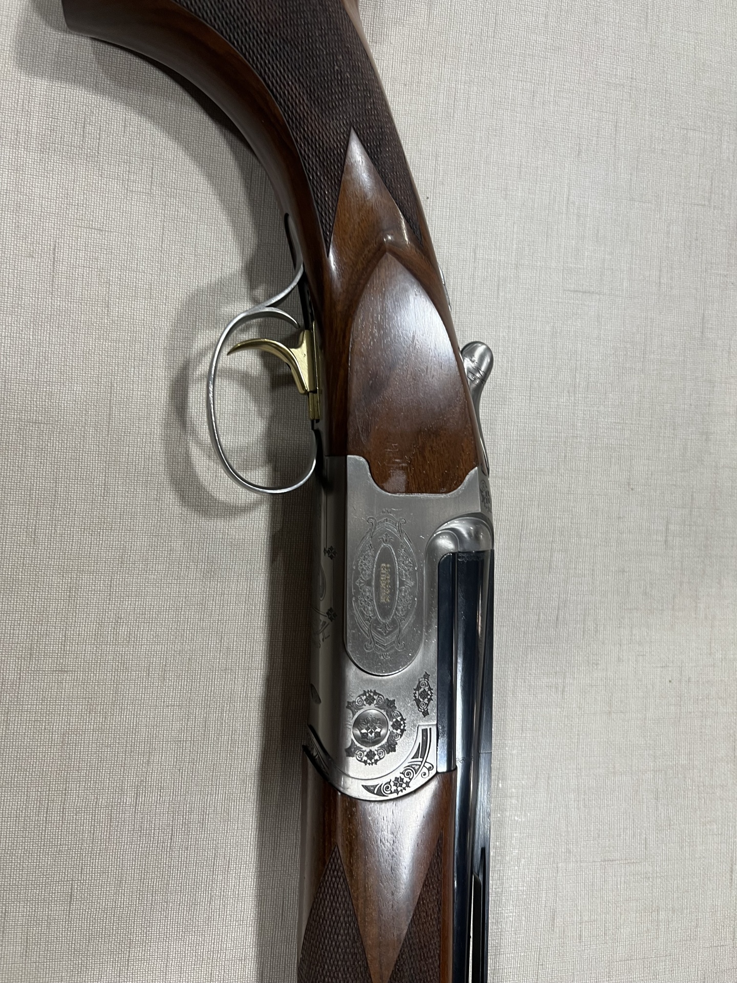 Espingarda de madeira com metal gravado e gatilho dourado