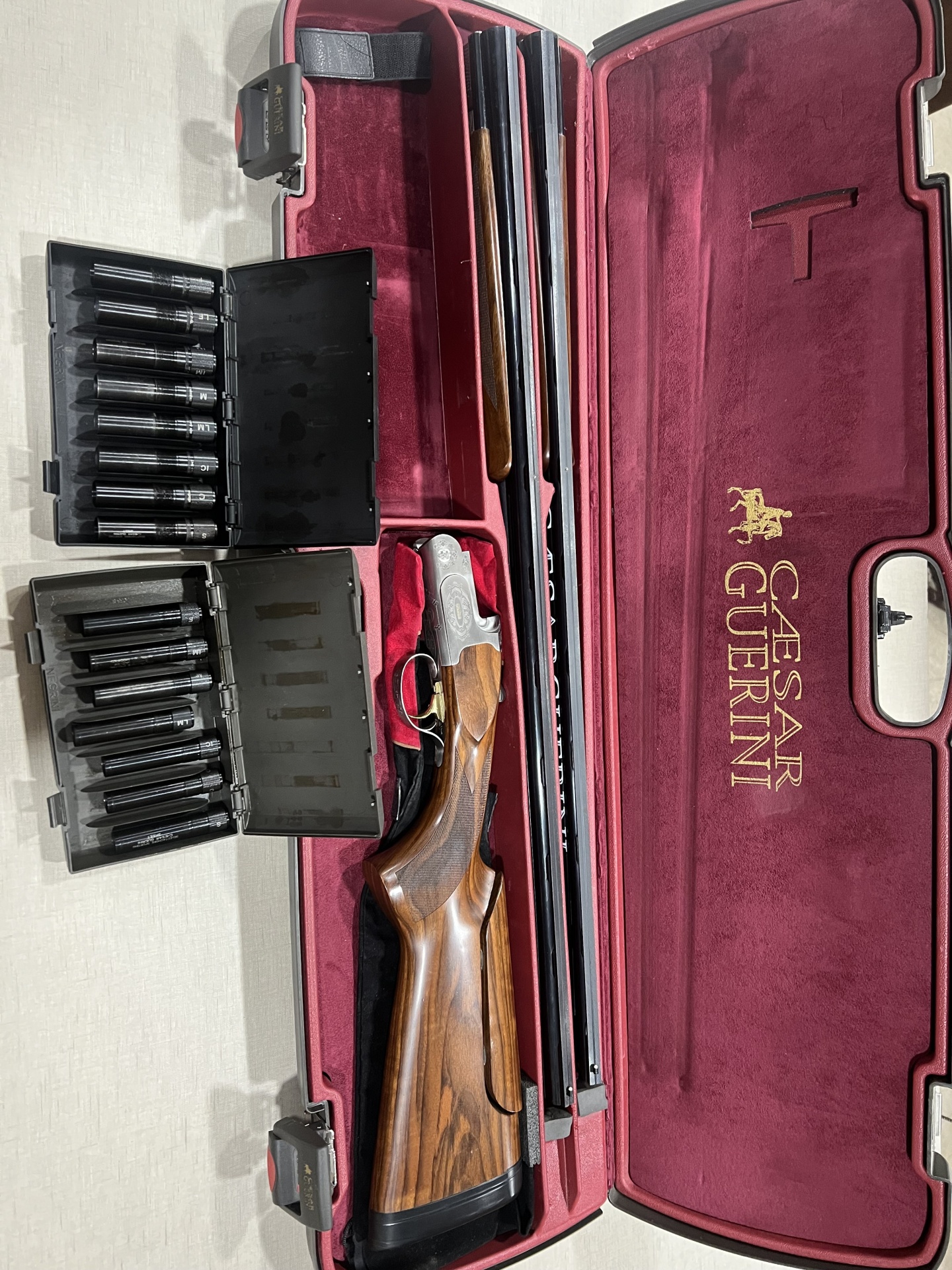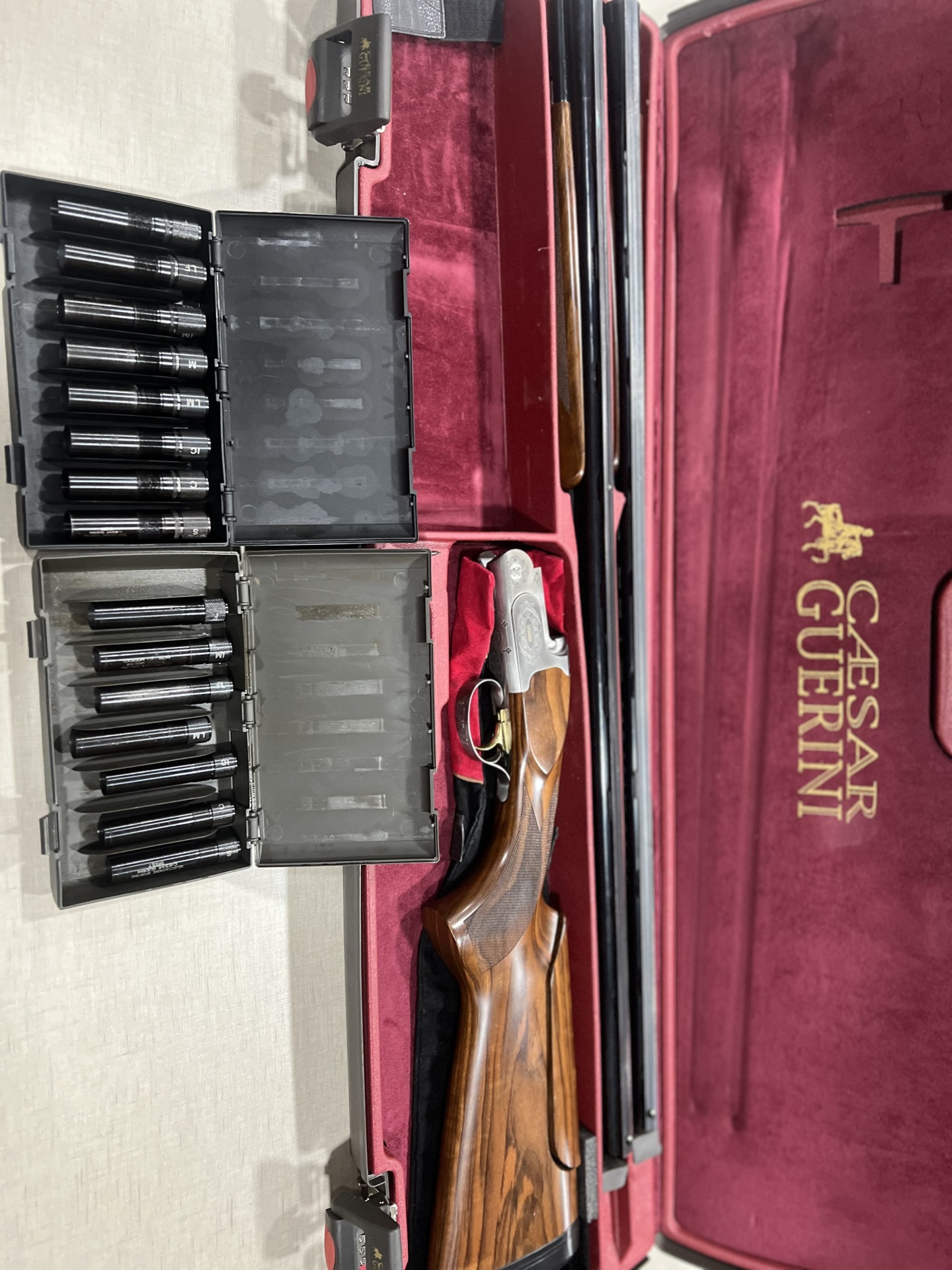 Espingarda desmontada em estojo vermelho com cartuchos em estojos pretos