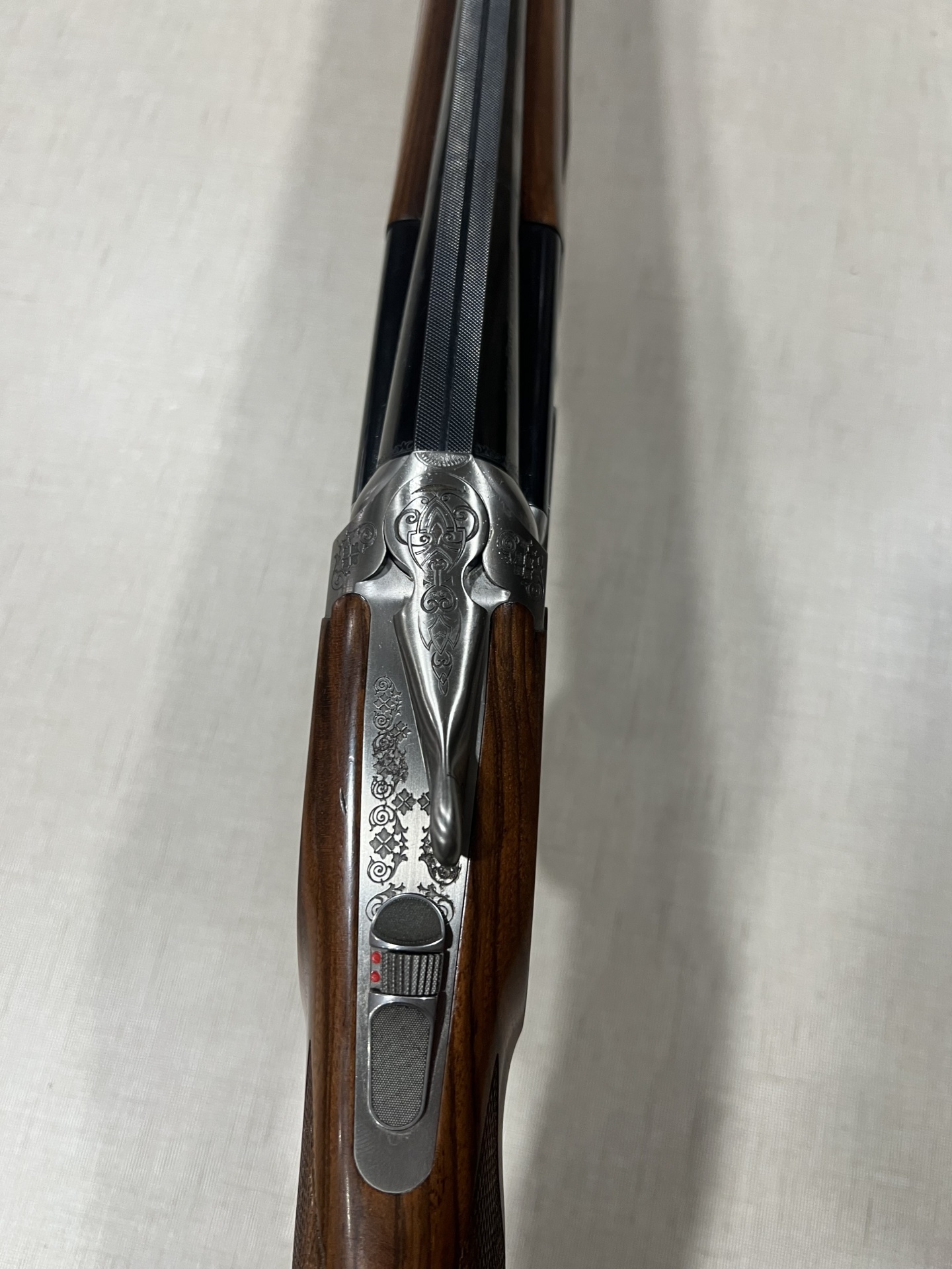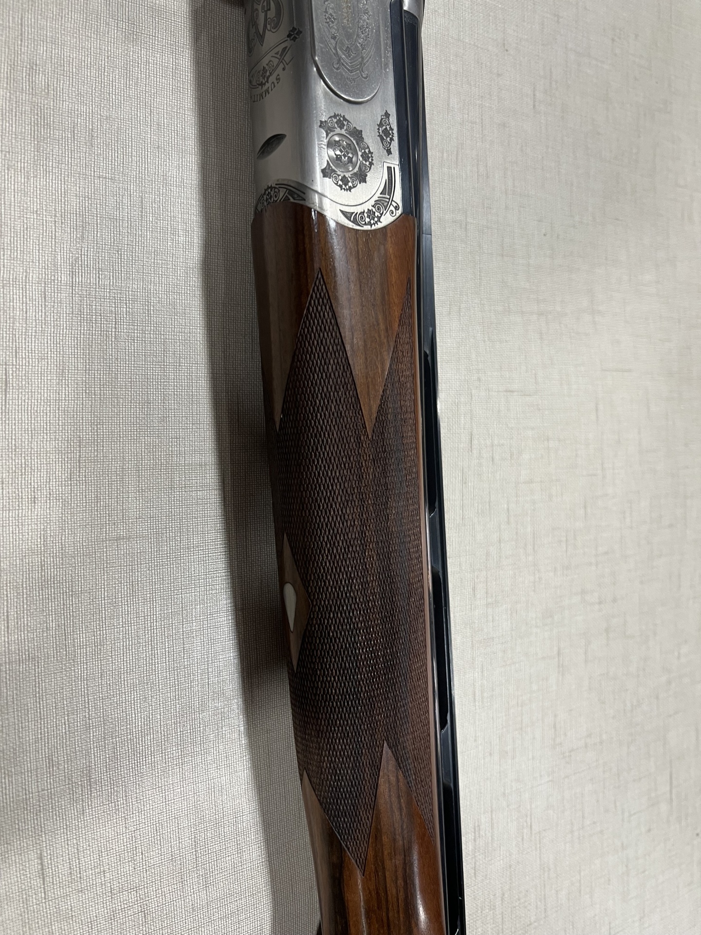 Espingarda dupla em madeira e metal prateado com detalhes gravados