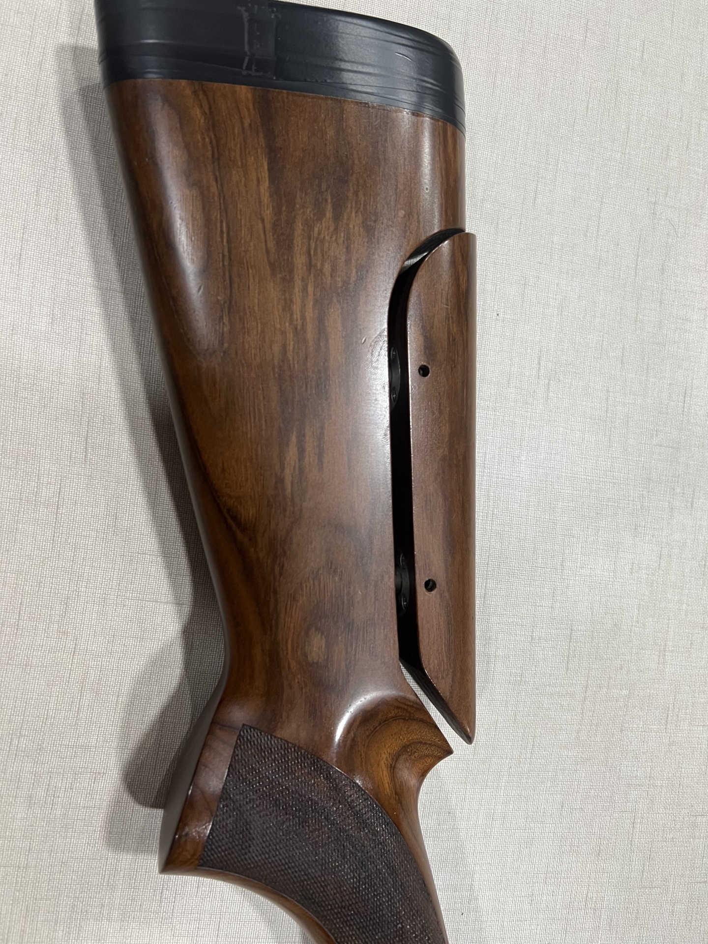 Coronha de carabina em madeira castanho-escura com borracha preta na ponta e textura antiderrapante.
