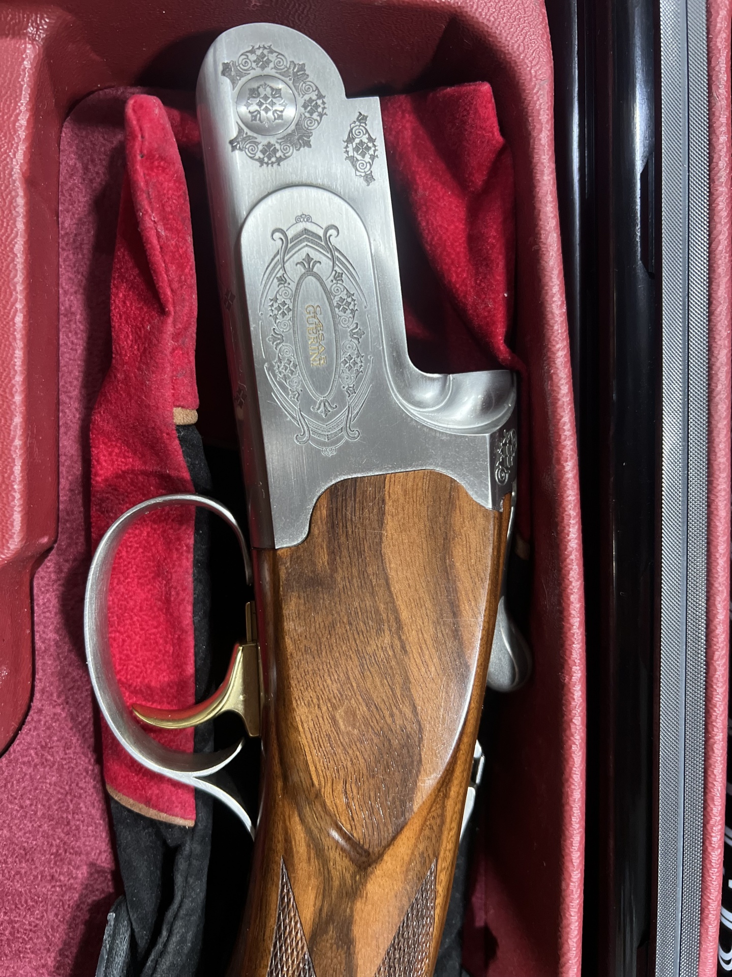 Parte de uma espingarda com madeira polida e metal cinza gravado no estojo vermelho