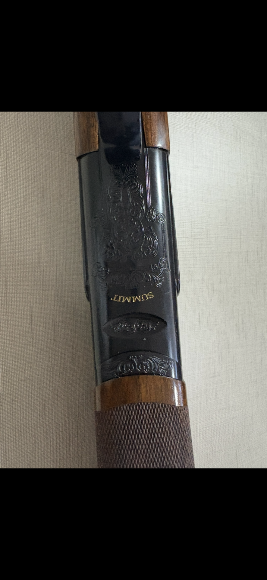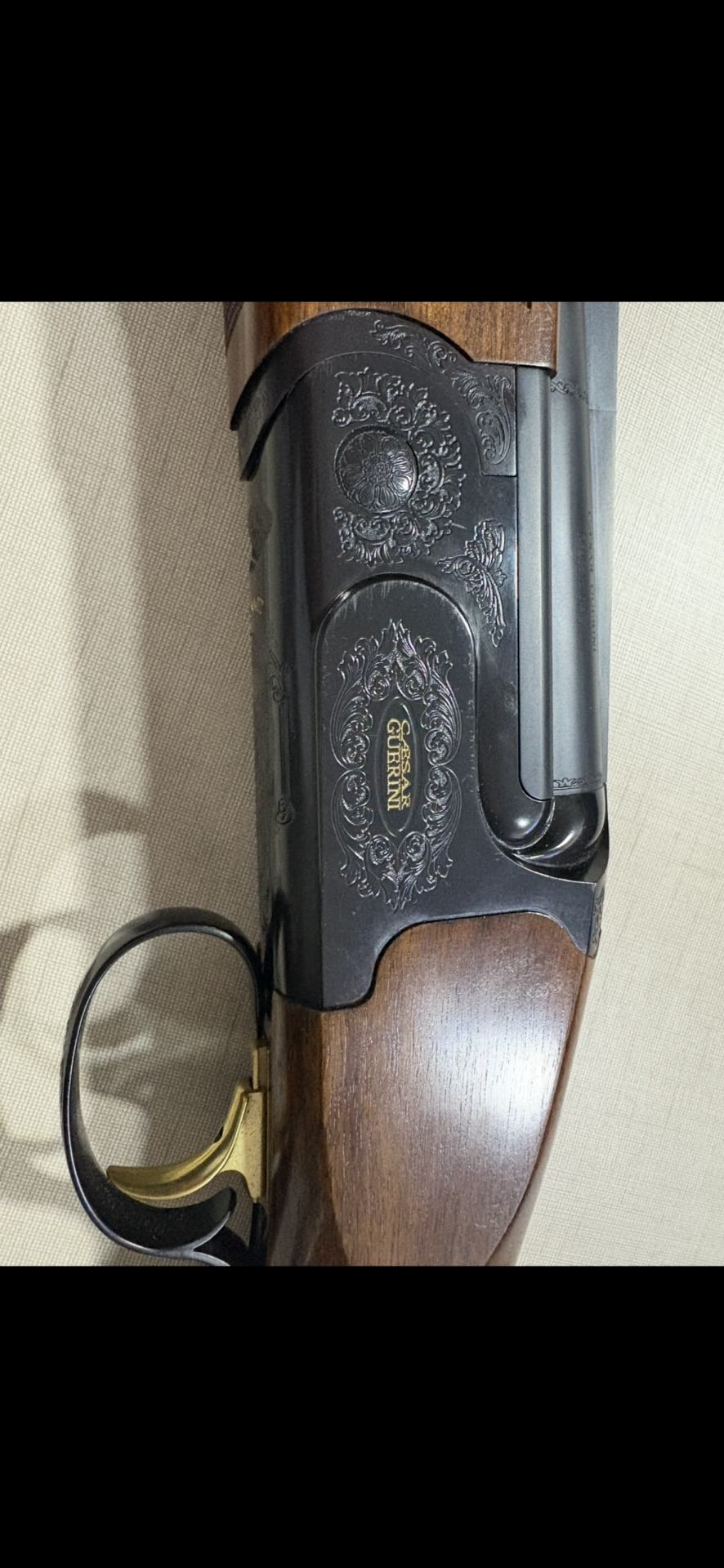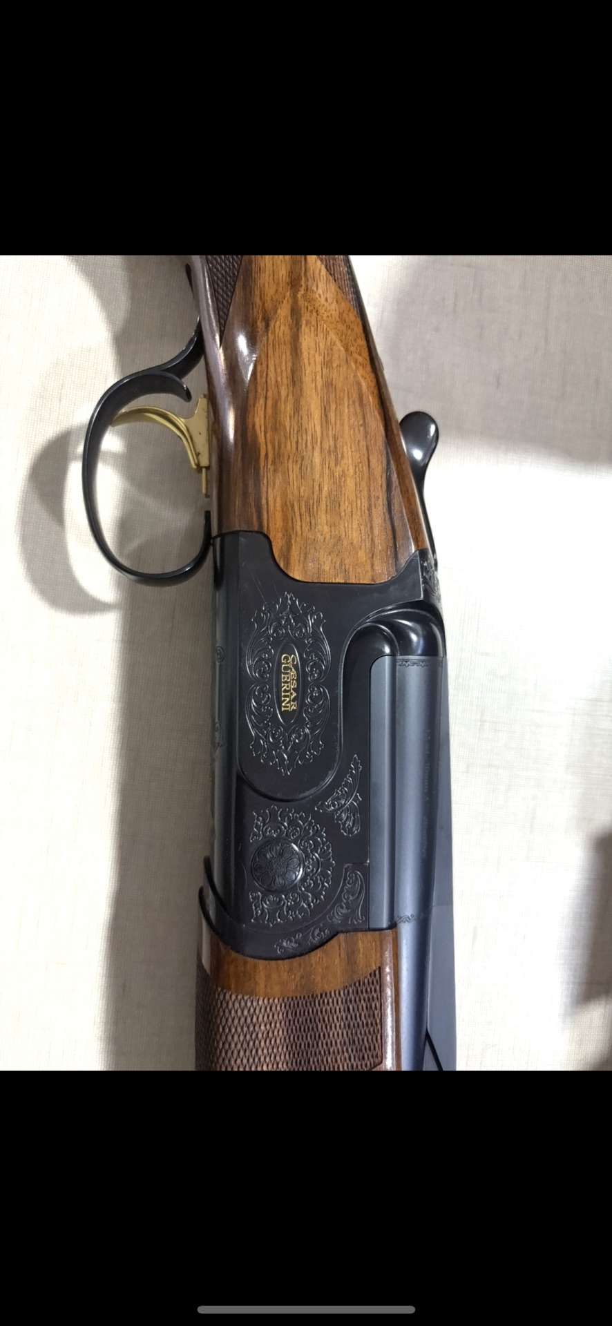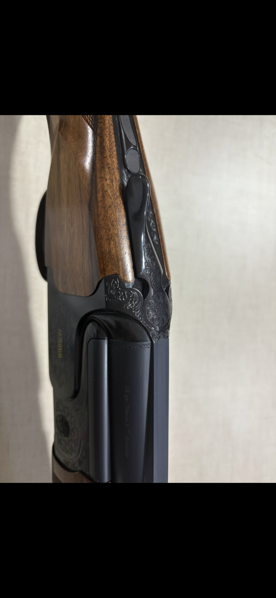 Espingarda de canos sobrepostos com detalhe em madeira e metal negro gravado
