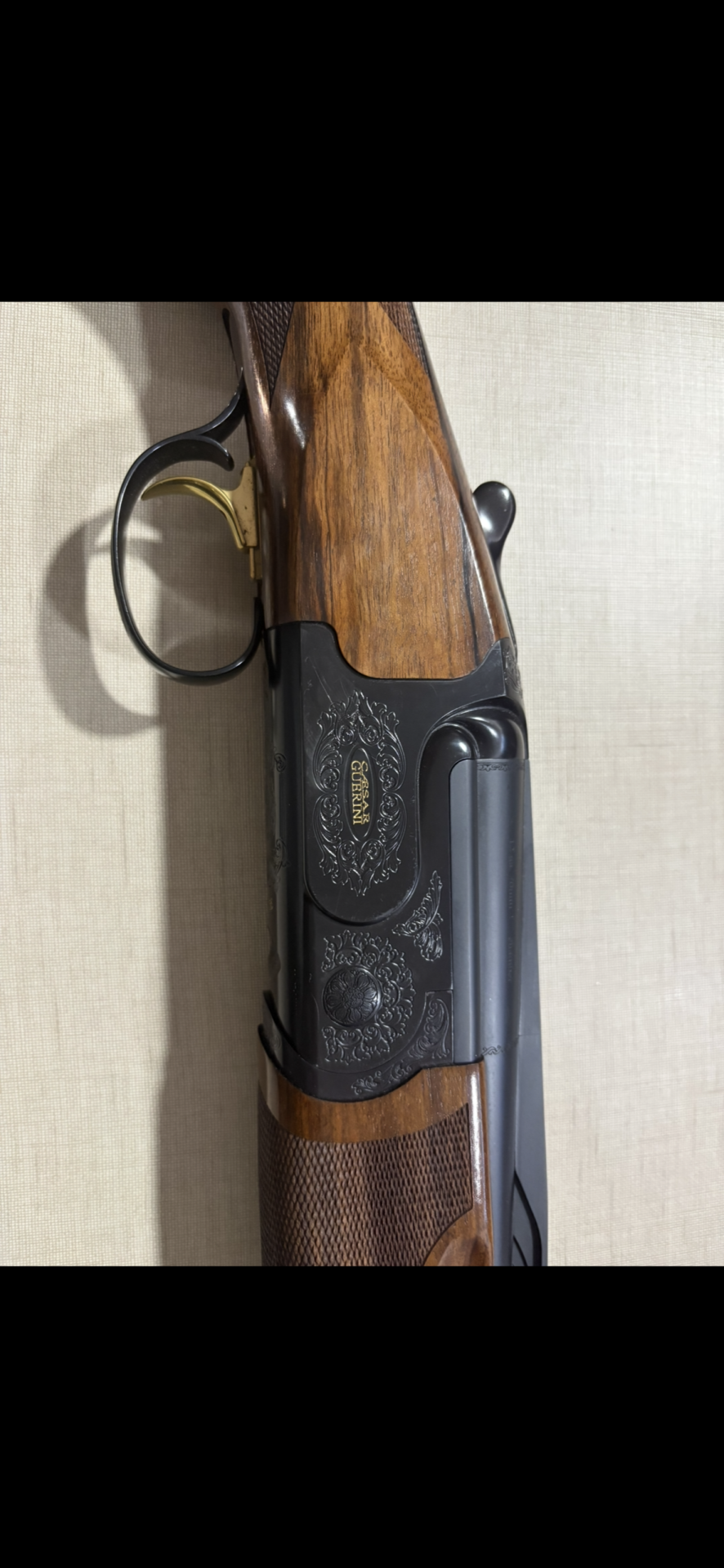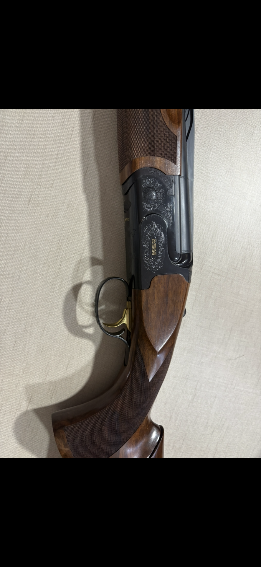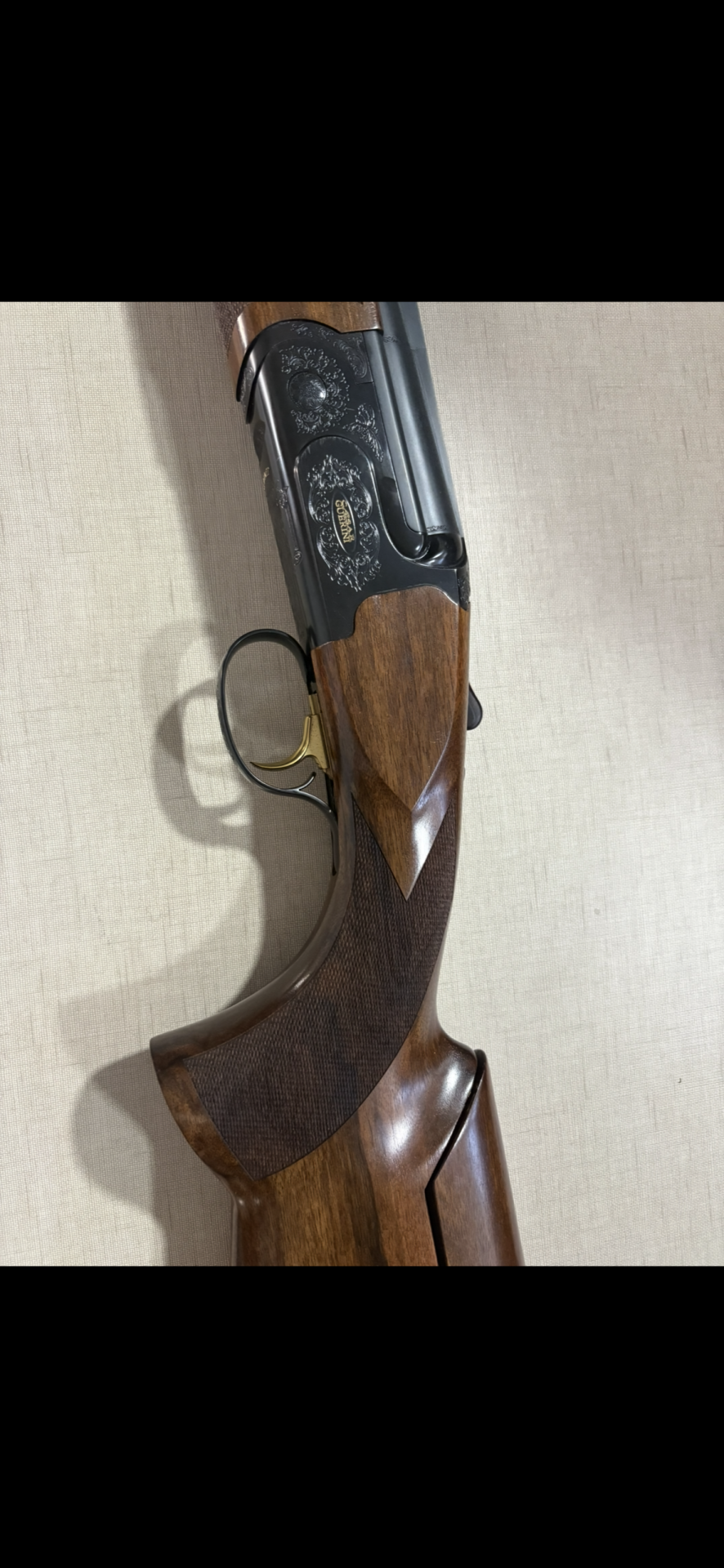 Espingarda com madeira castanha e metal preto gravado com a marca BERETTA
