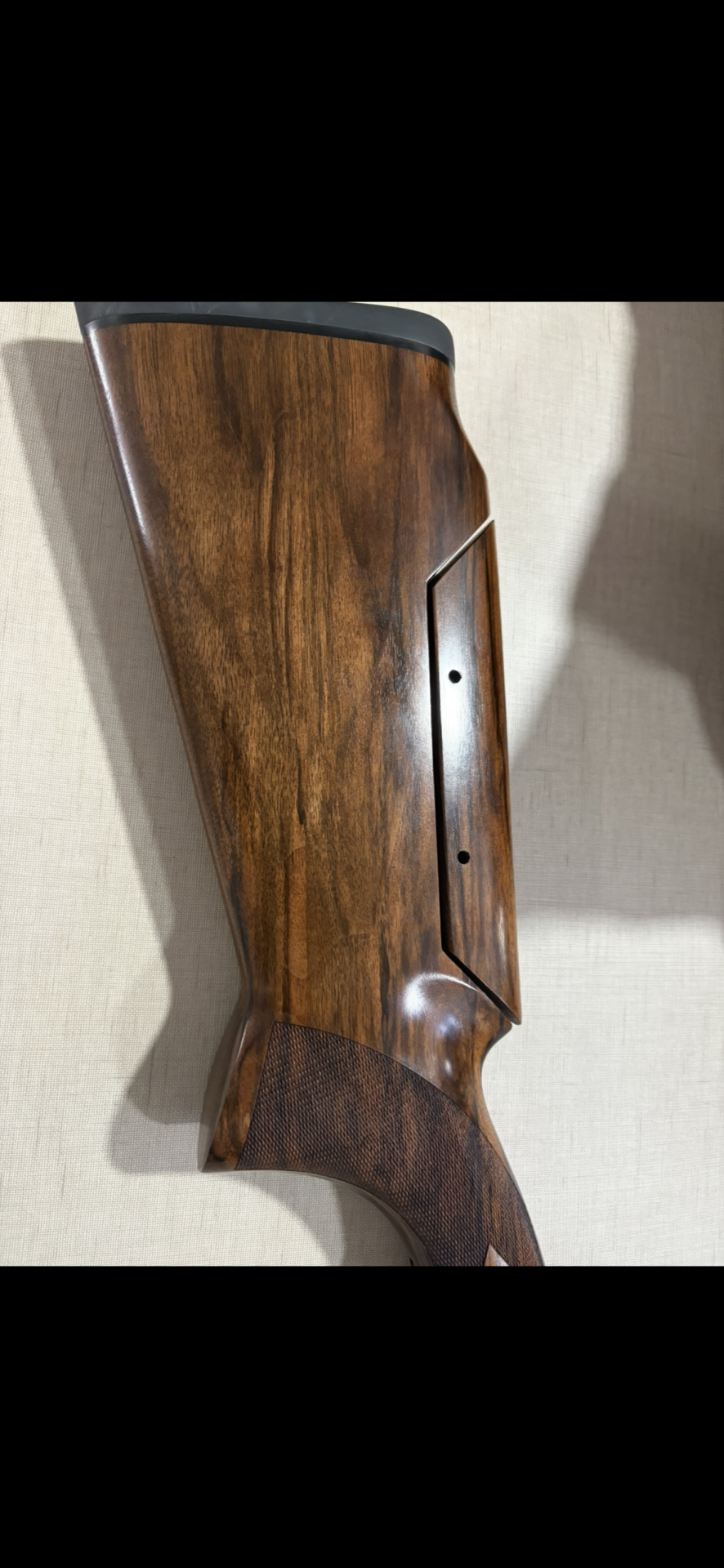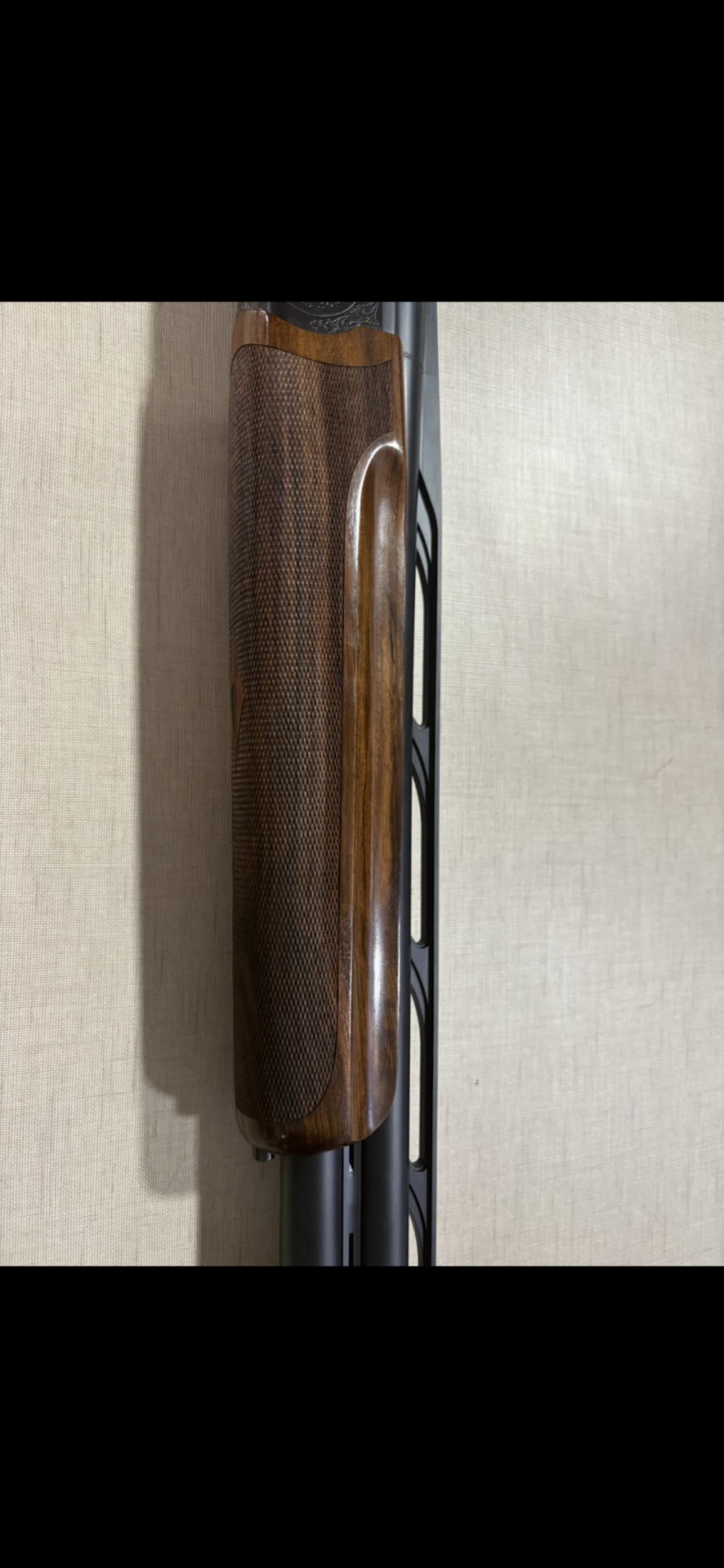 Penteira de espingarda em madeira escura com textura e metal preto com design recortado