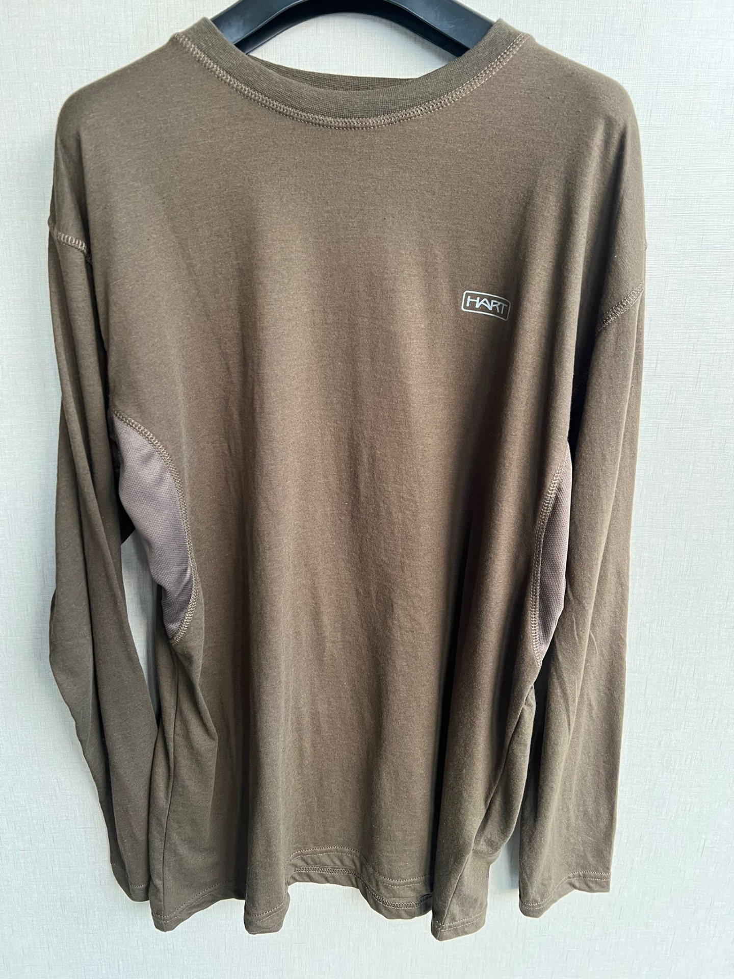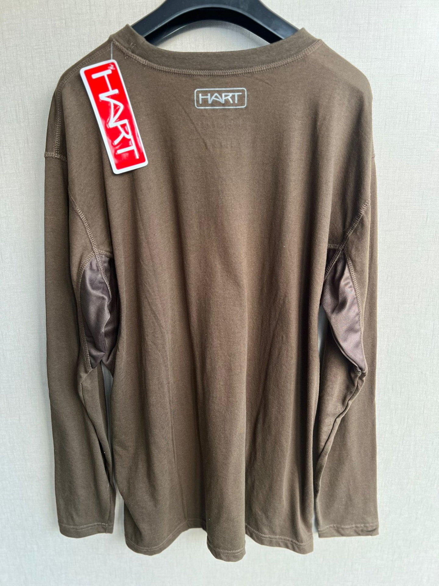 Camisola castanha de manga comprida com etiqueta HART, pendurada num cabide preto.