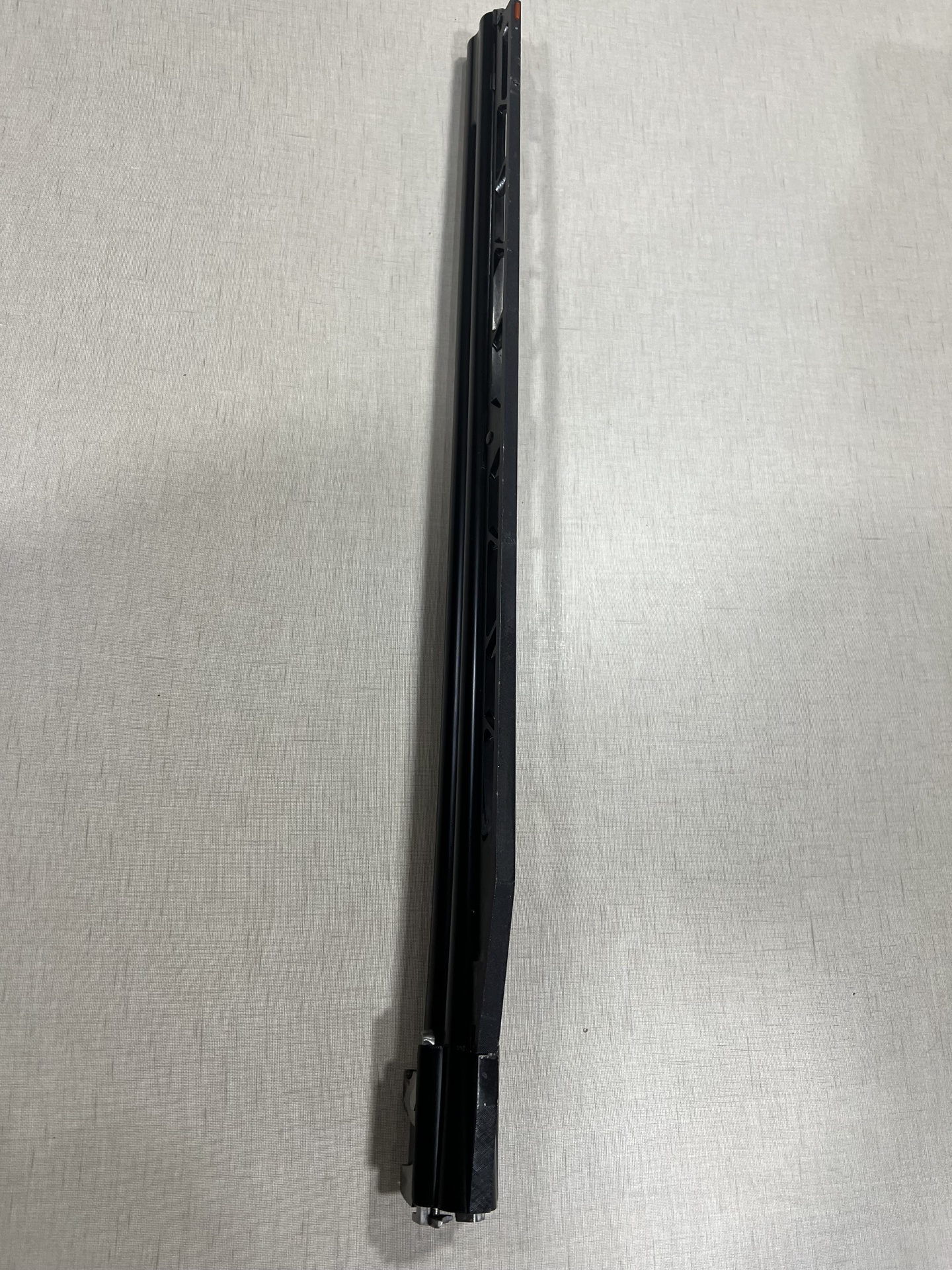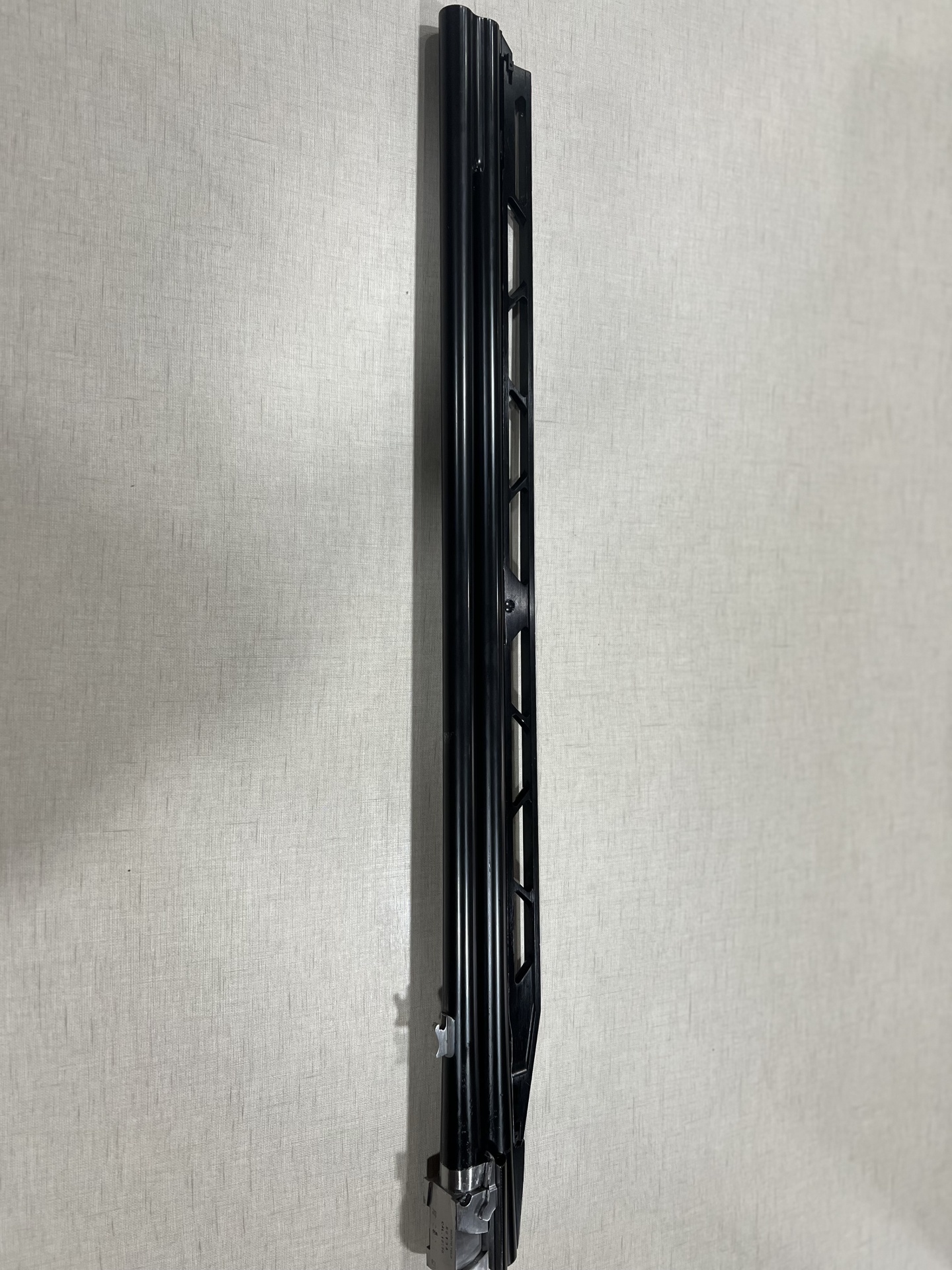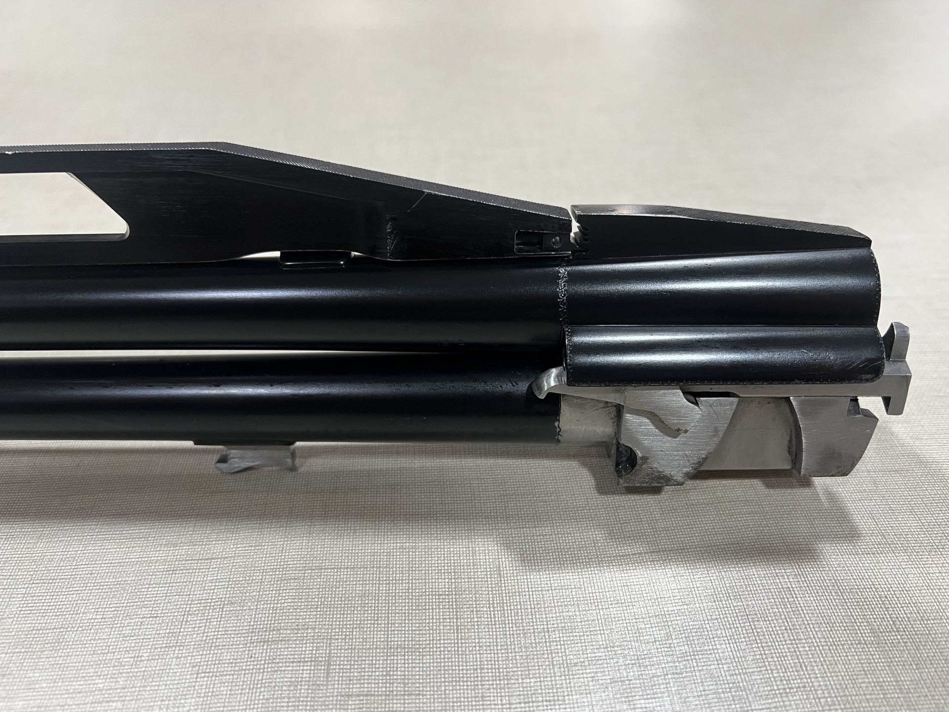 Parte frontal de arma de ar comprimido preta em fundo cinza