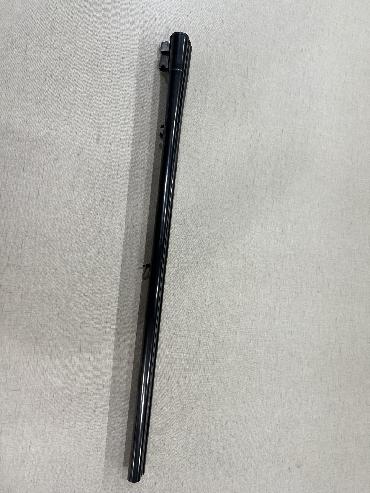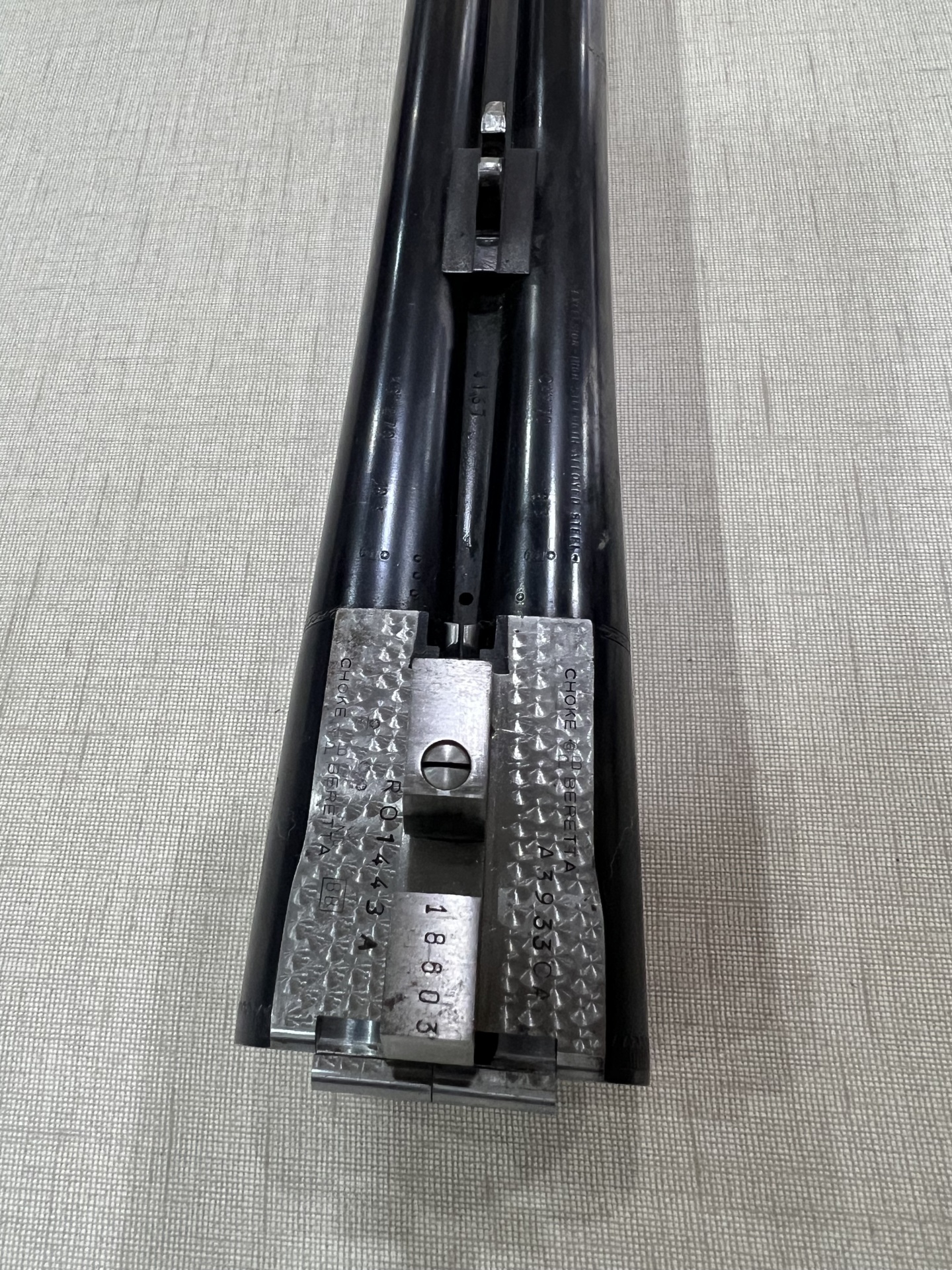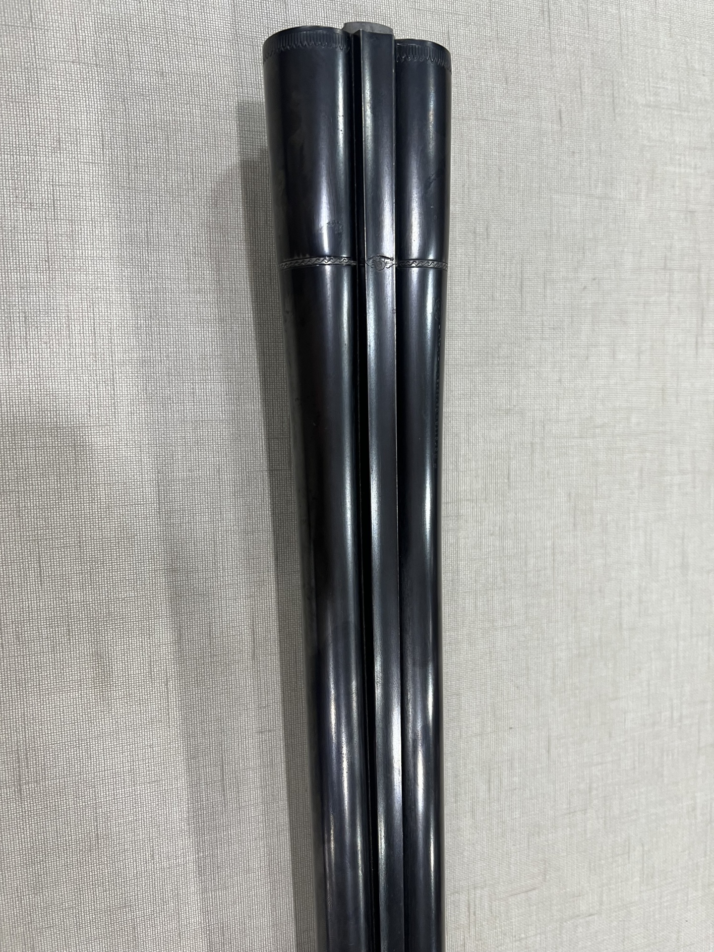 Parte frontal de arma de canos duplos em metal preto com peças metálicas prateadas na base