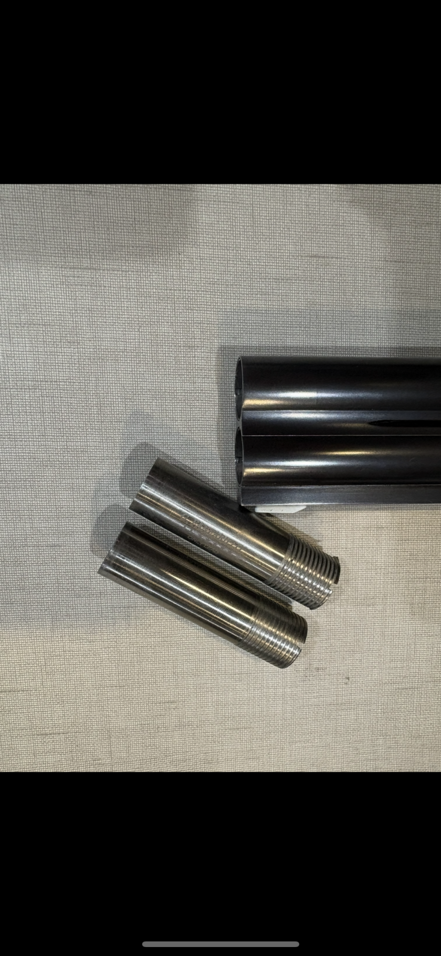 Conjunto de canos duplos de arma de fogo com acabamento preto e prateado sobre tecido cinza