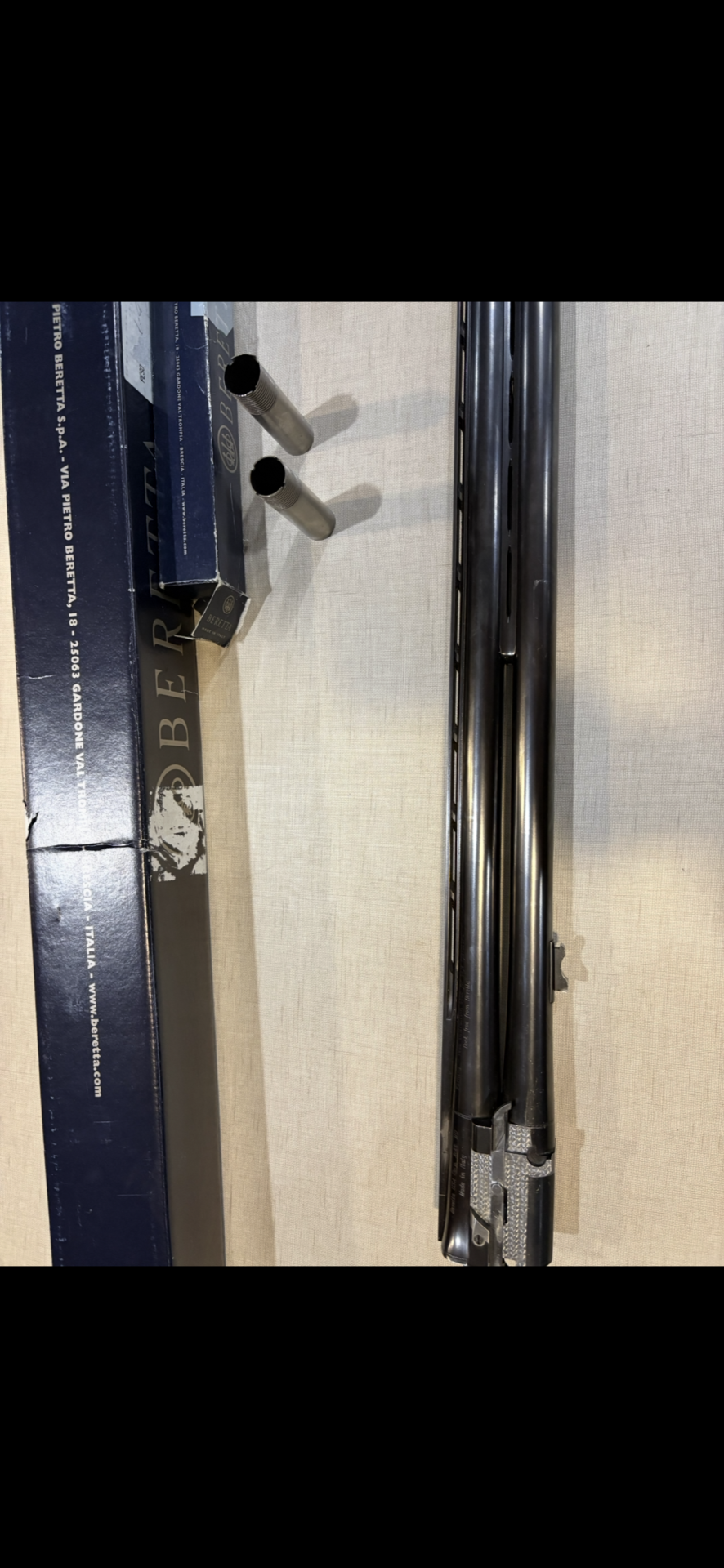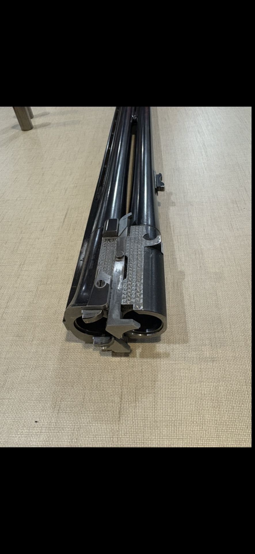 Peças metálicas e caixa azul com texto branco da marca Pietro Beretta junto a arma de canos duplos