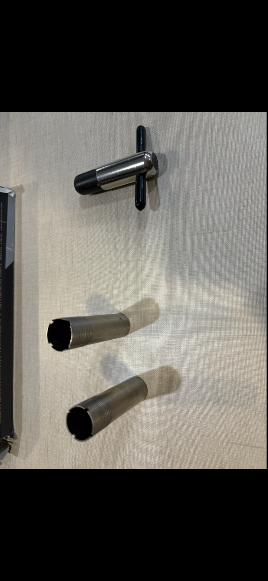 Três acessórios metálicos sobre superfície bege, dois cilíndricos com roscas e um com eixo cromado e cruzado preto.