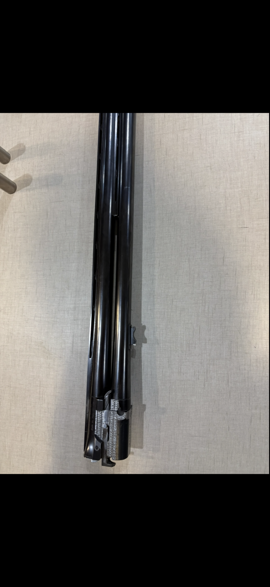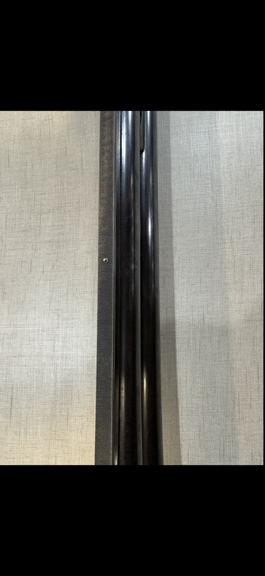 Cano duplo metálico de espingarda sobre superfície bege texturizada