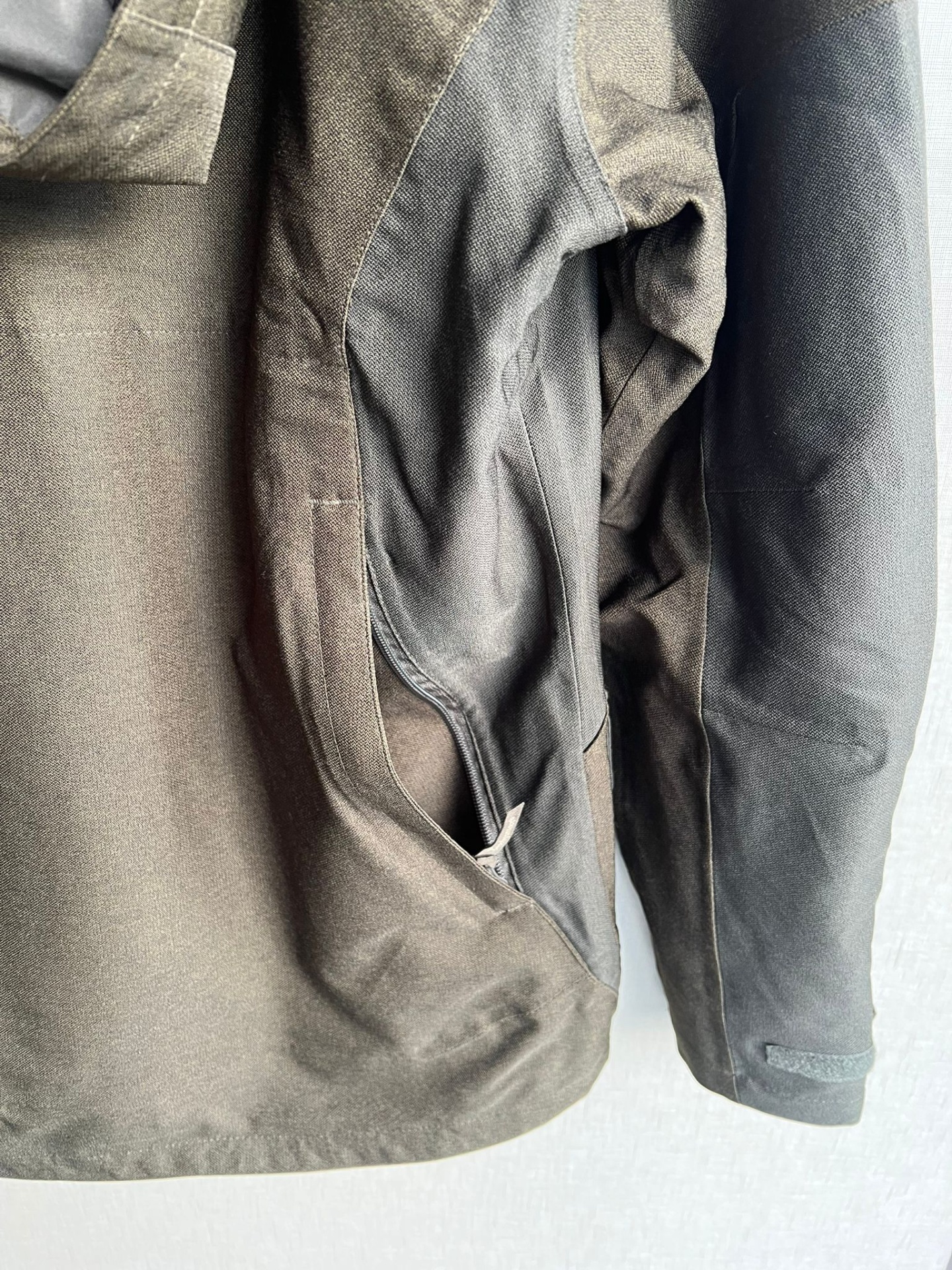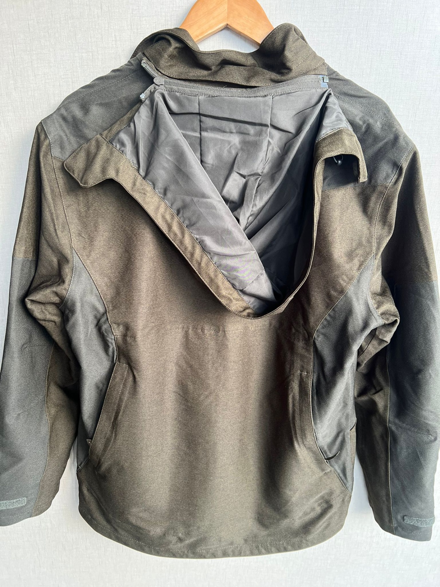 Casaco desportivo cinza e verde-oliva com forro interior cinzento e fechos na parte de trás e mangas