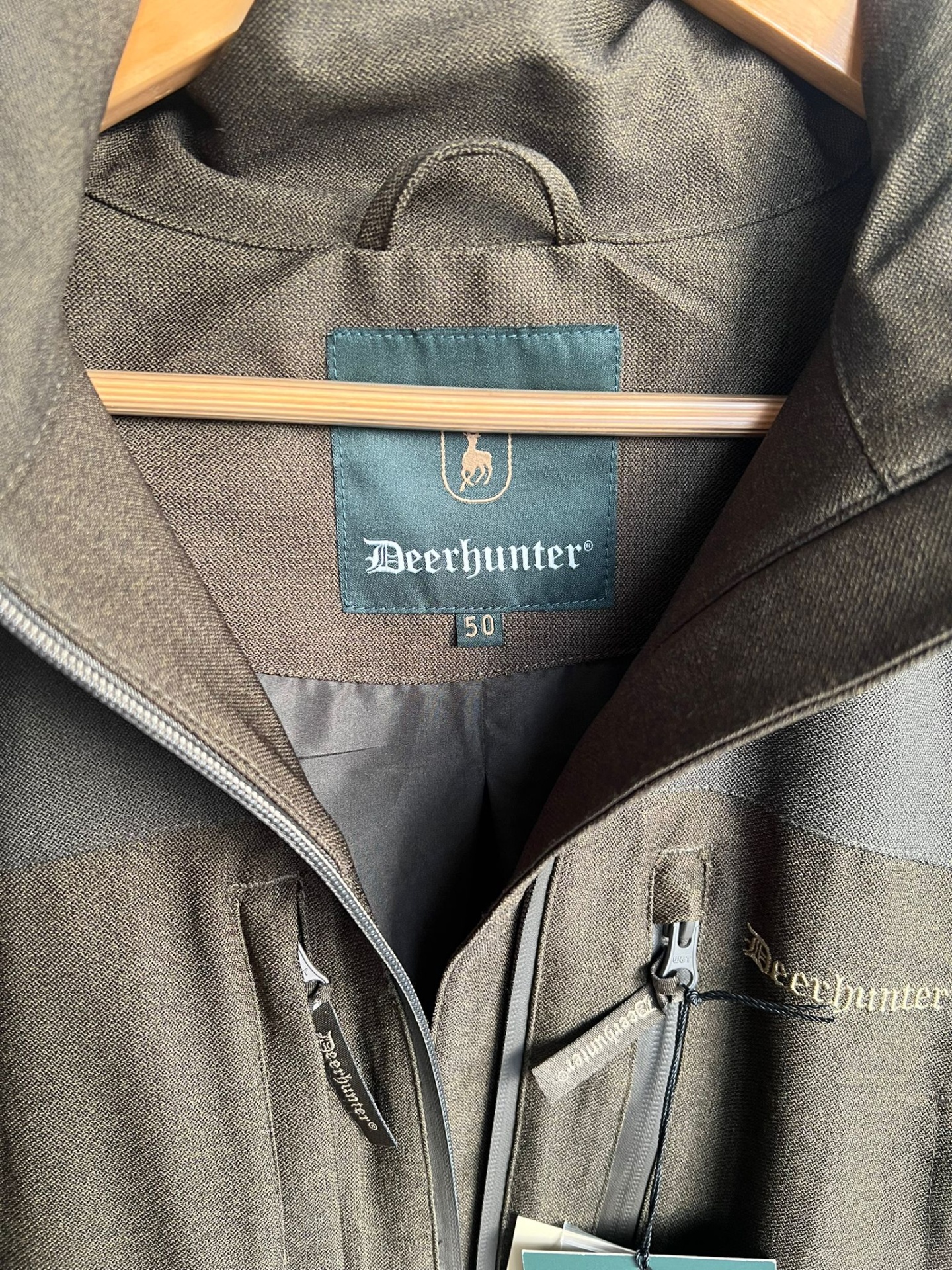 Casaco Deerhunter castanho com fecho de correr e etiqueta da marca