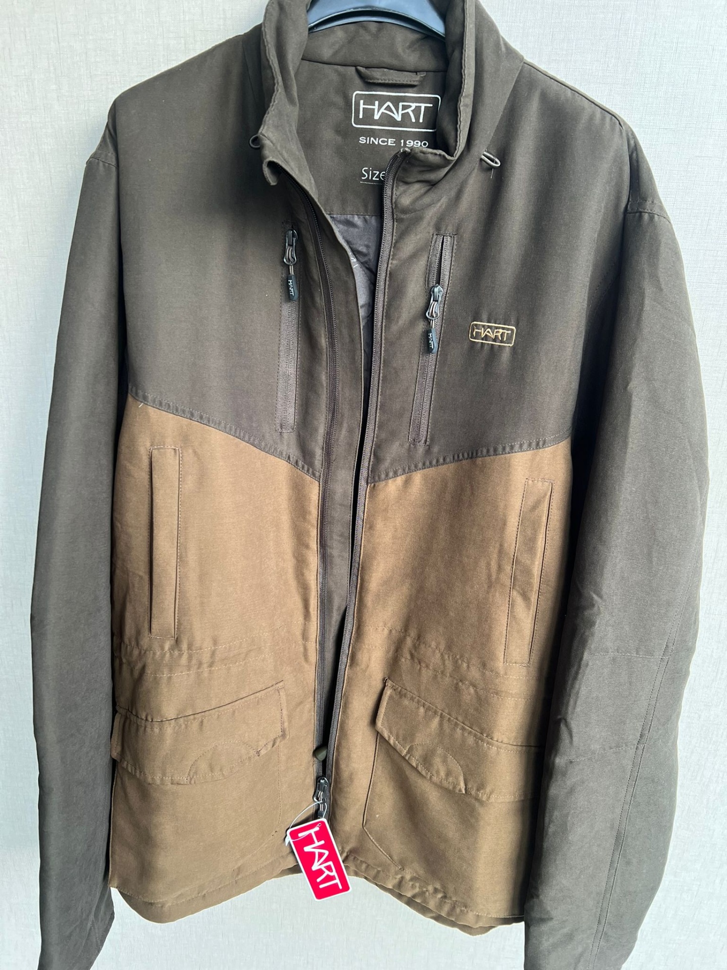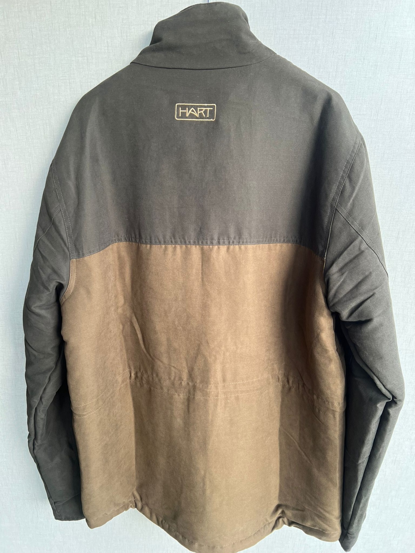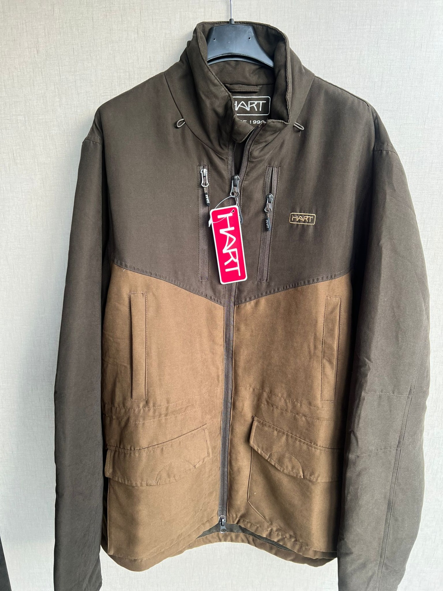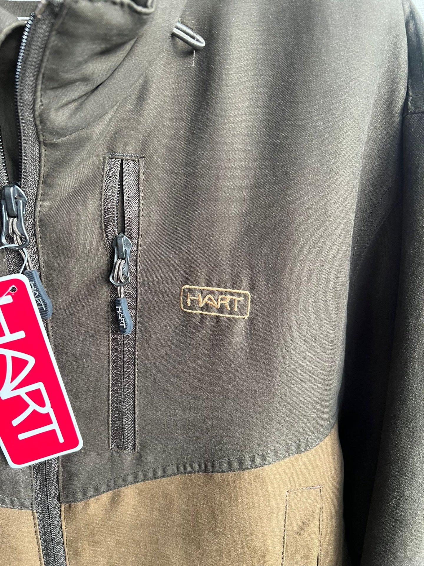 Casaco castanho escuro e claro com fecho e etiquetas HART pendurado num cabide preto