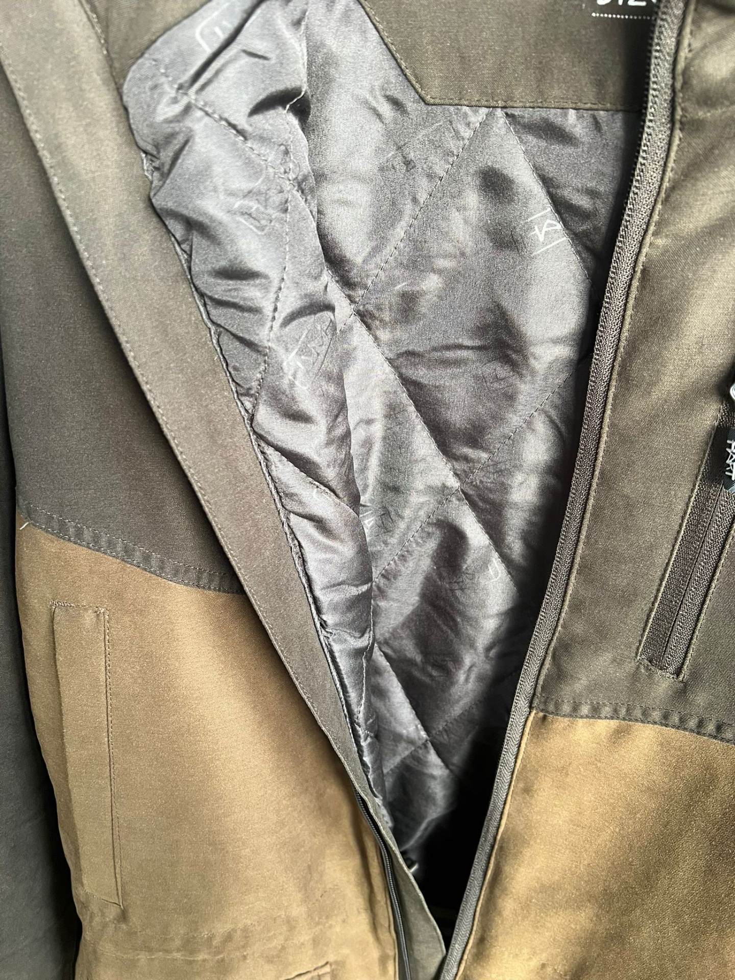 Casaco castanho e verde-oliva com bolso e etiqueta vermelha HART