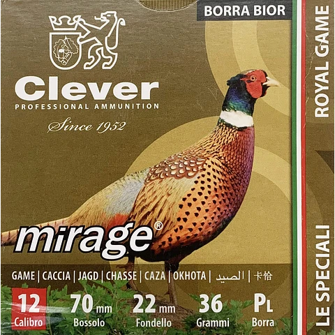 Embalagem de munição Clever mirage com imagem de faisão e detalhes técnicos