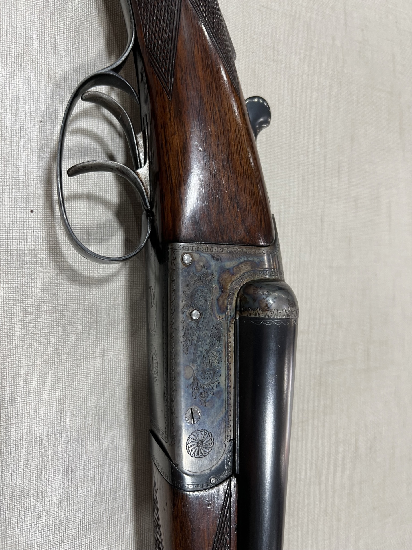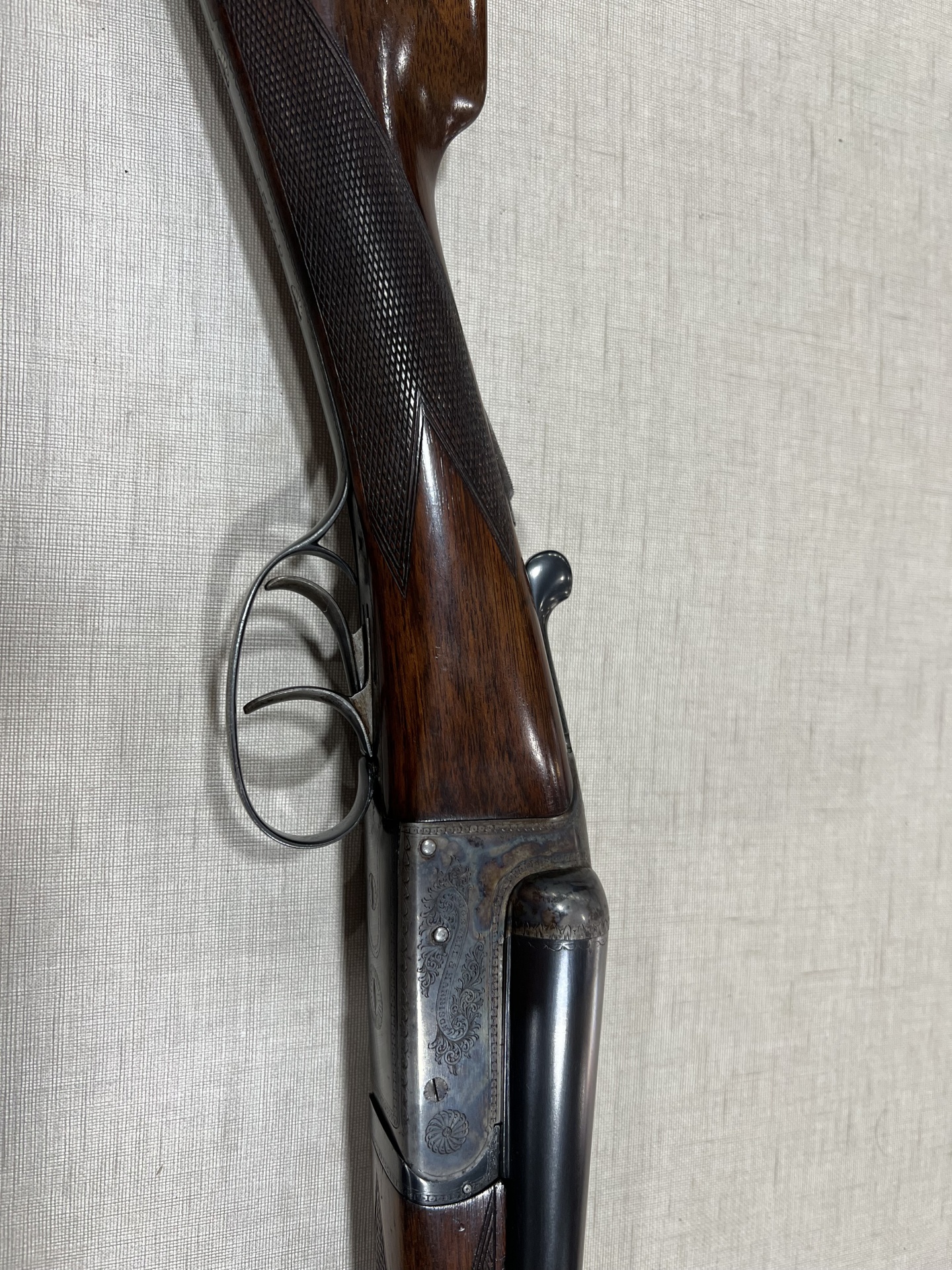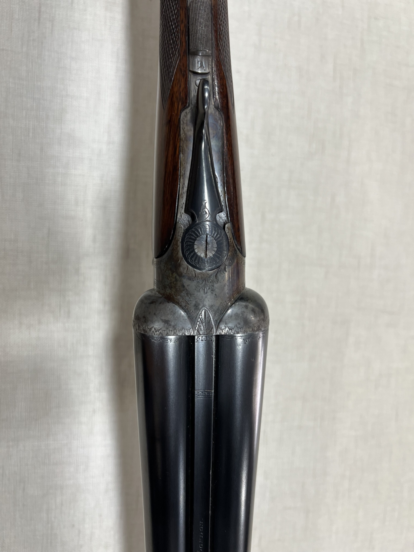Espingarda de canos paralelos com cabo em madeira castanha e metal escurecido gravado sobre fundo cinzento