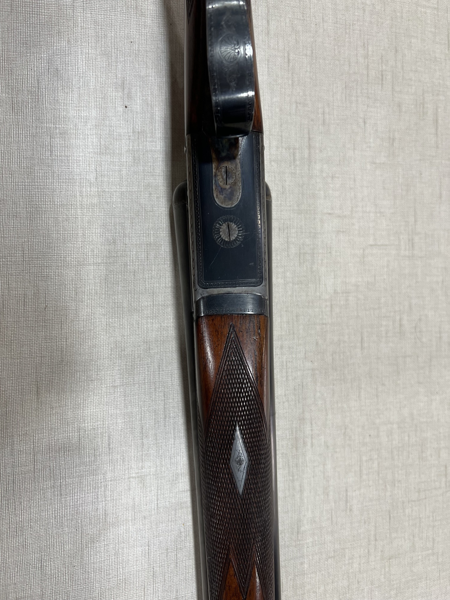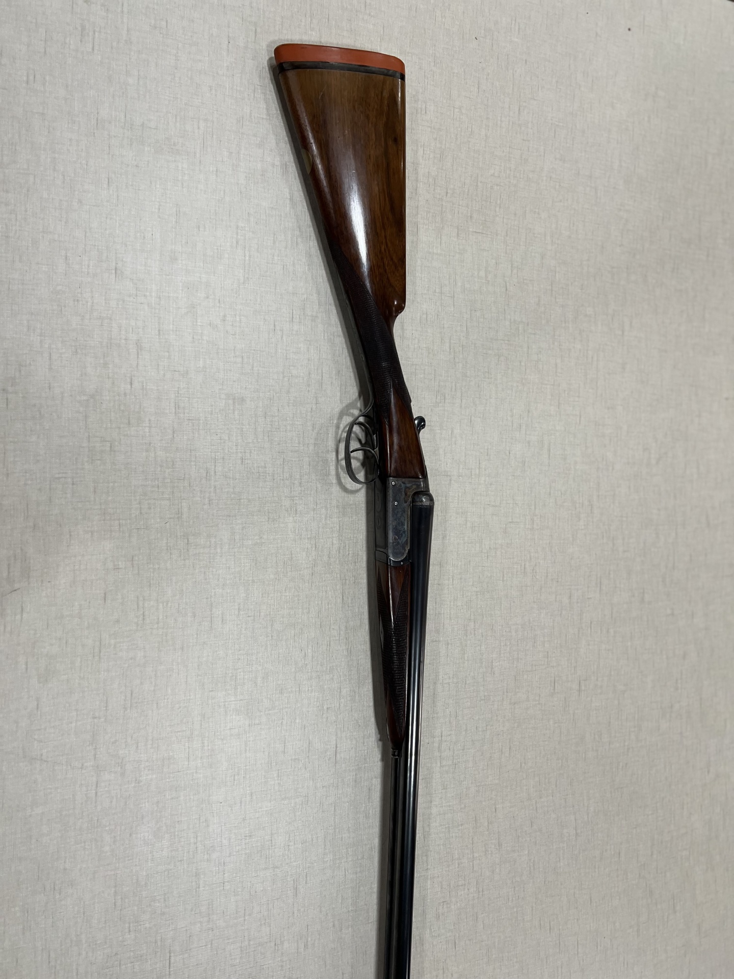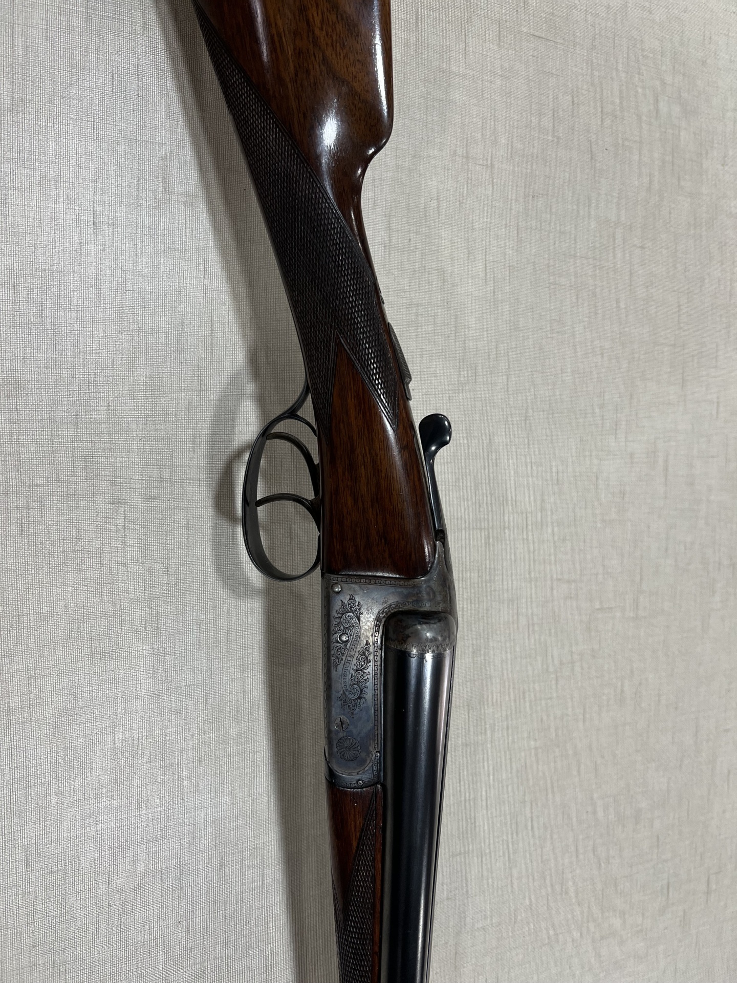 Espingarda de canos paralelos com cabo em madeira castanha e metal escurecido gravado sobre fundo cinzento