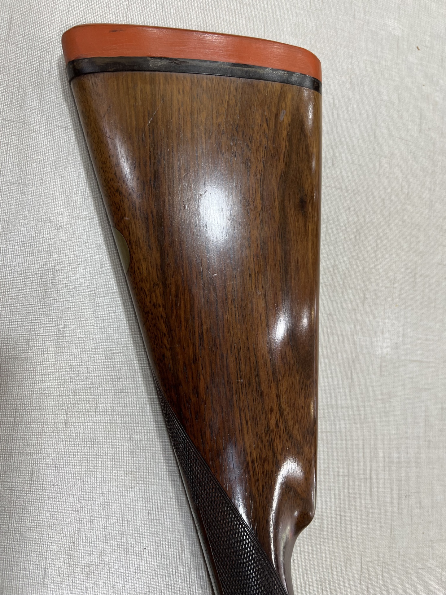 Cabo de espingarda em madeira com borracha vermelha e detalhe preto sobre tecido bege.