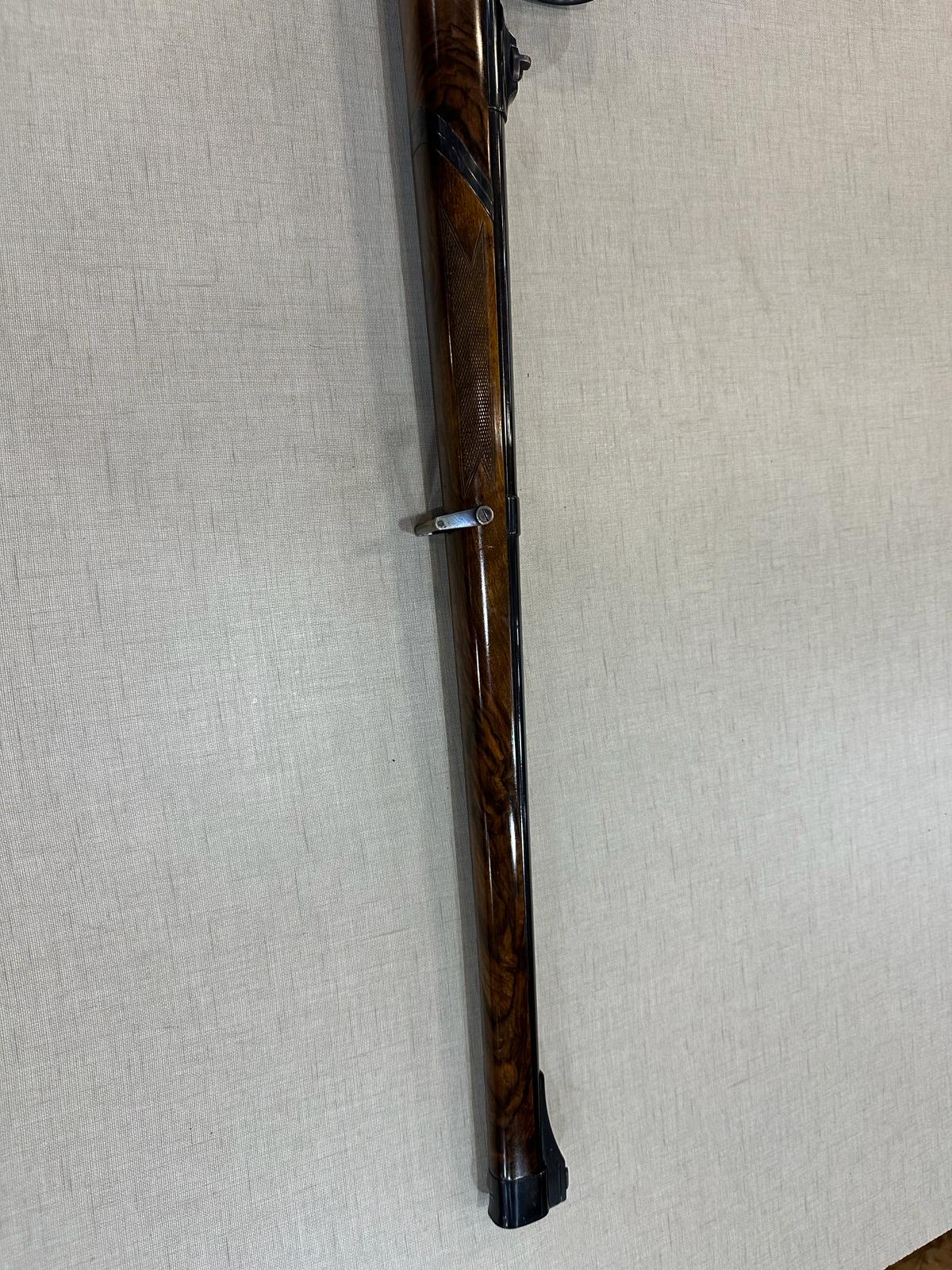 Arma longa de madeira escura com detalhes metálicos