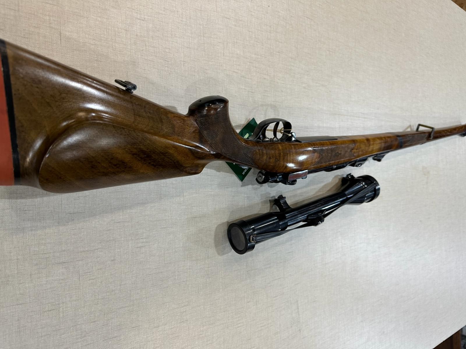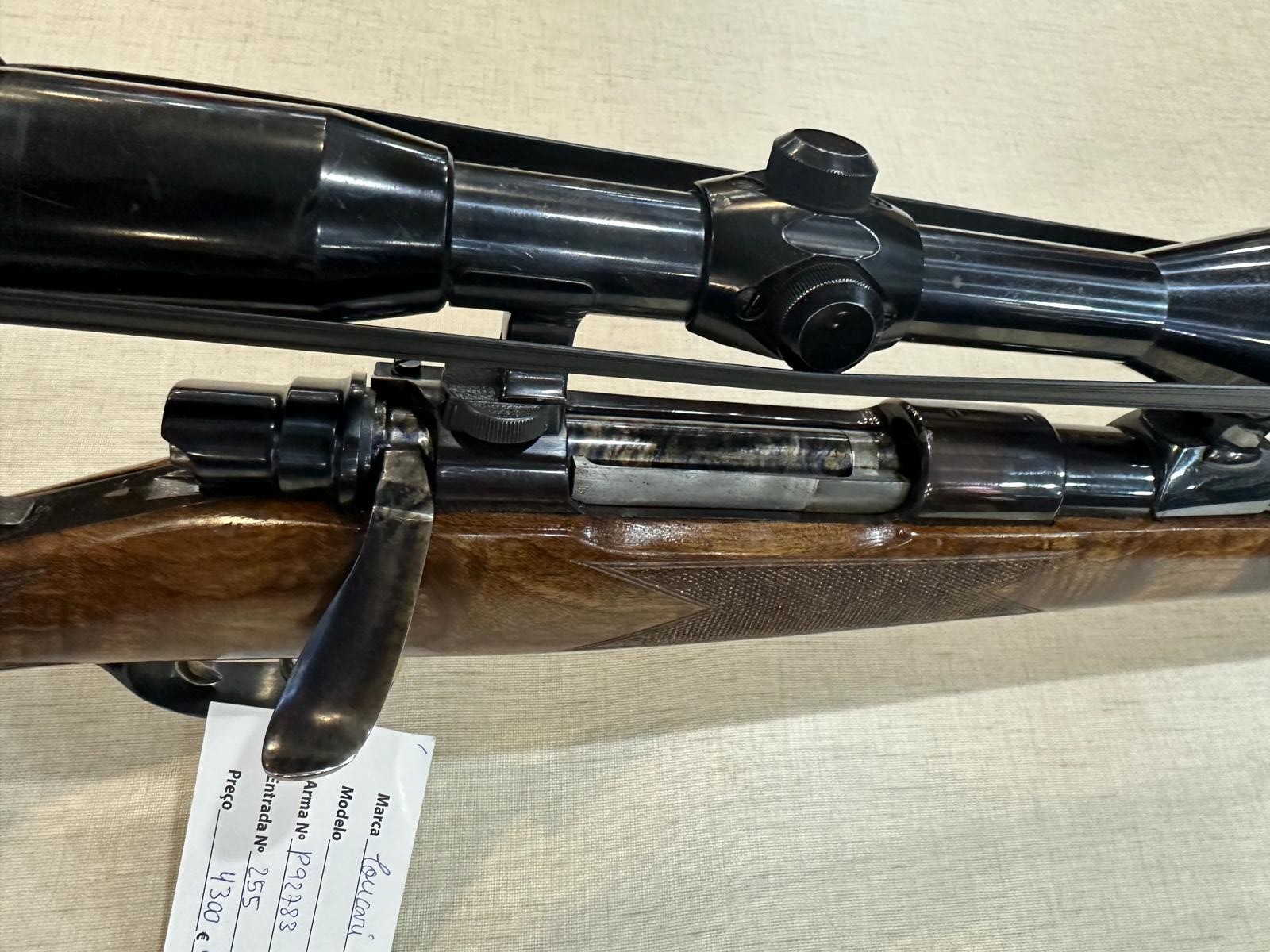 Espingarda de madeira e metal com luneta preta sobre fundo bege