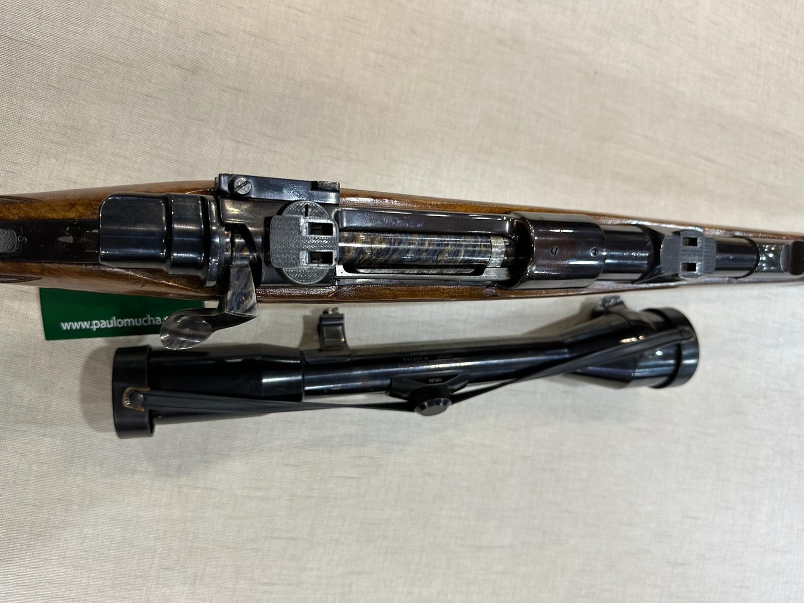 Rifle em madeira castanha com bipé preto sobre superfície clara