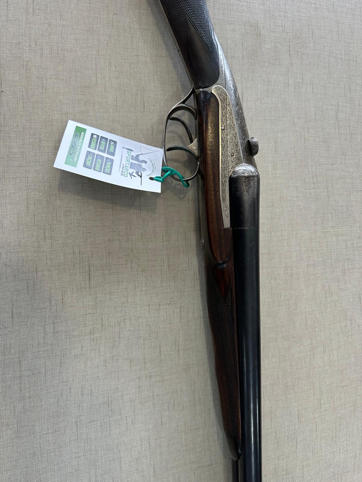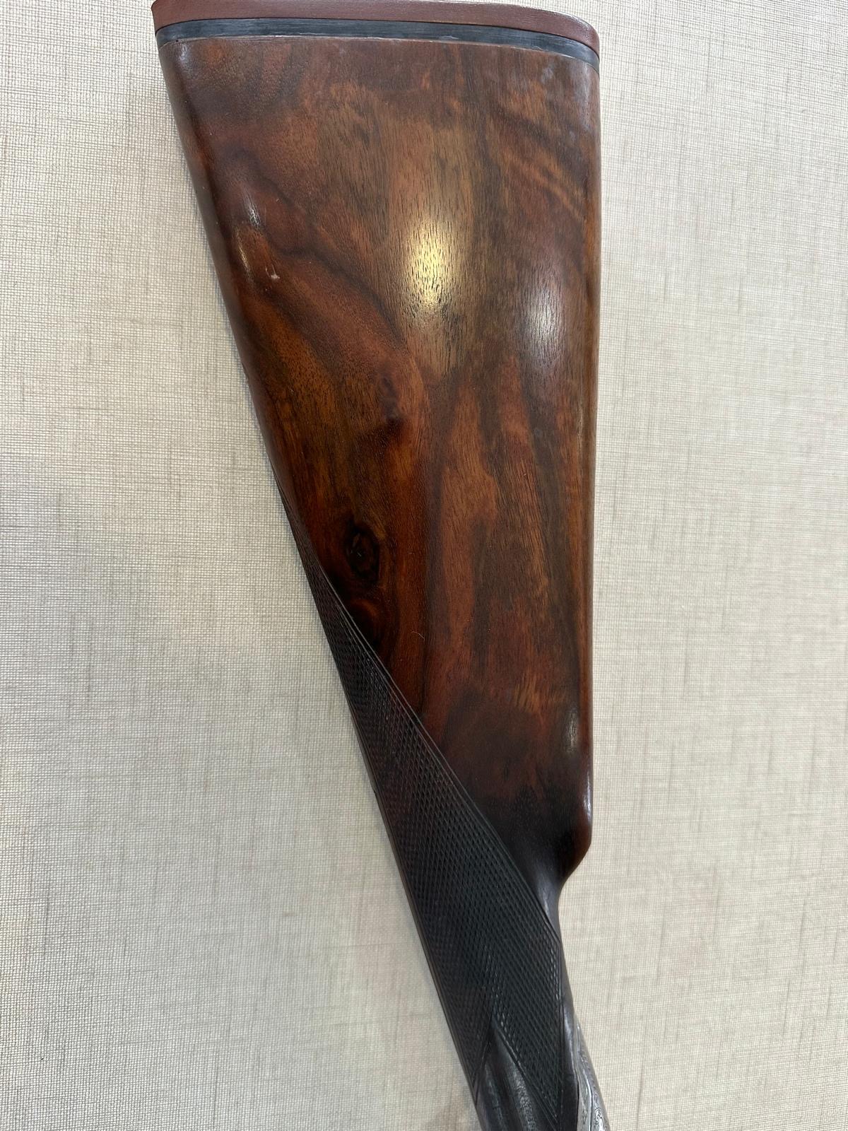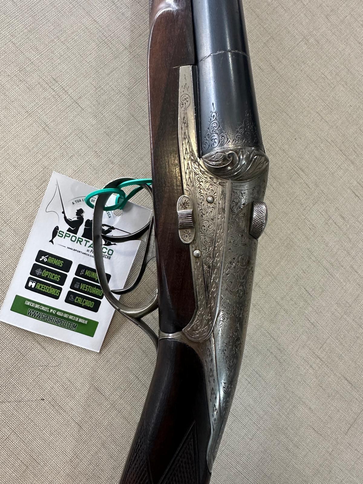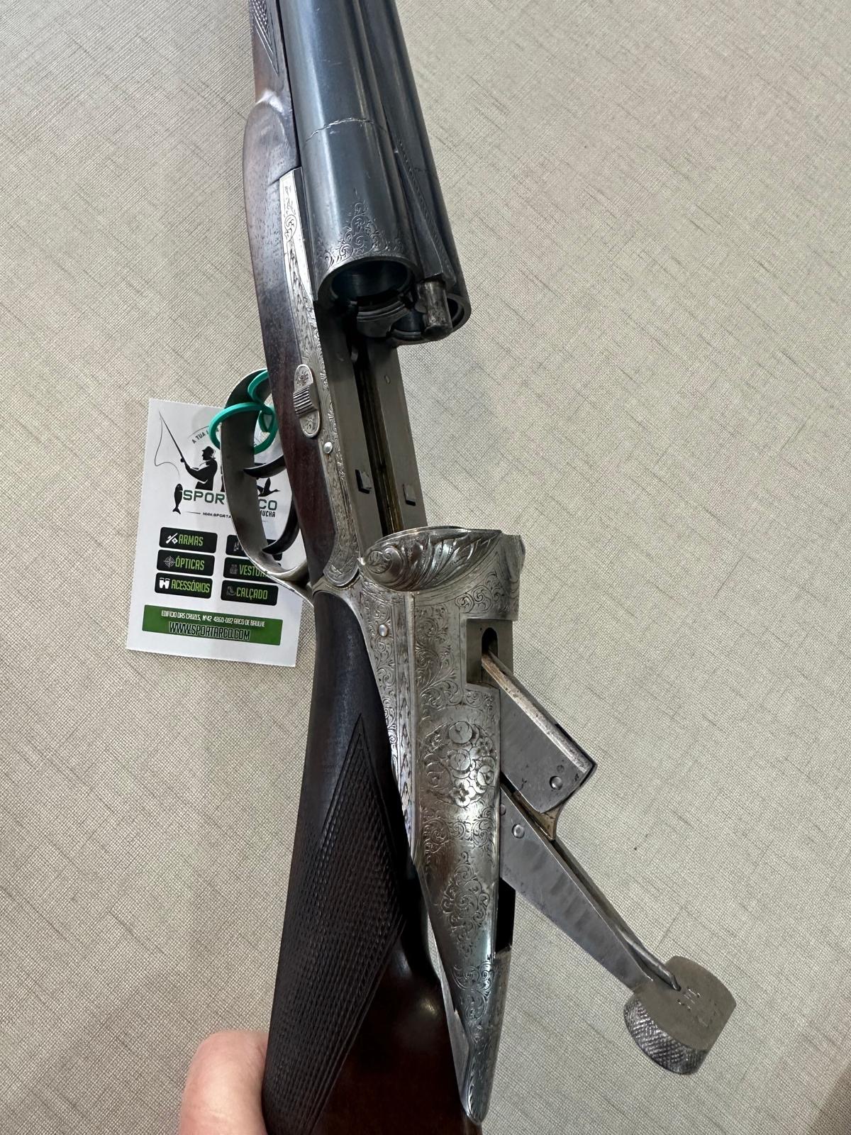 Espingarda de canos duplos com cabo de madeira e armação metálica gravada