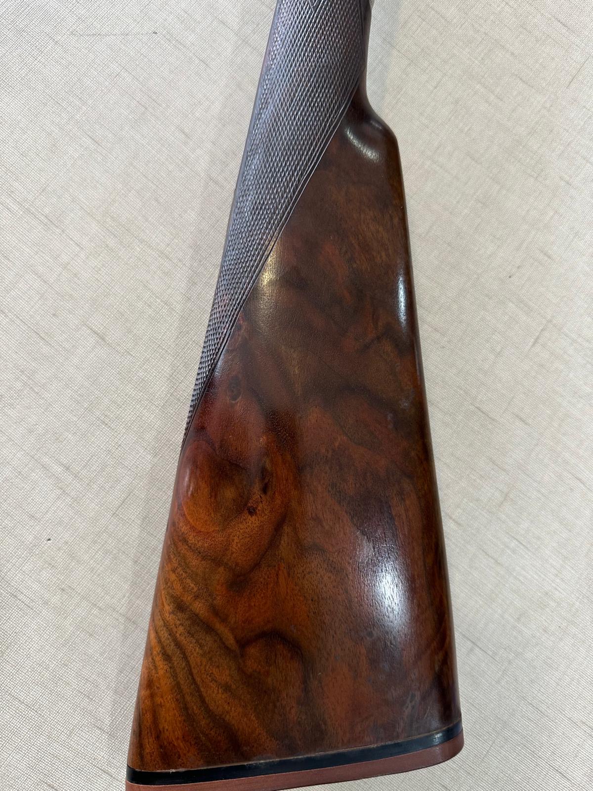 Coronha de espingarda em madeira castanha com parte inferior texturizada cinza escura