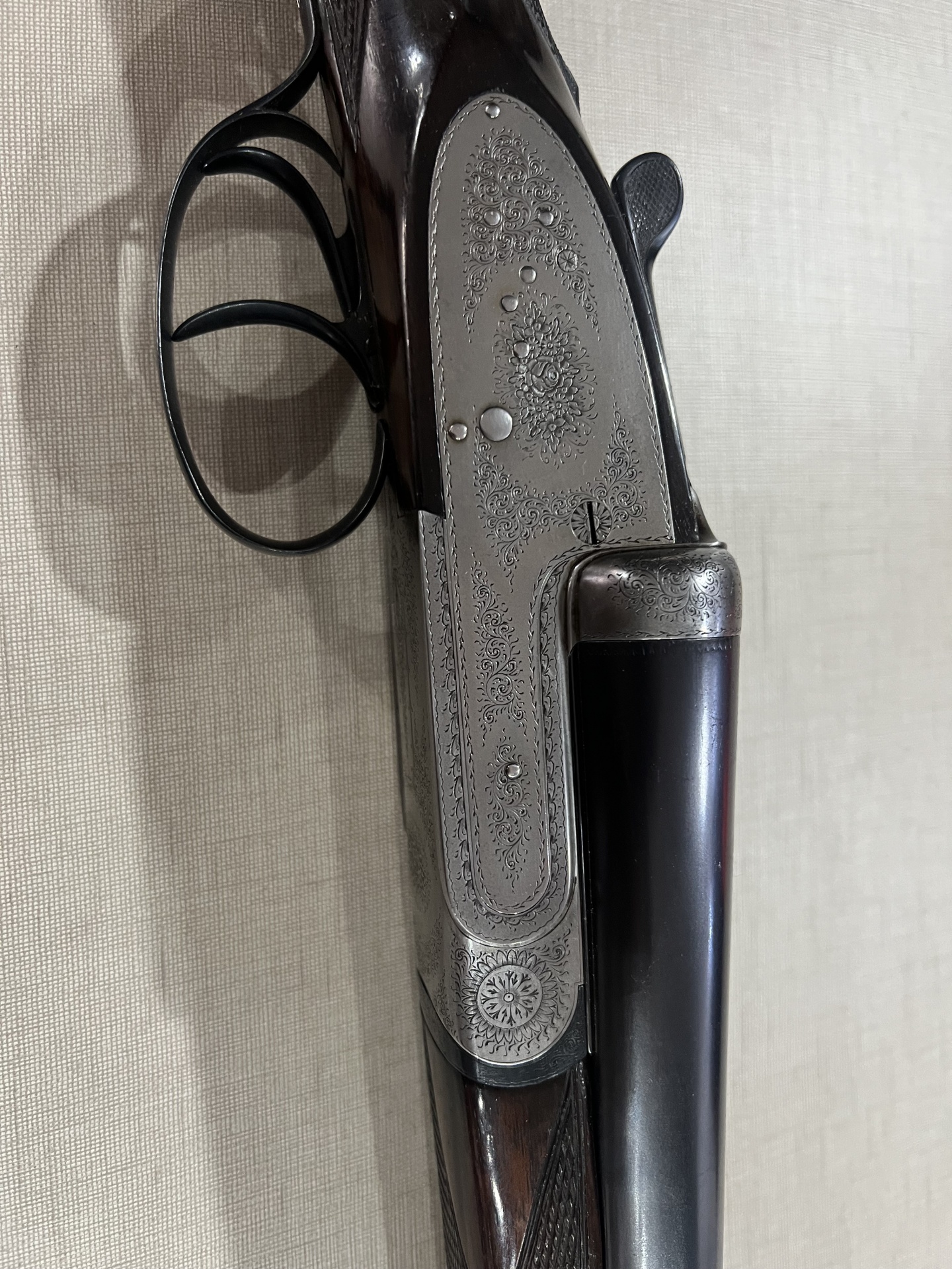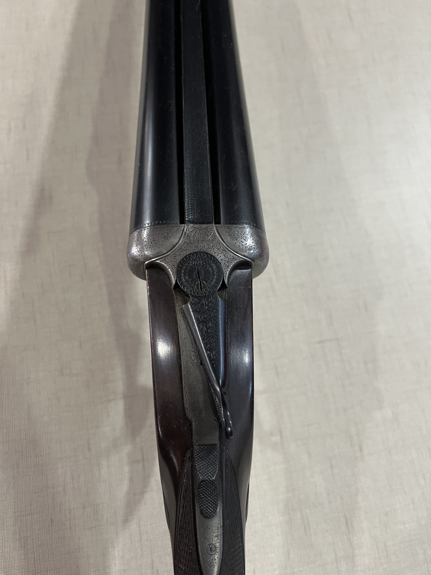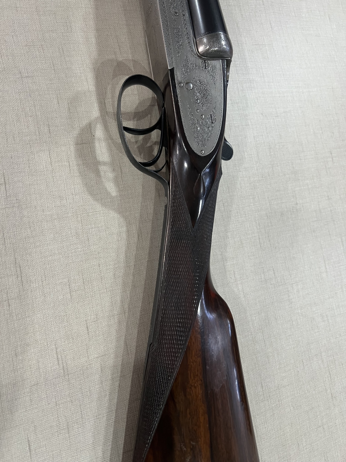 Parte de arma de cano duplo com madeira trabalhada e metal brilhante em tecido claro