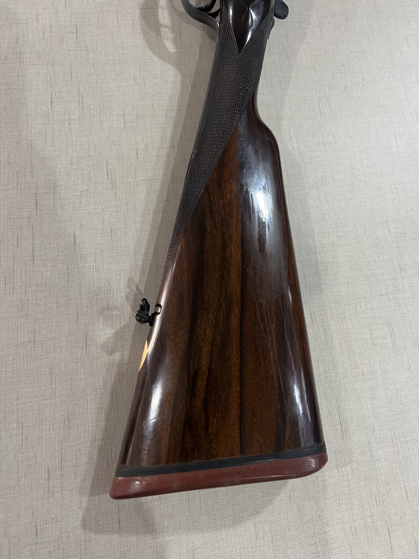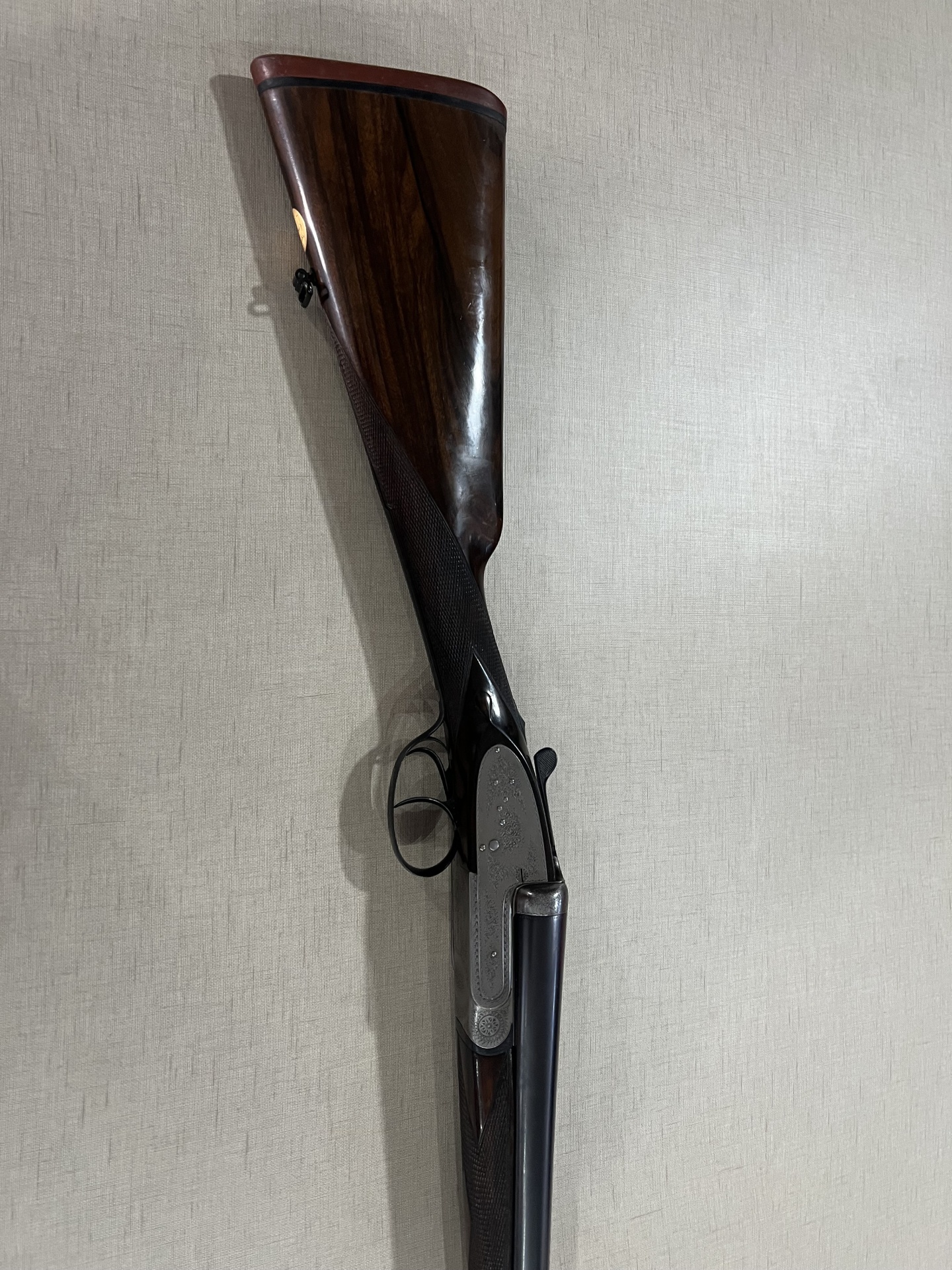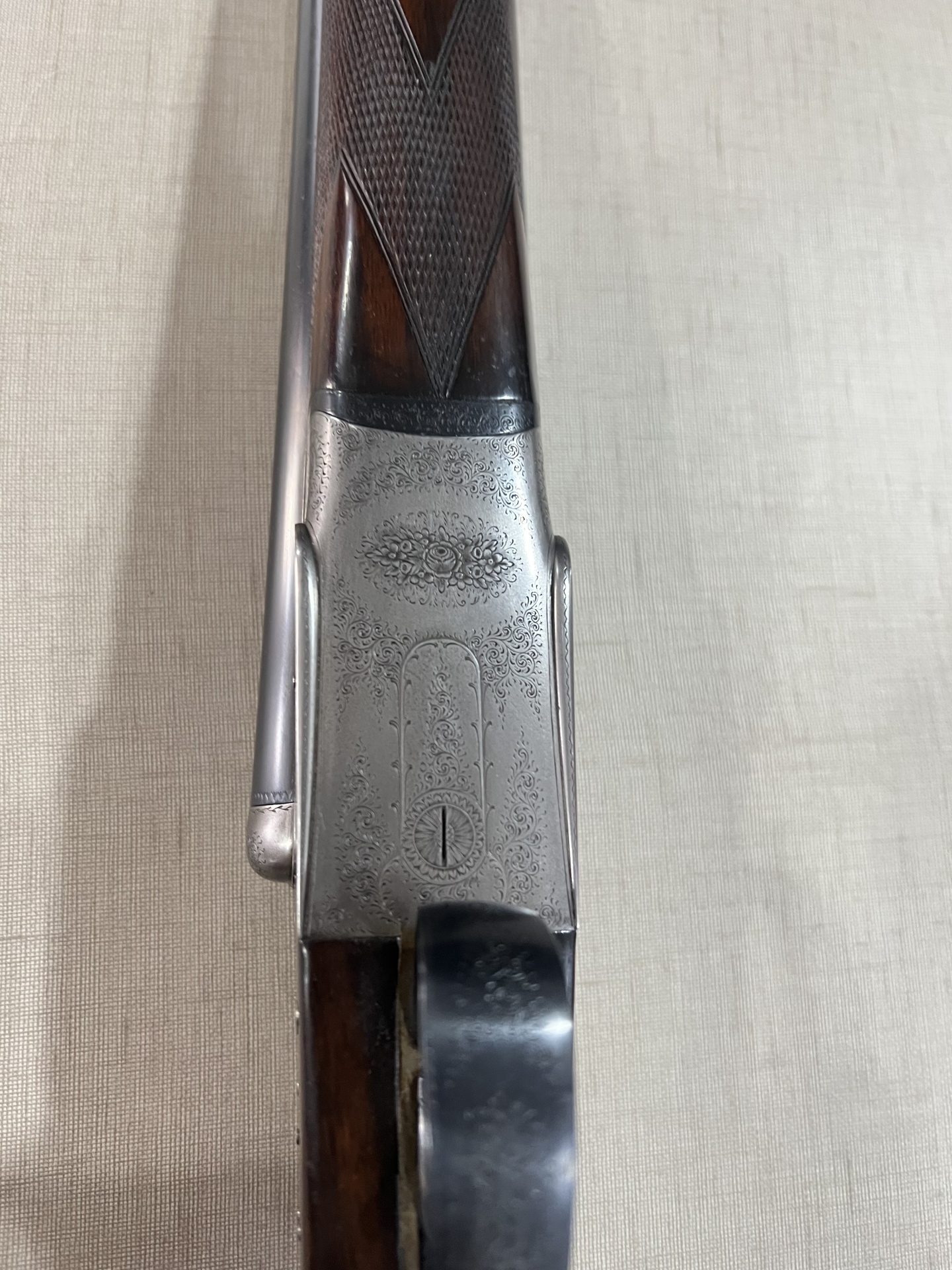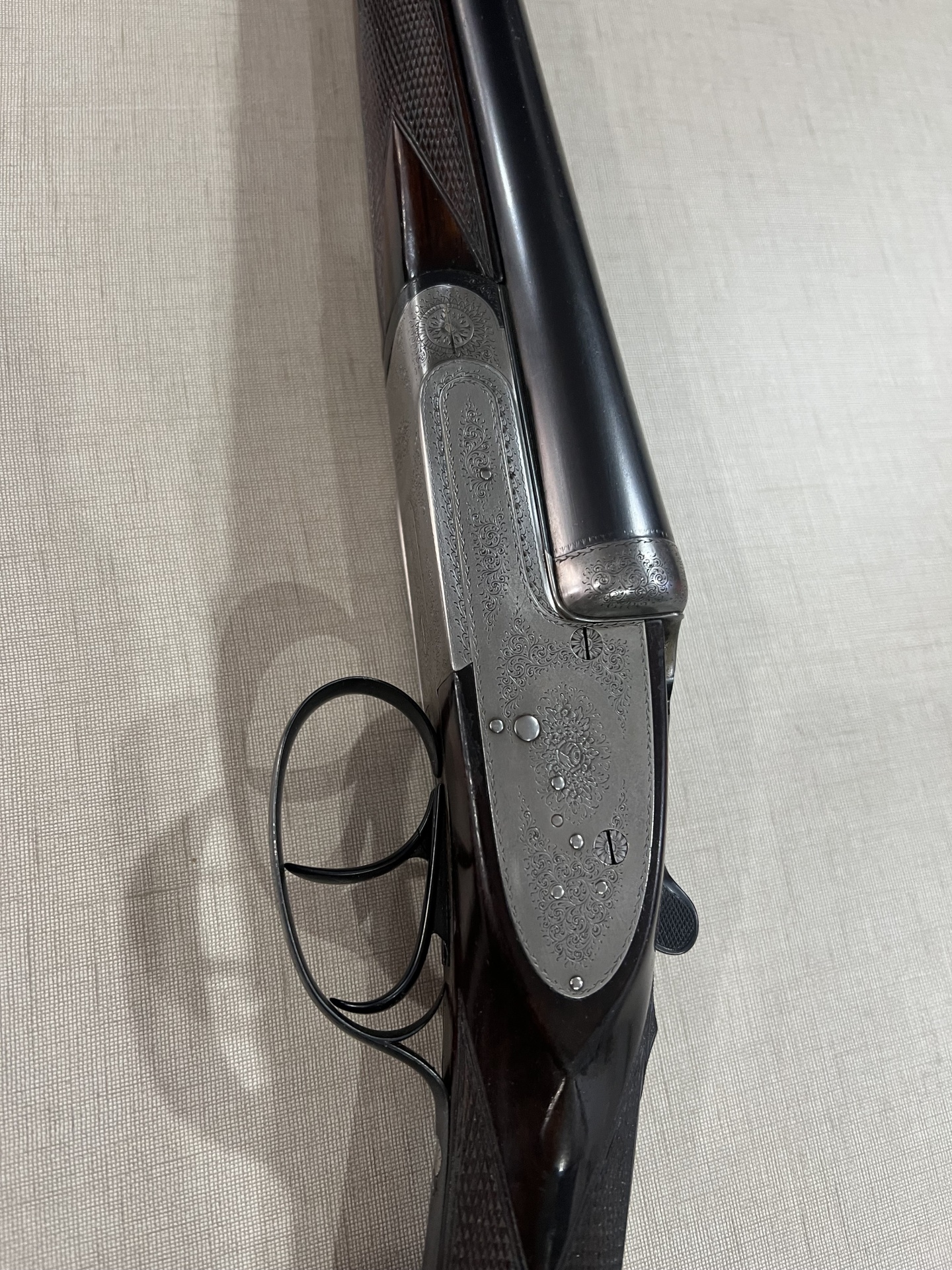 Parte de arma de cano duplo com madeira trabalhada e metal brilhante em tecido claro