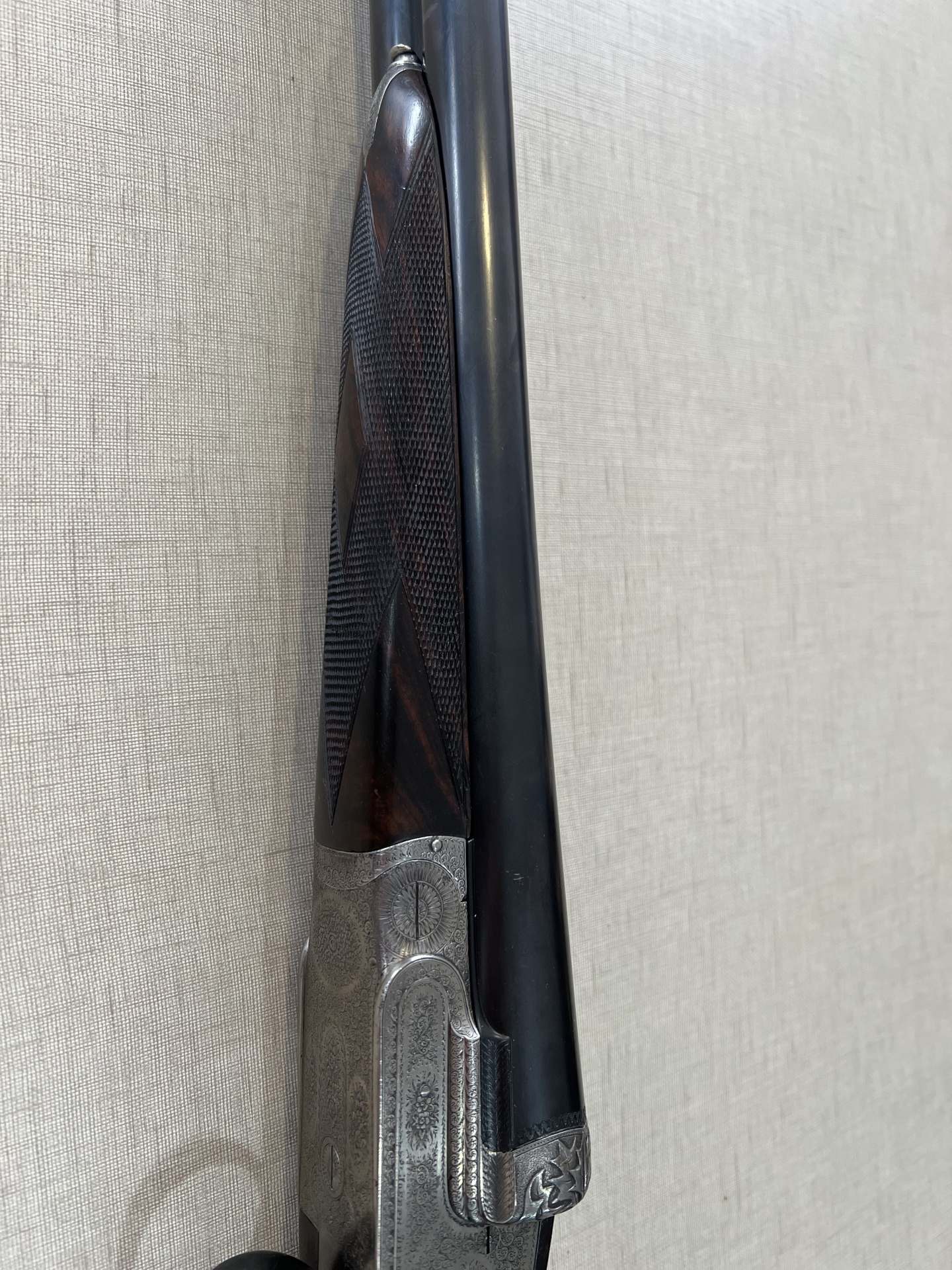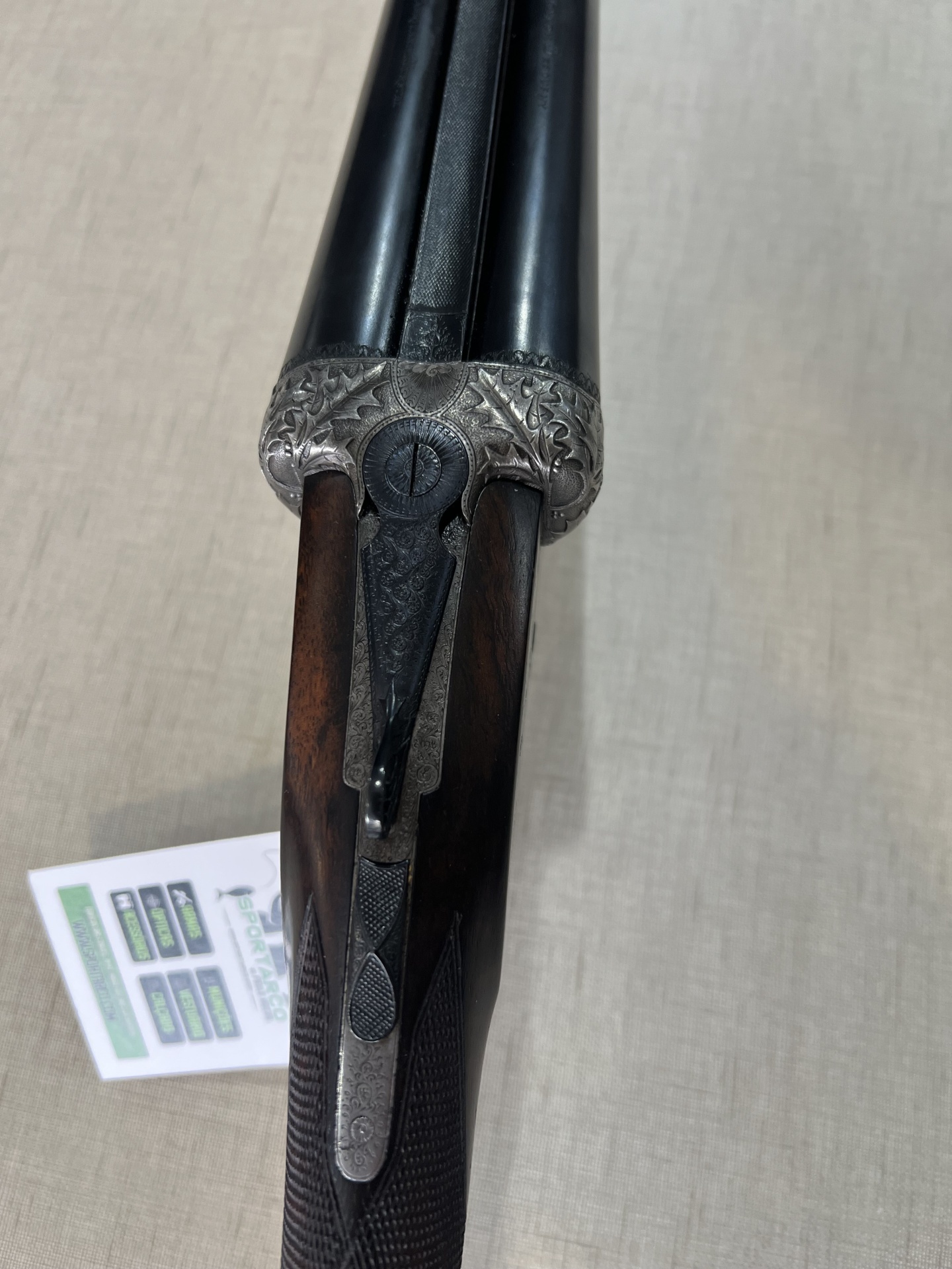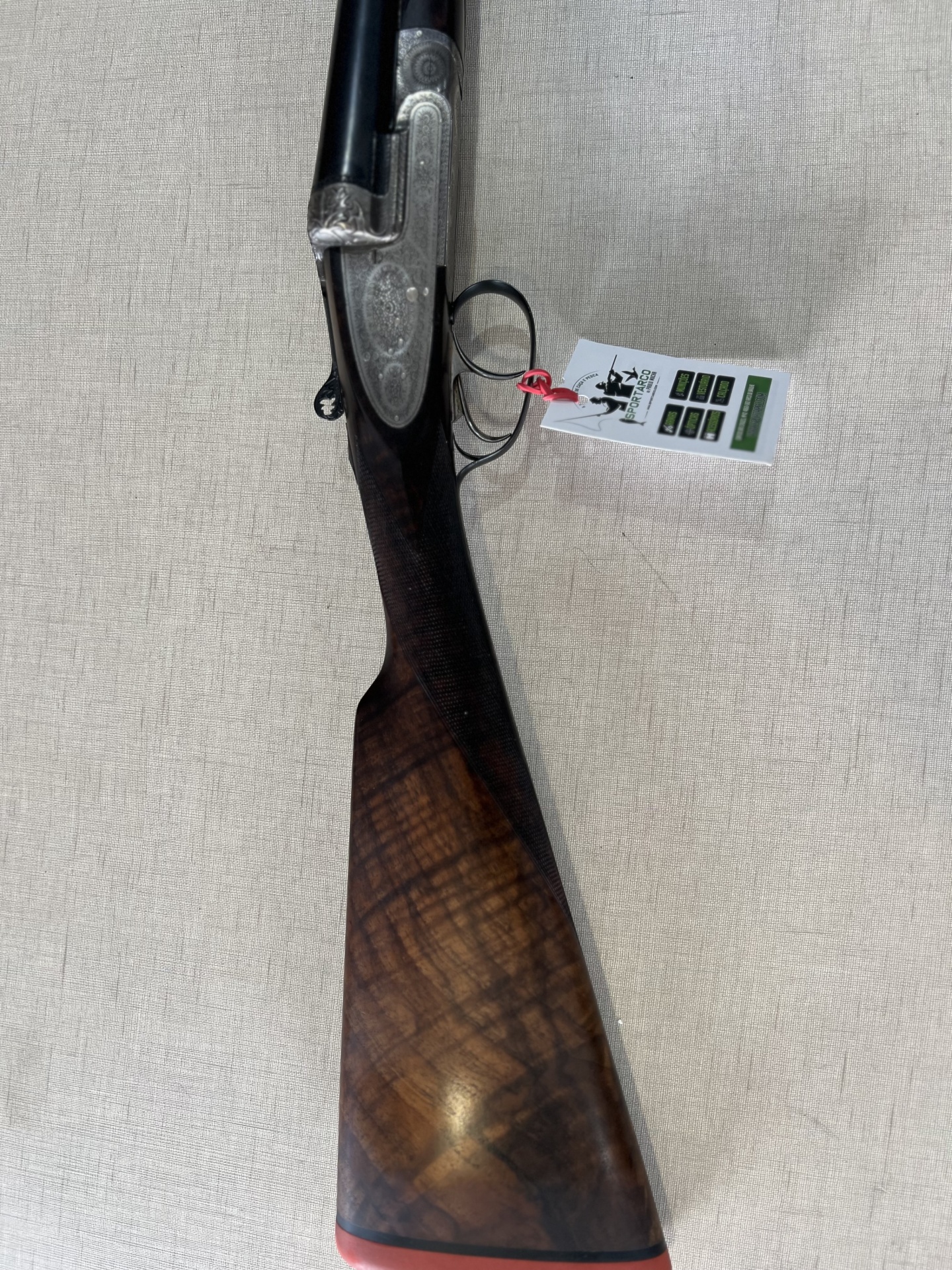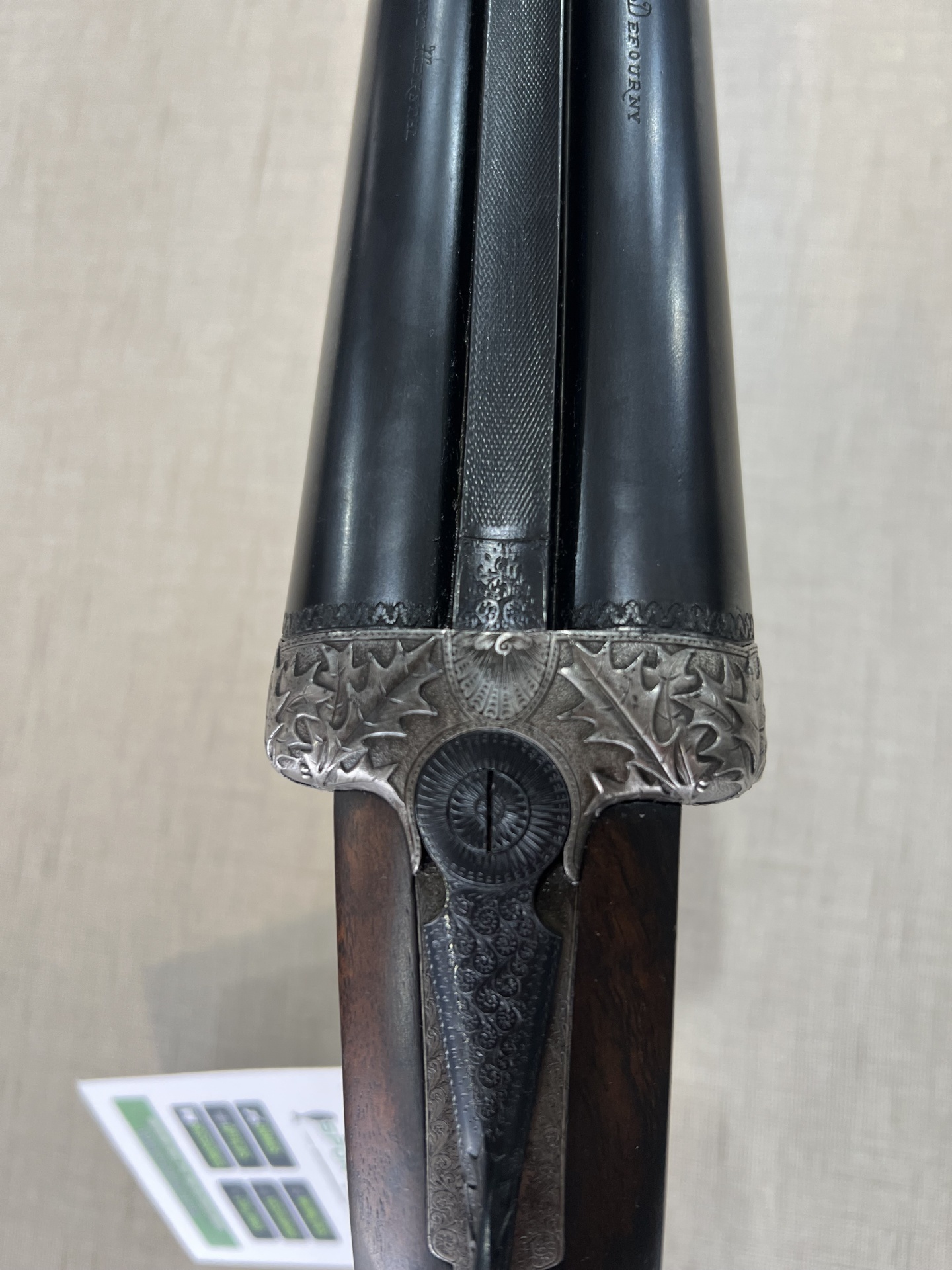 Espingarda de canos paralelos com madeira texturizada e detalhes metálicos