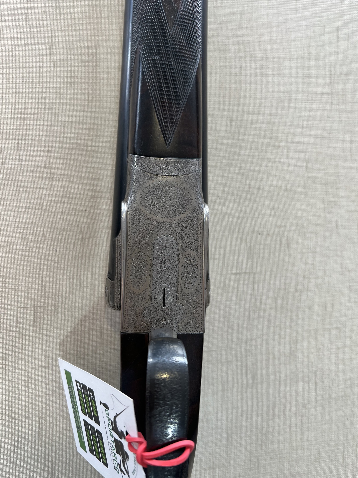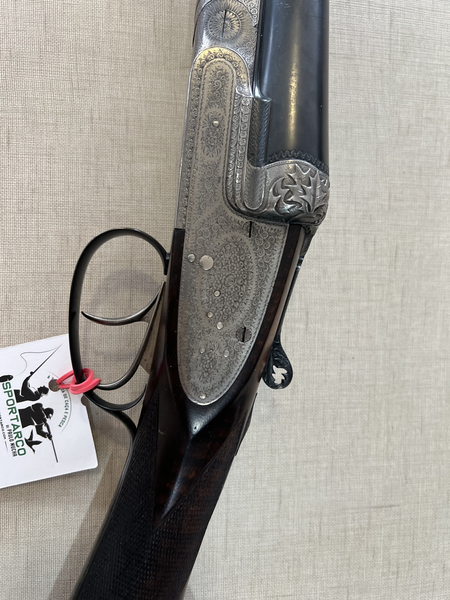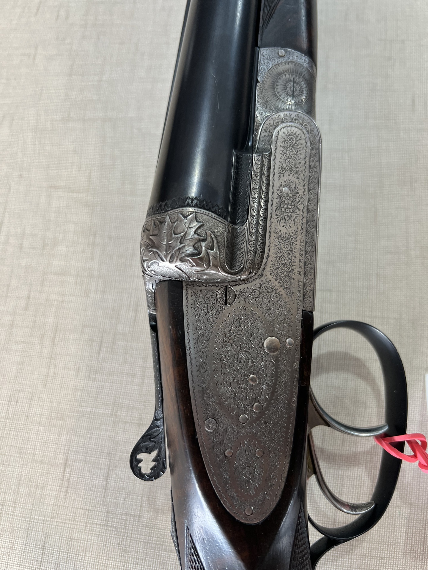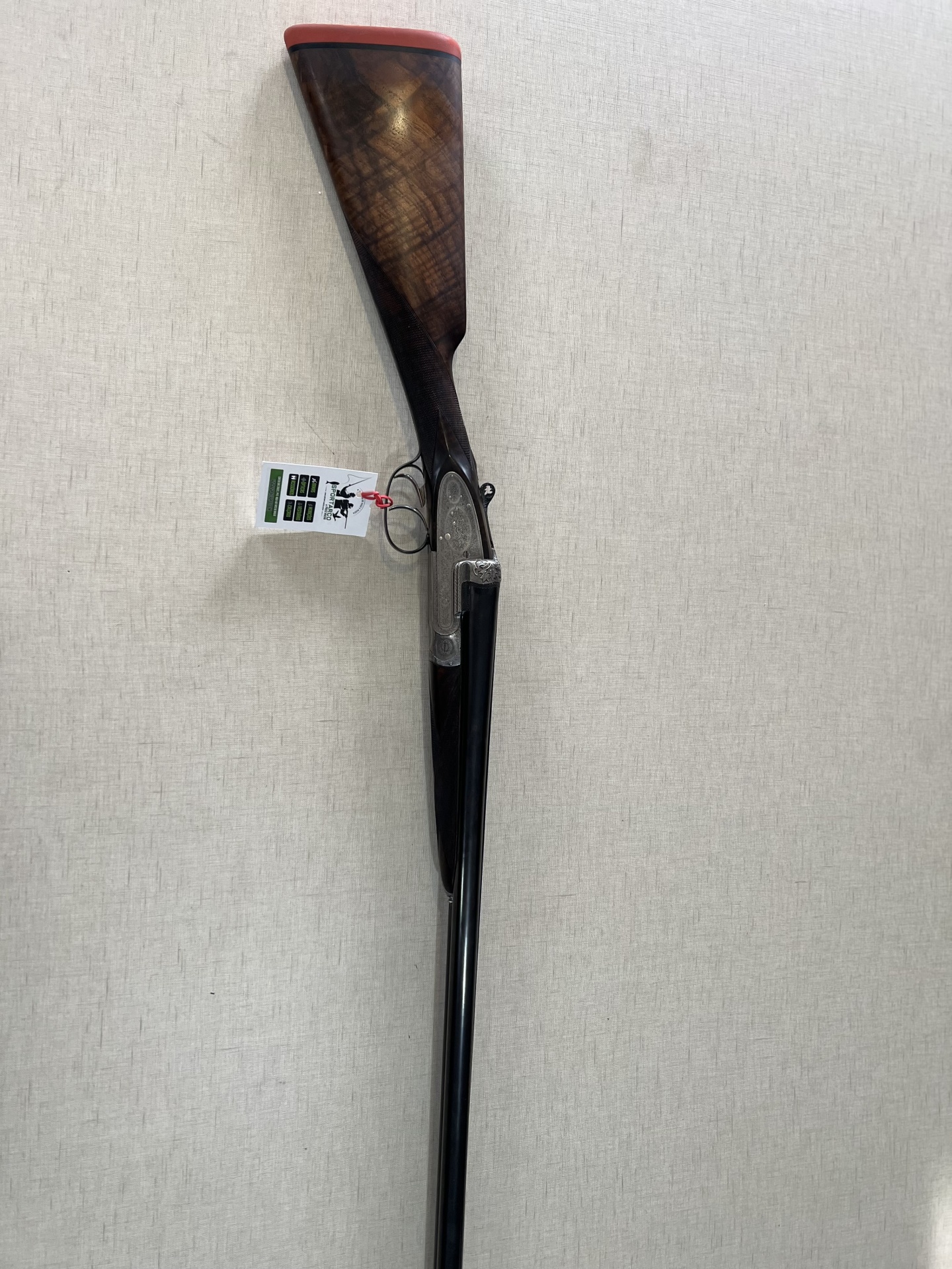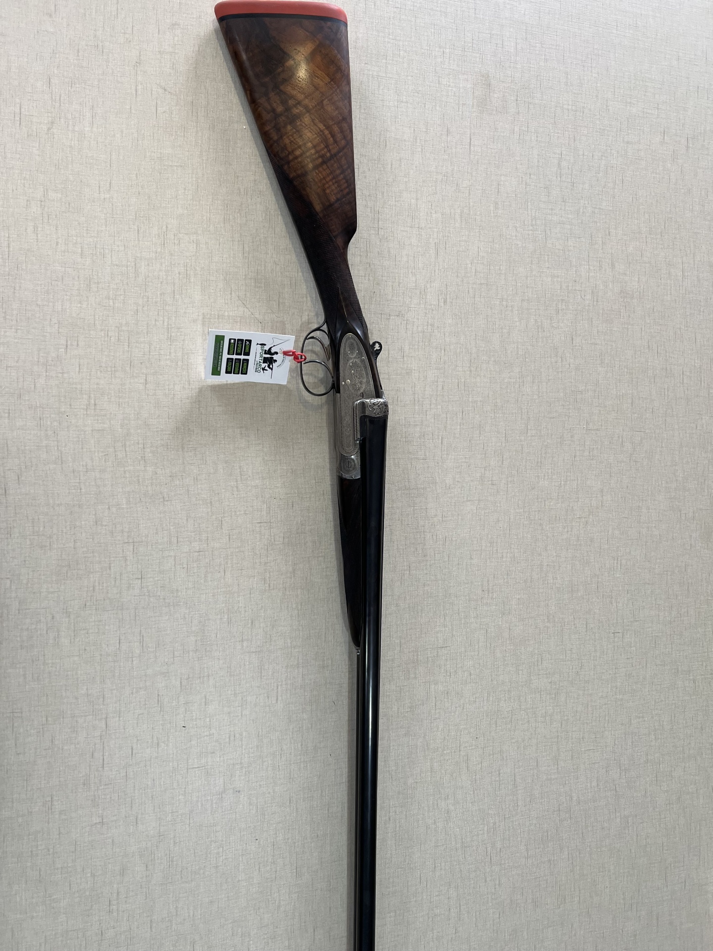 Espingarda de canos paralelos com madeira texturizada e detalhes metálicos