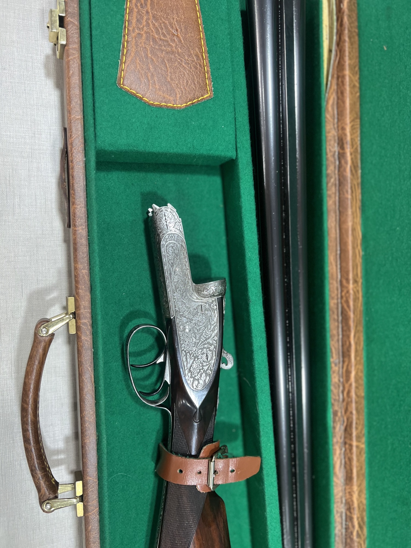 Espingarda dupla em estojo verde com detalhes em couro castanho