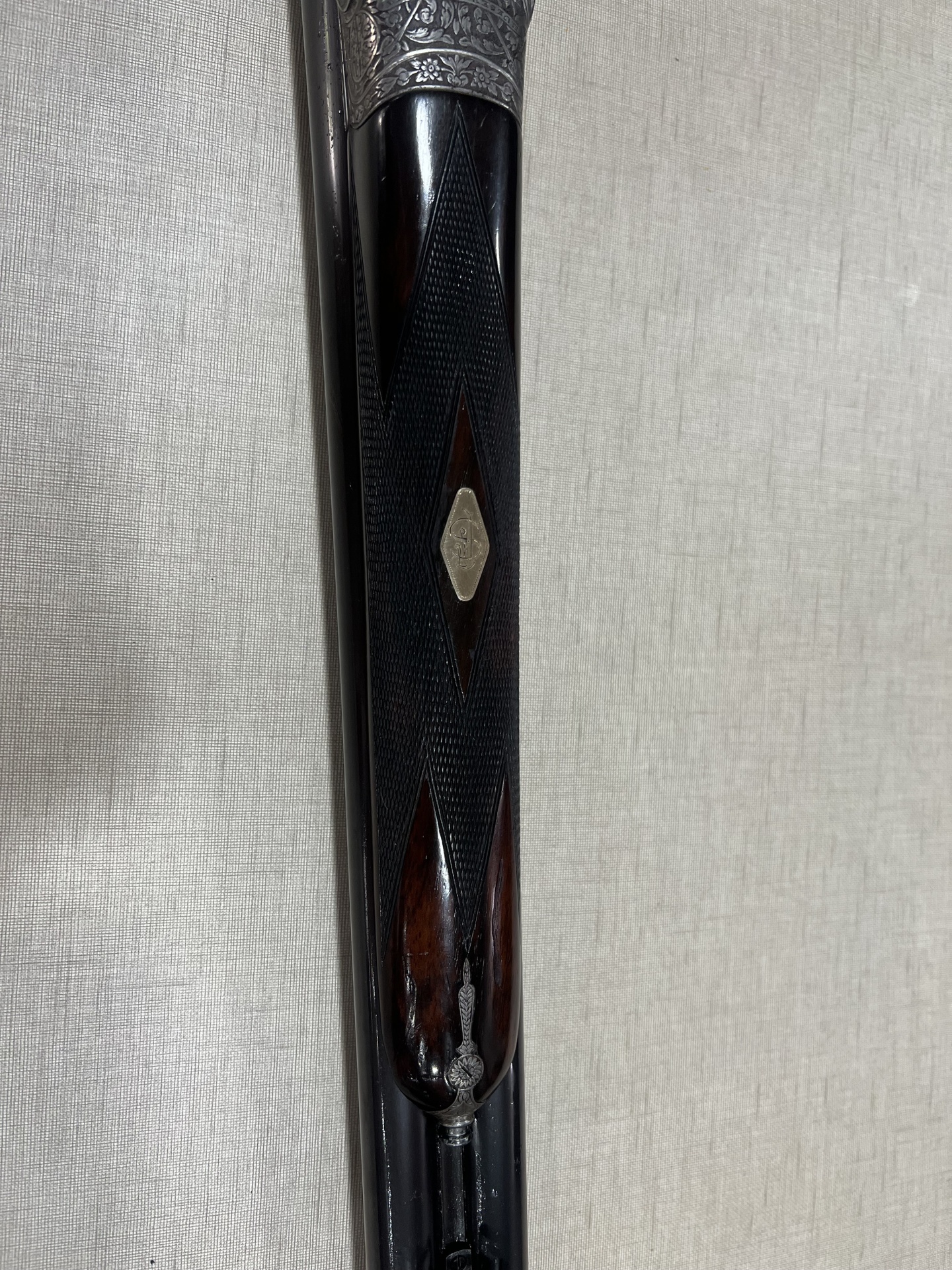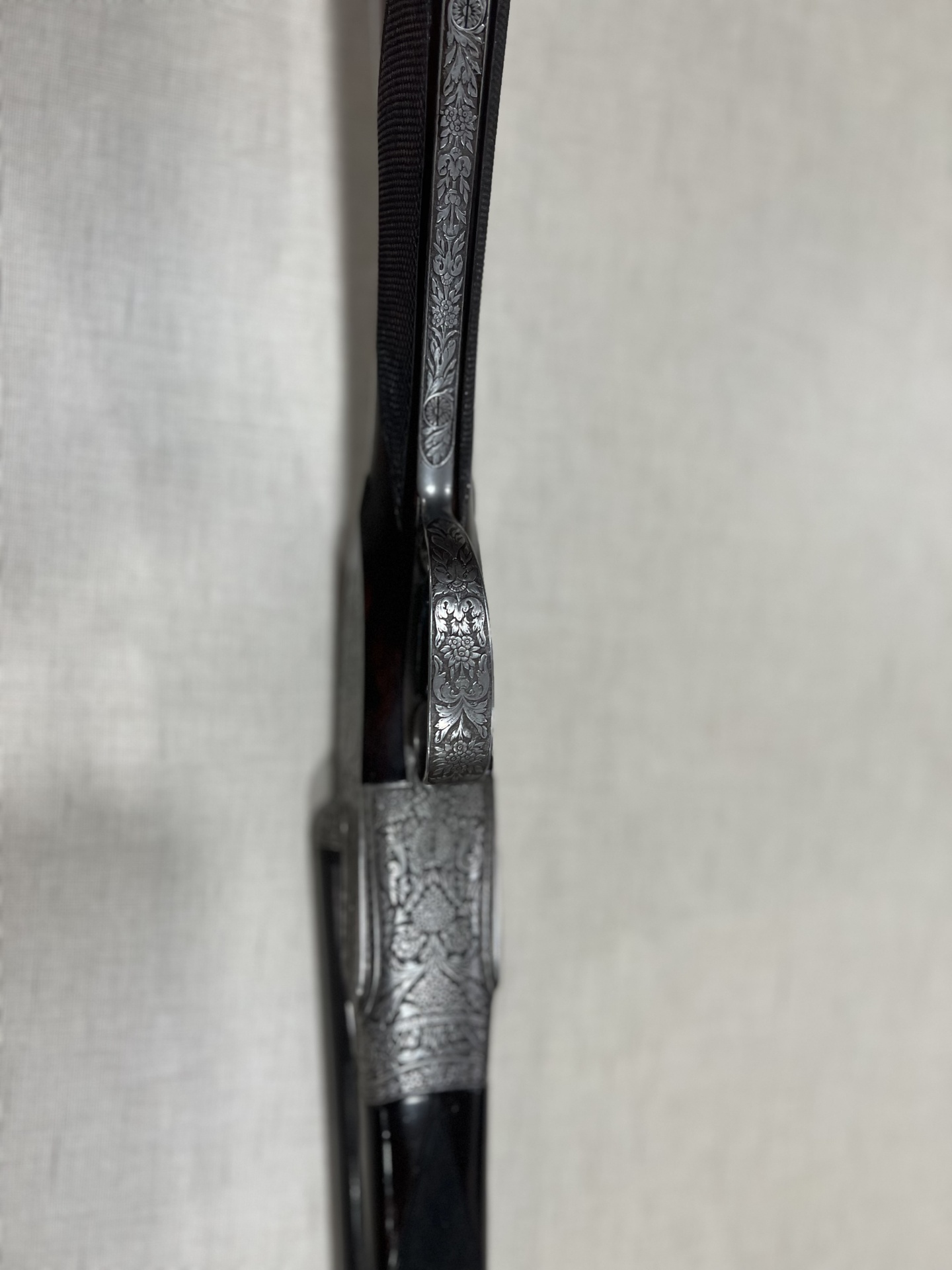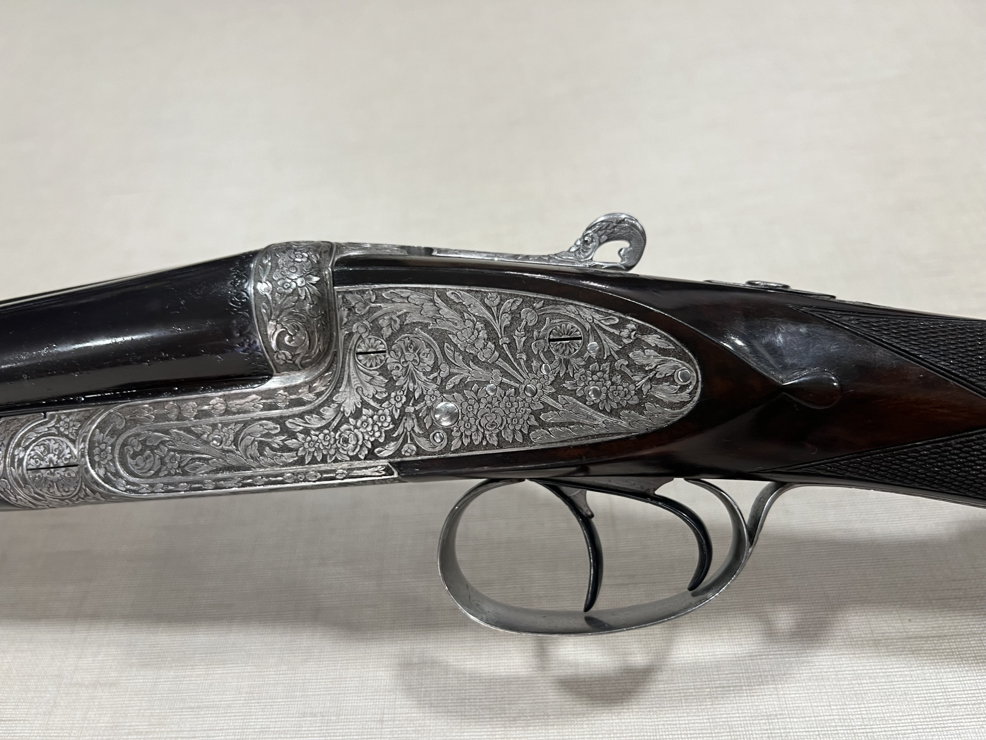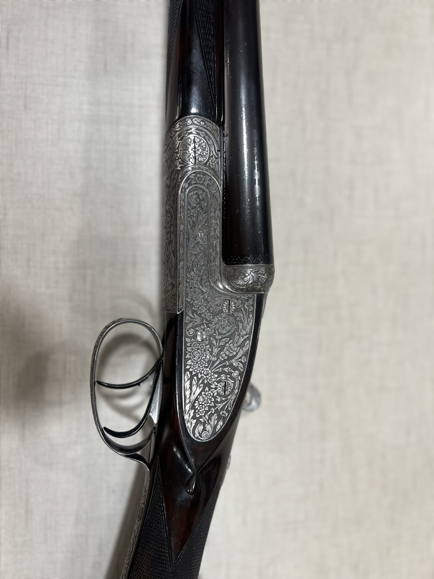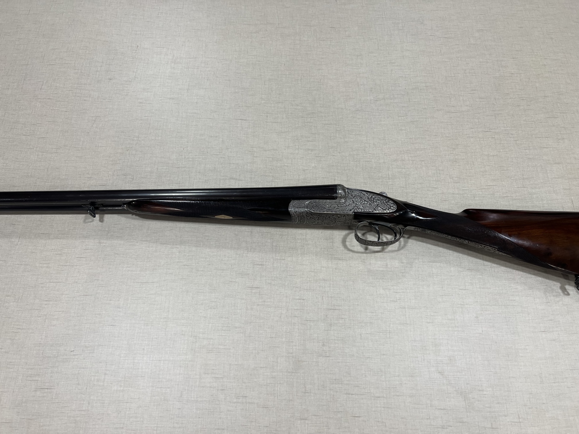 Espingarda de caça de cano duplo com cabo em madeira escura sobre tecido bege