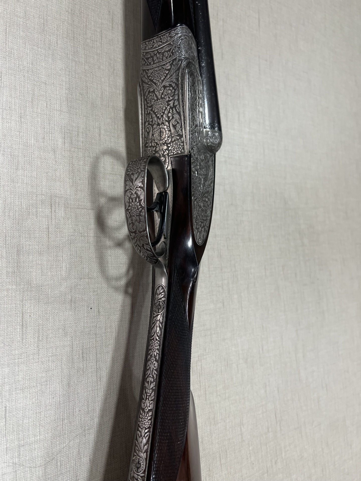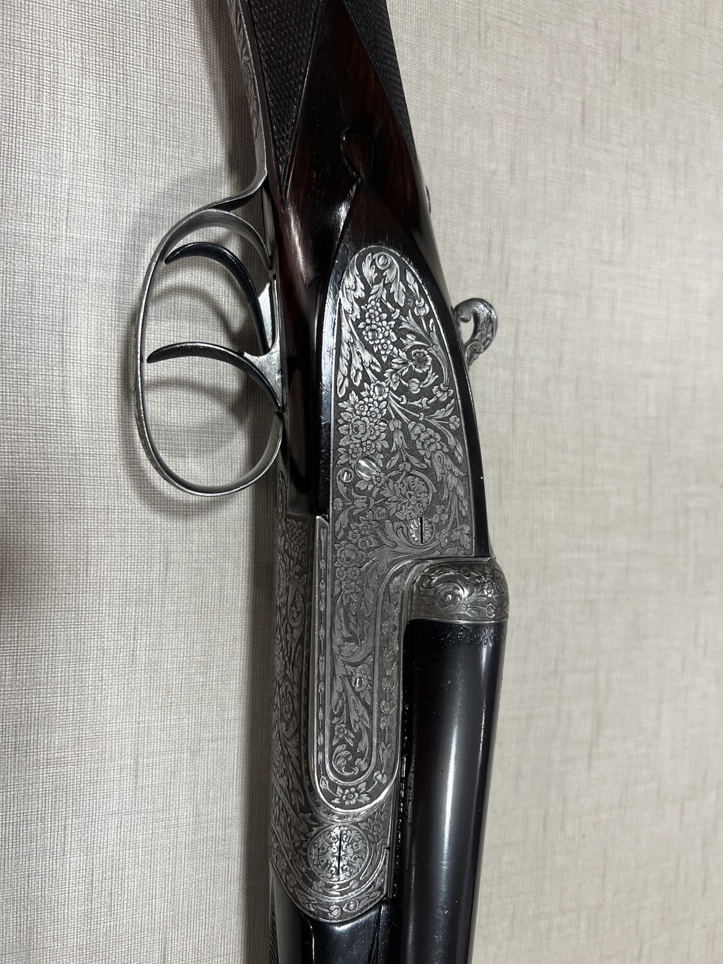 Espingarda de canos duplos com detalhes gravados e madeira escura