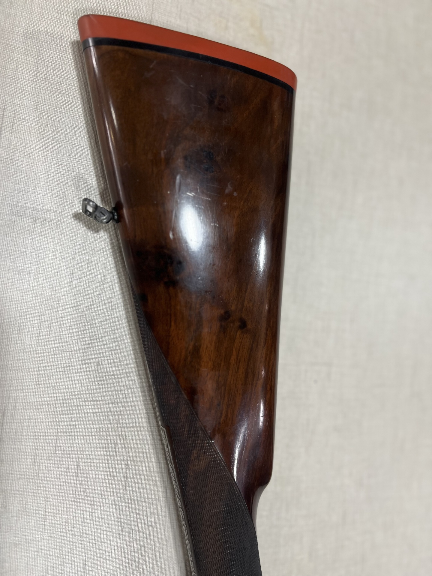 Parte traseira da coronha de espingarda em madeira castanha com calço vermelho