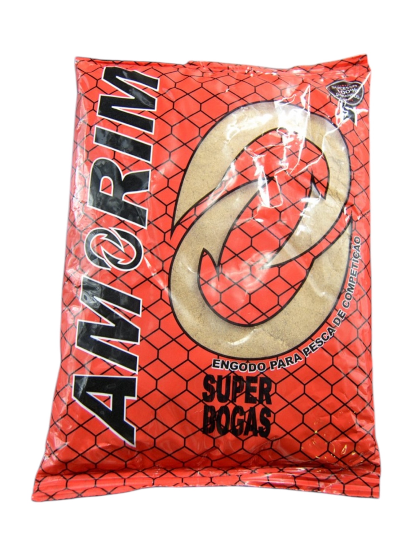 Embalagem vermelha para engodo de pesca com texto AMORIM e SUPER BOGAS