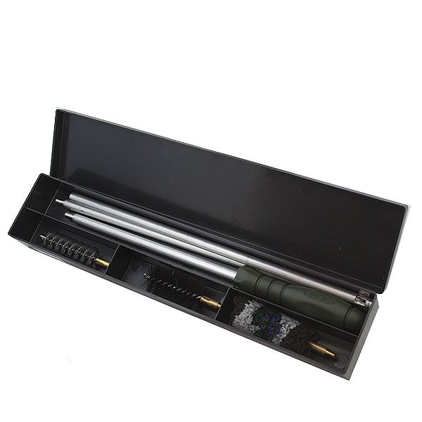 Conjunto de limpeza para armas com estojo preto e componentes metálicos e escovas