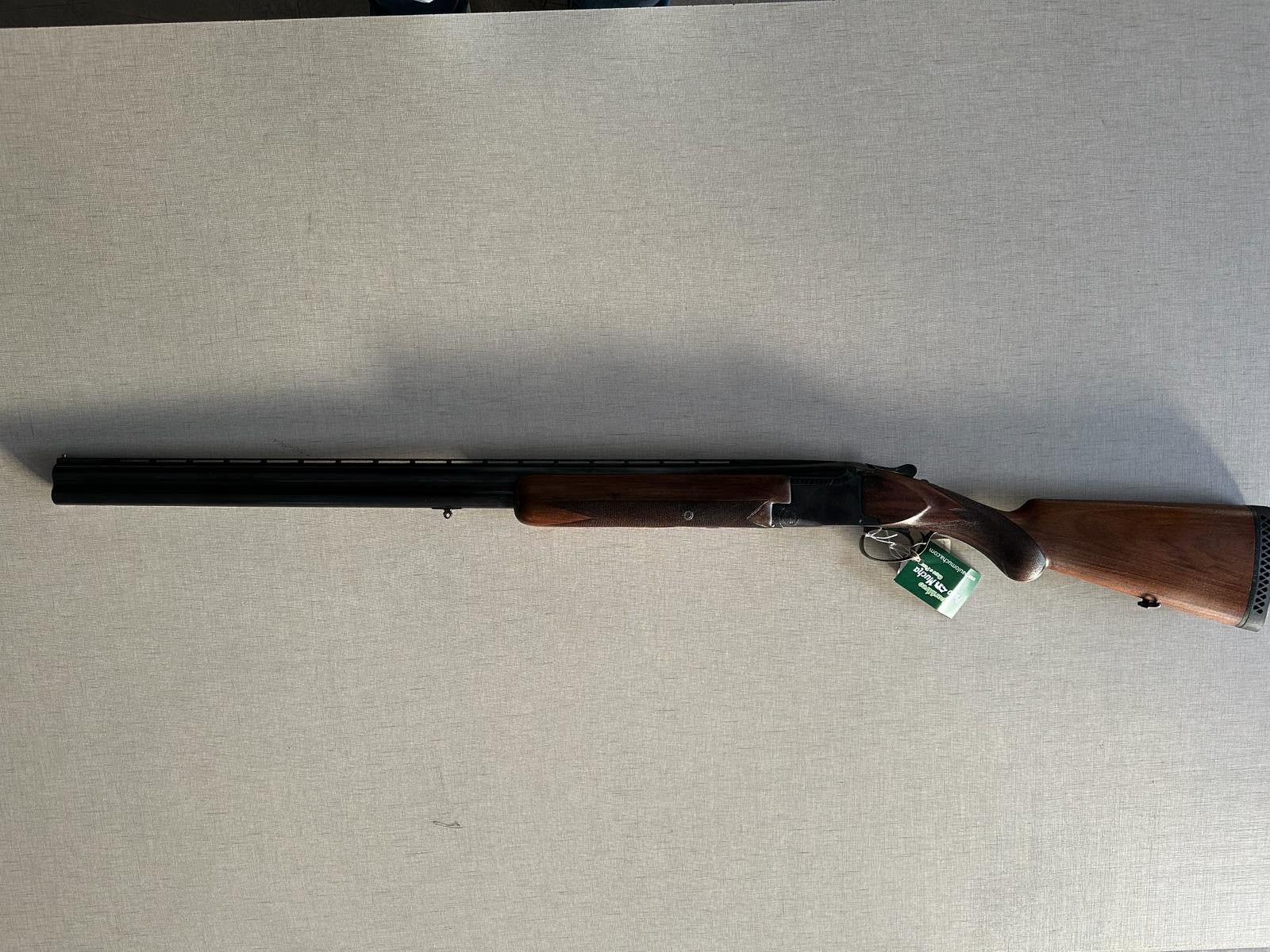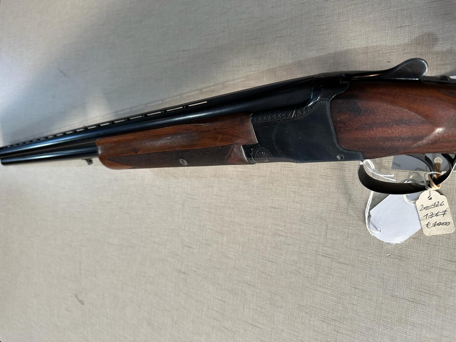 Espingarda de canos duplos com coronha de madeira e etiqueta branca pendurada