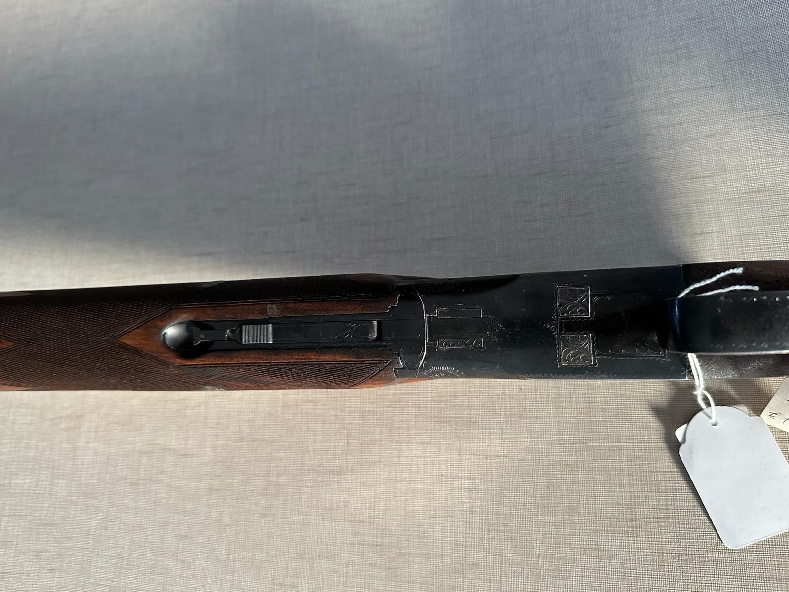 Espingarda de madeira escura e metal negro com etiqueta branca numa superfície clara