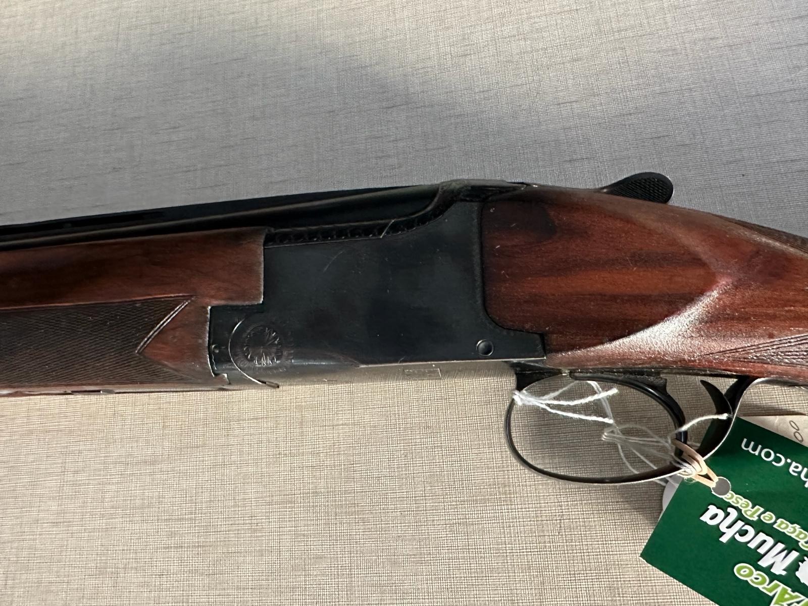Espingarda cano duplo madeira e metal com etiqueta pendurada
