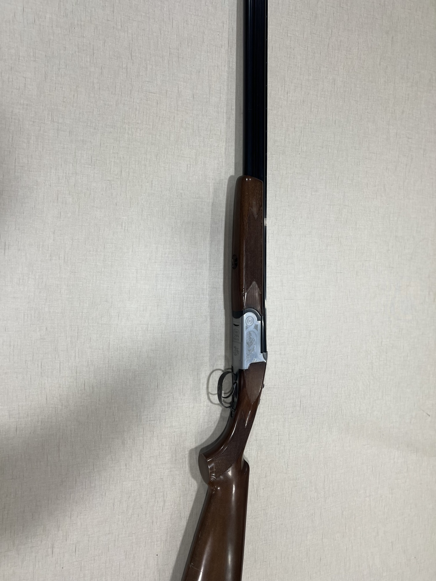 Espingarda de canos duplos com madeira castanha e canos pretos encostada a parede clara